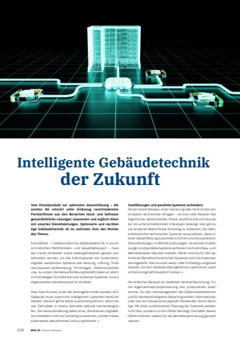 118 BEST OF BEST OF Portrait xxx Z%u00fcrcher UnterlandIntelligente Geb%u00e4udetechnik der ZukunftVom Einzelprodukt zur optimalen Gesamtl%u00f6sung %u2013 die soratas AG schn%u00fcrt unter Einbezug verschiedenster Partnerfi rmen aus den Bereichen Hard- und Software gesamtheitliche L%u00f6sungen zusammen und erg%u00e4nzt diese mit smarten Dienstleistungen. Optimierte und nachhaltige Geb%u00e4udetechnik ist im wahrsten Sinn des Wortes das Thema.Immobilien %u2013 insbesondere die Geb%u00e4udetechnik in durchschnittlichen Mehrfamilien- und Gewerbeh%u00e4usern %u2013 m%u00fcssen heute vernetzter sowie datengetriebener gebaut und betrieben werden, um die Informationen der zunehmend digitaler werdenden Systeme wie Heizung, L%u00fcftung, Trinkwarmwasser-Aufbereitung, PV-Anlagen, Elektromobilit%u00e4t, usw. zu nutzen. Die Herausforderung besteht dabei vor allem im fr%u00fchzeitigen Orchestrieren der einzelnen Systeme, um ein abgerundetes Gesamtsystem zu erhalten.Dazu Sven Kuonen, einer der Ideengeber hinter soratas: %u00abEin Geb%u00e4ude muss zuerst mit intelligenten Systemen best%u00fcckt werden. Danach gilt es diese zusammenzuf%u00fchren, damit sie wie Zahnr%u00e4der in einem Getriebe optimal ineinandergreifen. Die Herausforderung dabei ist es, die diversen digitalen Schnittstellen nicht nur fr%u00fchzeitig zu erkennen, sondern diese aufeinander abzustimmen und zu optimieren.%u00bb Insell%u00f6sungen und parallele Systeme verhindernOb bei einem Neubau, einer Sanierung oder beim Ersatz von einzelnen technischen Anlagen %u2013 es sind viele Parteien wie Eigent%u00fcmer, Gesamtleister, Planer, Ausf%u00fchrende und Verwalter mit unterschiedlichsten Interessen beteiligt. Hier gilt es, die einzelnen Bed%u00fcrfnisse fr%u00fchzeitig zu erkennen, die daf%u00fcr erforderlichen technischen Systeme auszuw%u00e4hlen, diese in einer Gesamtl%u00f6sung zusammenzuf%u00fchren und die passenden Dienstleistungen im Betrieb aufzuzeigen. So k%u00f6nnen Insell%u00f6sungen und parallele Systeme verhindert und somit Bau- und Betriebskosten reduziert werden. Weiter sind die f%u00fcr den optimierten Betrieb erforderlichen Systeme und Informationen bereitgestellt. Sven Kuonen weiss: %u00abWer fr%u00fchzeitig und gezielt handelt, um sein Geb%u00e4ude dahingehend zu optimieren, spart schnell einige zehntausend Franken.%u00bbAls einfaches Beispiel zur besseren Veranschaulichung: F%u00fcr die Eigenverbrauchsoptimierung des produzierten Solarstroms, f%u00fcr das Lastmanagement der Elektroladestationen und f%u00fcr das Nachhaltigkeits-Reporting werden Informationen %u00fcber den am Hausanschlusspunkt fliessenden Strom ben%u00f6tigt. Mit einer orchestrierten Planung der Systeme werden nicht drei, sondern nur ein Z%u00e4hler ben%u00f6tigt. Die Daten dieses Z%u00e4hlers k%u00f6nnen zudem f%u00fcr die Betriebsoptimierung genutzt werden.