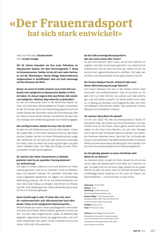 BEST OF BEST OF Promi 1212Text und Intervie Claudia HutterFoto: Gruber ImagesMit 23 Jahren beendete sie ihre erste Teilnahme an Olympischen Spielen mit dem hervorragenden 7. Rang im Strassenrennen. Seither ist sie mit noch mehr Vertrauen auf der %u00dcberholspur: Noemi R%u00fcegg, Radrennfahrerin, aufgewachsen in Sch%u00f6fflisdorf. Nun als Profi unterwegs auf den Strassen der Welt. Noemi, Du warst im letzten Sommer zum ersten Mal und bereits sehr erfolgreich an Olympischen Spielen in Paris mit dabei. Im Januar begann Dein sportliches Jahr wiederum erfolgreich. Welchen Sieg holtest Du in Australien? Es war ein fulminanter Start in die World-Tour-Saison f%u00fcr mich. Ich holte beim Jahresauftakt der Frauen in Australien an der Tour Down Under den Gesamtsieg, gewann auch die zweite Etappe der Rundfahrt sowie die Sprintwertung. Besser h%u00e4tte es kaum laufen k%u00f6nnen. Die Strecke mit dem steilen Anstieg in der zweiten Etappe kam mir wirklich entgegen. Wie wichtig ist dieser Auftakt ins neue Jahr f%u00fcr Dich? Es gibt mir viel Selbstvertrauen f%u00fcr die neue Saison. Schon der siebte Platz in Paris beim Strassenrennen an den Olympischen Spielen hat bei mir einen Motivationsschub ausgel%u00f6st. Seither bin ich mit noch viel mehr Vertrauen unterwegs. Ich weiss, dass ich diese Top-Leistung erbringen und ganz vorne mithalten kann. Ich habe den Erfolg mit dem Team und sp%u00e4ter mit der Familie gefeiert. Ihr seid bei sehr hohen Temperaturen in Adelaide gestartet. Hast Du ein spezielles Training absolviert zur Vorbereitung?Ich habe im Voraus w%u00e4hrend rund zwei Wochen ein Hitzetraining gemacht. Das ist ein aktueller Trend im Radrennsport und ziemlich intensiv. Mit mehreren Schichten Kleidung eingepackt absolvierte ich t%u00e4glich ein einst%u00fcndiges Rolltraining zuhause. Ziel ist es, die K%u00f6rpertemperatur auf %u00fcber 38,5 Grad Celsius zu bringen. Das f%u00f6rdert die Produktion der roten Blutk%u00f6rperchen. Diese Vorbereitung hat auch f%u00fcr Paris im Sommer geklappt. Deine Familie sagt in einer TV-Doku %u00fcber sich, dass Ihr %u00abradrennverr%u00fcckt%u00bb seid. Wie kommt das? Auch Dein Bruder Timon ist ein erfolgreicher Radrennsportler %u2026Meine Familie war schon immer sportbegeistert. Mein Vater ist fr%u00fcher als Amateur-Radrennfahrer gestartet und hat uns fr%u00fch mit dem Velo mitgenommen, sp%u00e4ter an Biketrainings begleitet. Irgendwann fuhren wir gegeneinander und nicht mehr miteinander. Nun wohnt Timon in Klosters und wir trainieren nicht mehr oft zusammen. Du bist 100-prozentige Berufssportlerin. War das schon immer Dein Traum?Es war nicht wirklich mein Traum, es hat sich vielmehr so ergeben. Ich habe immer Sport gemacht, nun mache ich es professionell. Als ich noch ein Kind war, stellte ich mir vor, einmal mein eigenes Restaurant zu er%u00f6ffnen. Ich habe meine Eltern und meine Br%u00fcder immer gerne bedient (lacht). Der Frauen-Radsport boomt. Entspricht dies auch Deiner Wahrnehmung als junge Fahrerin? Der Frauen-Radsport hat sich in den letzten Jahren stark entwickelt und professionalisiert. Das ist durchaus so. Es gibt nicht nur mehr Rennen, sie werden auch alle %u00fcbertragen, was sich positiv auswirkt. Ich denke jedoch nicht, dass wir in Bezug auf Strecken und Programme alles vom M%u00e4nner-Radsport %u00fcbernehmen sollten. Das w%u00fcrde den FrauenRadsport nicht attraktiver machen. F%u00fcr welches Team f%u00e4hrst Du aktuell?Ich bin seit 2024 Teil des US-amerikanischen Teams EF Education-Oatly. Wir haben auch ein M%u00e4nnerteam. Im Frauenteam sind wir 18 Frauen, davon gehen jeweils sechs bis sieben an den Start eines Rennens. Es war mein Management, das mir half, Teil dieses Teams zu werden. Nun stehen die Ardennen-Klassiker bevor, dann die Tour de Suisse der Frauen und schliesslich die Weltmeisterschaften in Ruanda. Afrika wird eine neue Herausforderung f%u00fcr mich werden. Ich bin noch nie auf dem afrikanischen Kontinent gefahren. Du bist gl%u00e4ubig, glaubst an einen christlichen Gott. Betest Du vor Rennen? Ja, meistens schon. Es gibt mir Ruhe. Zudem bin ich mir bewusst, dass der Radrennsport nicht alles ist in meinem Leben. Ich bete nicht nur um einen Sieg, sondern f%u00fcr ein gutes Rennen f%u00fcr alle. Ich weiss, dass ich auf Gott vertrauen kann, unabh%u00e4ngig meiner Leistung. Ich bin nicht nur Noemi, die Radrennfahrerin %u2013 ich bin wertvoll, so wie ich bin. Geburtstag: 19. April 2001Wohnort: Z%u00fcrichAusbildung: Fachfrau Betreuung, Fachrichtung BehindertenbetreuungGr%u00f6sste Erfolge: 7. Platz Strassenrennen Olympische Spiele 2024, Sieg in der World Tour mit der Tour Down Under Januar 2025Vorbilder: Wout van AertTeam: EF Education-Oatly In K%u00fcrze: Noemi R%u00fcegg ist eine Schweizer Radsportlerin, die sowohl im Strassenradsport als auch im Radquer aktiv ist. Wenn die Z%u00fcrcher Unterl%u00e4nderin nicht gerade Sport treibt, steht sie auch gerne in der K%u00fcche.%u00abDer Frauenradsport hat sich stark entwickelt%u00bb