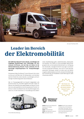 BEST OF BEST OFPortrait xxx Limmattal 1231Adresse: Renault Trucks (Schweiz) AGHeimstrasse 45, Postfach, 8953 Dietikon Telefon: +41 44 746 65 65E-Mail: sales.ch@renault-trucks.comWeb: www.renault-trucks.chIn K%u00fcrze: Renault Trucks verf%u00fcgt %u00fcber 33 St%u00fctzpunkte und Vertriebspartner in der Schweiz. Mit umwelt- und ressourcenschonenden Elektrofahrzeugen setzt sich das Unternehmen f%u00fcr eine nachhaltige Zukunft ein.Seit 1894 baut Renault Trucks robuste, zuverl%u00e4ssige und langlebige Nutzfahrzeuge (vom Lieferwagen bis zum schweren 40-T%u00f6nner), und seit %u00fcber 60 Jahren ist die Werksniederlassung Renault Trucks (Schweiz) AG die bevorzugte Ansprechpartnerin f%u00fcr Transport l%u00f6sungen aller Art. Schweizweit t%u00e4tig: Die Renault Trucks (Schweiz) AG ist dort, wo Sie auch sind! Bei %u00fcber 33 St%u00fctzpunkten und Vertriebspartnern fi nden Sie unsere robusten, zuver l%u00e4ssigen und hochwertigen Nutzfahrzeuge aller Gewichtsklassen.Wer im Transportgesch%u00e4ft die Zukunft mitgestalten will, kommt an einer CO%u00b2-neutralen Logistik nicht mehr vorbei. Im Rahmen der Dekarbonisierungsstrategie von Renault Trucks hat die kundenspezifi sche Ausrichtung oberste Priorit%u00e4t. Im Zentrum stehen die Bed%u00fcrfnisse des Nutzfahrzeugkunden, wenn es um den Entscheid zur Anschaffung eines elektri- Leader im Bereichder Elektromobilit%u00e4tDer neue E-Tech Master 2025E-Tech D Wide KehrichtfahrzeugWir freuen uns auf Ihren Besuch bei einem unserer Renault Trucks Partner!schen Nutzfahrzeugs geht: Ladeinfrastruktur, Reichweite und Nutzlast. Ihm stehen f%u00fcr seine jeweiligen Bed%u00fcrfnisse gut geschulte und kompetente Beraterteams zur Verf%u00fcgung, die individuelle, massgeschneiderte L%u00f6sungen zusammen mit der Kundschaft erarbeiten, was nicht nur den Kauf des passenden Fahrzeugs, sondern vor allem auch die Validierung des Ladekonzepts an sich (AC und/oder Schnellladung), die Finanzierung und Installation sowie Wartung der Ladeinfrastruktur betrifft.