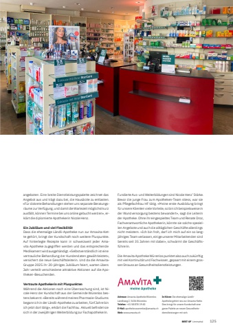 BEST OF BEST OFPortrait xxx Limmattal 1252Adresse: Amavita Apotheke W%u00fcrenlosL%u00e4ndliweg 2, 5436 W%u00fcrenlosTelefon: +41 58 878 19 40E-Mail: apotheke.wuerenlos@amavita.chWeb: www.amavita.chIn K%u00fcrze: Die ehemalige L%u00e4ndliApotheke geh%u00f6rt neu zur Amavita-Kette. Dies bringt f%u00fcr unsere Kundschaft eine ganze Palette an neuen Gesundheitsdienstleistungen mit sich.angeboten. Eine breite Dienstleistungspalette zeichnet das Angebot aus und tr%u00e4gt dazu bei, die Haus%u00e4rzte zu entlasten. %u00abF%u00fcr diskrete Behandlungen stehen uns separate Beratungsr%u00e4ume zur Verf%u00fcgung, und damit die Wartezeit m%u00f6glichst kurz ausf%u00e4llt, k%u00f6nnen Termine bei uns online gebucht werden%u00bb, erkl%u00e4rt die diplomierte Apothekerin Nicole Henz. Ein Jubil%u00e4um und viel Flexibilit%u00e4tDass die ehemalige L%u00e4ndli-Apotheke nun zur Amavita-Kette geh%u00f6rt, bringt der Kundschaft noch weitere Pluspunkte. Auf hinterlegte Rezepte kann in schweizweit jeder Amavita Apotheke zugegriffen werden und das entsprechende Medikament wird ausgeh%u00e4ndigt. %u00abSelbstverst%u00e4ndlich ist eine vertrauliche Behandlung der Kundendaten gew%u00e4hrleistet%u00bb, versichert die neue Gesch%u00e4ftsleiterin. Und da die AmavitaGruppe 2025 ihr 20-j%u00e4hriges Jubil%u00e4um feiert, warten %u00fcbers Jahr verteilt verschiedene attraktive Aktionen auf die Apotheken-Besuchenden.Vertraute Apothekerin mit PluspunktenW%u00e4hrend die Aktionen noch eine %u00dcberraschung sind, ist Nicole Henz der Kundschaft aus der Gemeinde W%u00fcrenlos bestens bekannt. %u00abBereits w%u00e4hrend meines Pharmazie-Studiums begann ich in der L%u00e4ndli-Apotheke zu arbeiten, f%u00fcnf Jahre bin ich jetzt dort t%u00e4tig%u00bb, erkl%u00e4rt die Fachfrau. Aktuell befi ndet sie sich in der zweij%u00e4hrigen Weiterbildung zur Fachapothekerin. Fundierte Aus- und Weiterbildungen sind Nicole Henz%u2019 St%u00e4rke. Bevor die junge Frau zum Apotheken-Team stiess, war sie als Pflegefachfrau HF t%u00e4tig. %u00abMeine erste Ausbildung bringt f%u00fcr unsere Klienten viele Vorteile, so bin ich beispielsweise in der Wundversorgung bestens bewandert%u00bb, sagt die Leiterin der Apotheke. Ohne ihr eingespieltes Team und Renate Droz, Fachverantwortliche Apothekerin, k%u00f6nnte sie solche speziellen Angebote und auch die allt%u00e4glichen Gesch%u00e4fte allerdings nicht meistern. %u00abIch bin froh, darf ich mich auf ein so langj%u00e4hriges Team verlassen, einige unserer Mitarbeitenden sind bereits seit 35 Jahren mit dabei%u00bb, schw%u00e4rmt die Gesch%u00e4ftsf%u00fchrerin. Die Amavita Apotheke W%u00fcrenlos punktet also auch zuk%u00fcnftig mit viel Kontinuit%u00e4t und Fachwissen, gepaart mit einem grossen Strauss an Gesundheitsdienstleistungen.