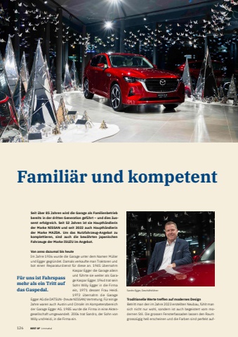 126 BEST OF Portrait xxxFamili%u00e4r und kompetentSeit %u00fcber 85 Jahren wird die Garage als Familienbetrieb bereits in der dritten Generation gef%u00fchrt %u2013 und dies %u00e4usserst erfolgreich. Seit 52 Jahren ist sie Haupth%u00e4ndlerin der Marke NISSAN und seit 2022 auch Haupth%u00e4ndlerin der Marke MAZDA. Um das Nutzfahrzeug-Angebot zu komplettieren, sind auch die bew%u00e4hrten japanischen Fahrzeuge der Marke ISUZU im Angebot.Von anno dazumal bis heuteIm Jahre 1936 wurde die Garage unter dem Namen M%u00fcller und Egger gegr%u00fcndet. Damals verkaufte man Traktoren und bot einen Reparaturdienst f%u00fcr diese an. 1945 %u00fcbernahm Kaspar Egger die Garage allein und f%u00fchrte sie weiter als Garage Kaspar Egger. 1964 trat sein Sohn Willy Egger in die Firma ein, 1971 dessen Frau Heidi. 1972 %u00fcbernahm die Garage Egger%u00a0AG die DATSUN- (heute NISSAN) Vertretung. F%u00fcr einige Jahre waren auch Austin und Citro%u00ebn im Kompetenzbereich der Garage Egger%u00a0AG. 1985 wurde die Firma in eine Aktengesellschaft umgewandelt. 2006 trat Sandro, der Sohn von Willy und Heidi, in die Firma ein. Sandro Egger, Gesch%u00e4ftsf%u00fchrerTraditionelle Werte treffen auf modernes DesignBetritt man den im Jahre 2023 erstellten Neubau, f%u00fchlt man sich nicht nur wohl, sondern ist auch begeistert vom modernen Stil. Die grossen Fensterfassaden lassen den Raum grossz%u00fcgig hell erscheinen und die Farben sind perfekt aufF%u00fcr uns ist Fahrspass mehr als ein Tritt auf das Gaspedal.BEST OF Limmattal