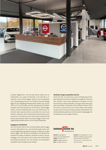BEST OF Portrait xxx 1272Adresse: Garage Egger AGZ%u00fcrcherstrasse 232, 8953 DietikonTelefon: +41 44 745 17 17E-Mail: info@egger-dietikon.chWeb: www.egger-dietikon.chIn K%u00fcrze: Die Garage Egger%u00a0AG mit ihren NISSAN und MAZDA Hauptvertretungen stehen f%u00fcr Vertrauen, Kompetenz und Kontinuit%u00e4t %u2013 und das schon in der dritten Generation.einander abgestimmt. %u00abVor ein paar Jahren haben wir uns entschieden, f%u00fcr unsere Kundschaft in die Zukunft zu investieren%u00bb, meint Sandro Egger. Herzlich wird man begr%u00fcsst und in Empfang genommen. Die Tatsache, dass die Garage Egger%u00a0AG auf langj%u00e4hrige Mitarbeitende z%u00e4hlen darf, spricht nicht nur f%u00fcr sich, sondern auch f%u00fcr eine gesunde Firmenphilosophie. Das Team besteht aus 24 Personen. Sandro Egger erkl%u00e4rt: %u00abUnsere Mitarbeitenden sind unser h%u00f6chste Gut, wir sind sehr stolz, dass sie schon so viele Jahre f%u00fcr und mit uns arbeiten.%u00bb Man sp%u00fcrt den Zusammenhalt untereinander, auch als Kund:in. So erstaunt es auch nicht weiter, dass auch die bereits pensionierten Eltern von Sandro Egger immer noch regelm%u00e4ssig vorbeikommen und wo n%u00f6tig mitanpacken. Engagierter LehrbetriebDurchschnittlich drei bis vier Lernende bilden Sandro Egger und sein Team j%u00e4hrlich aus. %u00abDie Anforderungen haben sich mit der Digitalisierung nat%u00fcrlich deutlich ver%u00e4ndert%u00bb, erkl%u00e4rt Sandro Egger. %u00abDie Technik ist komplexer und die Branche wandelt sich stetig.%u00bb Probleme, Lernende zu fi nden, hat Sandro Egger nicht. Das erstaunt nicht weiter, denn die famili%u00e4re Atmosph%u00e4re kombiniert mit viel Herzblut und Kompetenz sorgt daf%u00fcr, dass man gerne hier arbeitet.Autokauf mit ganz speziellem ServiceKauft man hier ein neues Auto, wird die Abholung auf eine ganz besonders sch%u00f6ne Art zelebriert und gefeiert. Das Auto wird n%u00e4mlich unter einem Abdecktuch versteckt und der Kunde darf es selbst enth%u00fcllen. Eine ganz tolle Idee ganz nach dem Motto: %u00abVorfreude ist die sch%u00f6nste Freude.%u00bb Sind Sie nicht nur auf der Suche nach einem Nissan oder Mazda, sondern auch nach einer vertrauensvollen, kompetenten und herzlichen Beratung? Dann sind Sie bei der Garage Egger%u00a0AG mit Garantie an der richtigen Adresse.BEST OF Limmattal