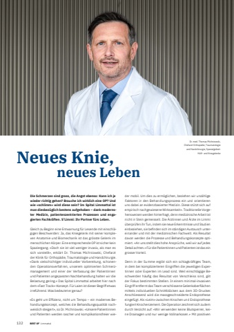 132 BEST OF BEST OF LimmattalDie Schmerzen sind gross, die Angst ebenso: Kann ich je wieder richtig gehen? Brauche ich wirklich eine OP? Und wie %u00abschlimm%u00bb wird diese sein? Im Spital Limmattal ist man diesbez%u00fcglich bestens aufgehoben %u2013 dank modernster Medizin, patientenzentrierten Prozessen und engagierten Fachkr%u00e4ften. S%u2019Limmi: Ihr Partner f%u00fcrs Leben.Gleich zu Beginn eine Entwarnung f%u00fcr Lesende mit einschl%u00e4gigen Beschwerden: Ja, das Kniegelenk mit seiner komplexen Anatomie und Biomechanik ist das gr%u00f6sste Gelenk im menschlichen K%u00f6rper. Eine entsprechende OP ist sicher kein Spaziergang. %u00abDoch sie ist viel weniger invasiv, als man es sich vorstellt%u00bb, erkl%u00e4rt Dr. Thomas Michniowski, Chefarzt der Klinik f%u00fcr Orthop%u00e4die, Traumatologie und Handchirurgie. %u00abDank vielschichtiger individueller Vorbereitung, schonenden Operationsverfahren, unserem optimierten Schmerzmanagement und einer der Verfassung der Patientinnen und Patienten angepassten Nachbehandlung halten wir die Belastung gering.%u00bb Das Spital Limmattal arbeitet hier nach dem %u00abFast Track%u00bb-Konzept. F%u00fcr Laien ist dieser Begriff etwas irref%u00fchrend. Was bedeutet er genau?%u00abEs geht um Effi zienz, nicht um Tempo %u2013 ein modernes Behandlungskonzept, welches die Behandlungsqualit%u00e4t nachweislich steigert%u00bb, so Dr. Michniowski. %u00abUnsere Patientinnen und Patienten werden rascher und komplikationsfreier wieNeues Knie, neues Leben der mobil. Um dies zu erm%u00f6glichen, beziehen wir unz%u00e4hlige Faktoren in den Behandlungsprozess ein und orientieren uns dabei an evidenzbasierter Medizin. Diese st%u00fctzt sich auf empirisch nachgewiesene Wirksamkeit%u00bb. Traditionelle Vorgehensweisen werden hinterfragt, denn medizinische Arbeit ist nicht in Stein gemeisselt. Die %u00c4rztinnen und %u00c4rzte im Limmi %u00fcberpr%u00fcfen ihr Tun, indem sie neue Erkenntnisse und Studien einbeziehen, sie befi nden sich im st%u00e4ndigen Austausch untereinander und mit der medizinischen Fachwelt. Als Resultat davon werden die Prozesse und Behandlungskonzepte optimiert. %u00abAn uns stellt dies hohe Anspr%u00fcche, weil wir auf jedes Detail achten.%u00bb F%u00fcr die Patientinnen und Patienten ist das ein grosser Vorteil. Denn in der Summe ergibt sich ein schlagkr%u00e4ftiges Team, in dem bei komplizierteren Eingriffen die jeweiligen Expertinnen oder Experten im Lead sind. Weil einschl%u00e4gige Beschwerden h%u00e4ufi g das Resultat von Verschleiss sind, gilt der Fokus bestimmten Stellen. In einem minimal-invasiven Eingriff entfernt das Team verschlissene Gelenkoberfl%u00e4chen mittels individuellen Schnittbl%u00f6cken aus dem 3D-Drucker. Anschliessend wird die massgeschneiderte Endoprothese eingef%u00fcgt. Als %u00abLeim%u00bb zwischen Knochen und Endoprothese fungiert Knochenzement. Die Operation zeichnet sich zudem durch Verzicht auf: %u00abWir verwenden keine Blutsperren, keine Drainagen und nur wenige Vollnarkosen.%u00bb Mit positiven Dr. med. Thomas Michniowski,Chefarzt Orthop%u00e4die, Traumatologie und Handchirurgie, Spezialgebiet: H%u00fcft- und Kniegelenke
