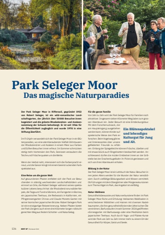 136 BEST OF Portrait xxxPark Seleger Moor Das magische NaturparadiesDer Park Seleger Moor in Rifferswil, gegr%u00fcndet 1953 von Robert Seleger, ist ein wild-romantischer Landschaftsgarten, der j%u00e4hrlich %u00fcber 50 000 Besucher:innen begeistert und die gr%u00f6sste Rhododendren- und Azaleensammlung der Schweiz beherbergt. Er ist seit 1966 f%u00fcr die %u00d6ffentlichkeit zug%u00e4nglich und wurde 1978 in eine Stiftung %u00fcberf%u00fchrt.Im Fr%u00fchjahr verwandelt sich der Park Seleger Moor in ein Bl%u00fctenparadies, wo eine atemberaubende Vielfalt Zehntausender Rhododendren und Azaleen in einem Meer aus Farben und D%u00fcften Besucher:innen erfreut. Im Sommer schm%u00fccken stetig mehr Hortensien den Park, Seerosen verzaubern die Teiche und Fr%u00f6sche quaken um die Wette. Wenn der Herbst naht, intensiviert sich die Farbenpracht erneut, und die Saison klingt mit einem beeindruckenden Farbspektakel aus.Eine Reise um die ganze WeltAuf gewundenen Pfaden entfaltet sich der Park vor Besuchenden in st%u00e4ndig wechselnden Landschaftsbildern und erinnert an Orte, die Robert Seleger w%u00e4hrend seines spektakul%u00e4ren Lebens besucht hat: die Rhododendron urw%u00e4lder Nepals, die Taiga und Tundra Sibiriens, ein Farngarten in Borneo, ein japanisches Teehaus, die Redwoods in Kalifornien, ein Pfi ngstrosengarten Chinas und Claude Monets Garten mit seiner ikonischen japanischen Br%u00fccke. Robert Selegers Park ist eine einzigartige Reiseerinnerung. Neben Pfaden bietet der Park %u00fcbrigens auch einen drei Kilometer langen rollstuhlgerechten Weg aus festem Schotter- und Naturbelag.F%u00fcr die ganze FamilieVon Jahr zu Jahr wird der Park Seleger Moor f%u00fcr Familien noch attraktiver. Insgesamt sieben Kilometer Weg laden zum grossen Abenteuer ein. Jeder Besuch ist eine Entdeckungstour. Mit dem Forscherrucksack, der am Haupteingang ausgeliehen werden kann, k%u00f6nnen Kinder auf spielerische Weise den Park erforschen. Beim Vogelweg gibt es viel Interessantes %u00fcber unsere gefi ederten Freunde zu erfahren. Entlang der Spiegelteiche k%u00f6nnen Fr%u00f6sche, Libellen und mit etwas Gl%u00fcck auch Ringelnattern beobachtet werden. Anschliessend d%u00fcrfen die m%u00fcden Entdecker:innen an der Grillstelle bei der Drachen kugelbahn ihr Picknick geniessen und sich von ihren Abenteuern erholen.Bildung in der NaturDer Park Seleger Moor ist ein Lehrbuch der Natur. Besucher:innen jeden Alters werden f%u00fcr die Wunder der Natur sensibilisiert. Durch vielf%u00e4ltige Bildungsarbeit wird Wissen vermittelt. Ob F%u00fchrungen mit dem Oberg%u00e4rtner oder Morgenexkursionen zum Thema V%u00f6gel im Park, das Angebot ist vielf%u00e4ltig.Natur-WellnessGesundheitsbewusste und Naturverbundene fi nden im Park Seleger Moor Ruhe und Erholung: Heilsames Waldbaden in verschiedenen W%u00e4ldchen und Hainen mit diversen Nadelbaumarten, die ihre gesundheitsf%u00f6rdernden %u00e4therischen %u00d6le verstr%u00f6men, Barfusslaufen im seit Sommer 2024 ge%u00f6ffneten %u00abSinnesgarten mit Barfussweg%u00bb oder eine Meditation beim japanischen Teehaus. Auch durch Yoga- und Pilates-Kurse wird der Park von Jahr zu Jahr immer mehr zu einem Ort der Gesundheit f%u00fcr K%u00f6rper, Geist und Seele. Ein Bl%u00fctenspektakel und lebendiges Kulturgut f%u00fcr Jung und Alt.BEST OF Knonauer Amt