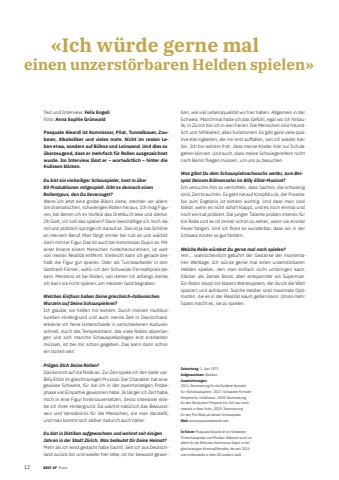 12 BEST OF BEST OF PromiText und Intervie Felix Engeli Foto: Anna Sophie Gr%u00fcnwaldPasquale Aleardi ist Kommissar, Pilot, Tunnelbauer, Zauberer, Alkoholiker und vieles mehr. Nicht im realen Leben etwa, sondern auf B%u00fchne und Leinwand. Und dies so %u00fcberzeugend, dass er mehrfach f%u00fcr Rollen ausgezeichnet wurde. Im Interview l%u00e4sst er %u2013 wortw%u00f6rtlich %u2013 hinter die Kulissen blicken.Du bist ein vielseitiger Schauspieler, hast in %u00fcber 80 Produktionen mitgespielt. Gibt es dennoch einen Rollentypus, den Du bevorzugst?Wenn ich jetzt eine grobe Bilanz ziehe, stechen vor allem die dramatischen, schwierigen Rollen heraus. Ich mag Figuren, bei denen ich im Vorfeld das Drehbuch lese und denke: Oh Gott, ich soll das spielen? Dann besch%u00e4ftige ich mich damit und pl%u00f6tzlich springe ich darauf an. Das ist ja das Sch%u00f6ne an meinem Beruf. Man f%u00e4ngt immer bei null an und w%u00e4chst dann mit der Figur. Das ist auch bei Kommissar Dupin so. Mit einer Knarre einem Menschen hinterherzurennen, ist weit von meiner Realit%u00e4t entfernt. Vielleicht kann ich gerade deshalb die Figur gut spielen. Oder als Tunnelarbeiter in den Gotthard-Filmen, wof%u00fcr ich den Schweizer Fernsehpreis bekam. Meistens ist bei Rollen, von denen ich anfangs denke, ich kann sie nicht spielen, am meisten Gold begraben.Welchen Einfluss haben Deine griechisch-italienischen Wurzeln auf Deine Schauspielerei?Ich glaube, sie helfen mir extrem. Durch meinen multikulturellen Hintergrund und auch meine Zeit in Deutschland erkenne ich feine Unterschiede in verschiedenen Kulturen schnell. Auch das Temperament, das viele Rollen abverlangen und sich manche Schauspielkollegen erst erarbeiten m%u00fcssen, ist bei mir schon gegeben. Das kann dann schon ein Vorteil sein.Pr%u00e4gen Dich Deine Rollen?Das kommt auf die Rolle an. Zur Zeit spiele ich den Vater von Billy Elliot im gleichnamigen Musical. Der Charakter hat eine gewisse Schwere, f%u00fcr die ich in der zweimonatigen Probephase viel Empathie gewonnen habe. Je l%u00e4nger ich Zeit habe, mich in eine Figur hineinzuversetzen, desto intensiver erlebe ich ihren Hintergrund. Da w%u00e4chst nat%u00fcrlich das Bewusstsein und Verst%u00e4ndnis f%u00fcr die Menschen, die man darstellt, und man kommt sich selber dadurch auch n%u00e4her.Du bist in Dietikon aufgewachsen und wohnst seit einigen Jahren in der Stadt Z%u00fcrich. Was bedeutet Dir Deine Heimat?Mehr als ich einst gedacht habe (lacht). Seit ich aus Deutschland zur%u00fcck bin und wieder hier lebe, ist mir bewusst geworden, wie viel Lebensqualit%u00e4t wir hier haben. Allgemein in der Schweiz. Manchmal habe ich das Gef%u00fchl, egal wo ich hinlaufe, in Z%u00fcrich bin ich in den Ferien. Die Menschen sind freundlich und hilfsbereit, alles funktioniert. Es gibt ganz viele positive Kleinigkeiten, die mir erst auffallen, seit ich wieder hier bin. Ich bin extrem froh, dass meine Kinder hier zur Schule gehen k%u00f6nnen. Und auch, dass meine Schwiegereltern nicht nach Berlin fliegen m%u00fcssen, um uns zu besuchen.Was gibst Du dem Schauspielnachwuchs weiter, zum Beispiel Deinem B%u00fchnensohn im Billy Elliot-Musical?Ich versuche ihm zu vermitteln, dass Sachen, die schwierig sind, Zeit brauchen. Es geht nie auf Knopfdruck, der Prozess bis zum Ergebnis ist extrem wichtig. Und dass man cool bleibt, wenn es nicht sofort klappt, und es noch einmal und noch einmal probiert. Die jungen Talente proben intensiv f%u00fcr die Rolle und es ist immer sch%u00f6n zu sehen, wenn sie einmal Feuer fangen. Und ich fi nde es wunderbar, dass wir in der Schweiz Kinder so gut f%u00f6rdern.Welche Rolle w%u00fcrdest Du gerne mal noch spielen?Hm %u2026 wahrscheinlich geb%u00fchrt der Gedanke der momentanen Weltlage. Ich w%u00fcrde gerne mal einen unzerst%u00f6rbaren Helden spielen, den man einfach nicht umbringen kann. St%u00e4rker als James Bond, aber entspannter als Superman. Ein Robin Hood mit klarem Wertesystem, der durch die Welt spaziert und aufr%u00e4umt. Solche Helden sind maximale Optimisten, die es in der Realit%u00e4t kaum geben kann. Umso mehr Spass macht es, sie zu spielen. Geburtstag: 1. Juni 1971Aufgewachsen: DietikonAuszeichnungen: 2011: Nominierung f%u00fcr die Goldene Nymphe f%u00fcr %u00abSchicksalsjahre%u00bb, 2017: Schweizer Fernsehfi lmpreis f%u00fcr %u00abGotthard%u00bb, 2020: Nominierung f%u00fcr den Deutschen Filmpreis f%u00fcr %u00abIch war noch niemals in New York%u00bb, 2025: Nominierung f%u00fcr den Prix Walo als bester SchauspielerWeb: www.pasqualealeardi.comIn K%u00fcrze: Pasquale Aleardi ist ein Schweizer Filmschauspieler und Musiker. Bekannt ist er vor allem f%u00fcr die Rolle des Kommissar Dupin in der gleichnamigen Kriminalfi lmreihe, die seit 2014 und mittlerweile in %u00fcber 40 L%u00e4ndern l%u00e4uft. %u00abIch w%u00fcrde gerne mal einen unzerst%u00f6rbaren Helden spielen%u00bb