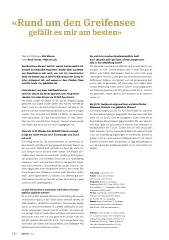 142 BEST OF BEST OF PromiText und Intervie Elio StammFoto: Ren%u00e9 Tanner / festhalter.chKomiker Manu Burkart erz%u00e4hlt, warum das bis weit in die Zukunft ausverkaufte Programm %u00abBucket List%u00bb das letzte von Divertimento sein wird, wie sich mit zunehmender Reife die Beziehung zu seinem B%u00fchnenpartner Jonny Fischer entspannt hat, und warum er dem Z%u00fcrcher Oberland bis heute treu geblieben ist.Manu Burkart, auf Eurer Abschiedstournee spielt Ihr aktuell die zweite Spielzeit Eures Programms %u00abBucket List%u00bb %u00fcber 40 mal vor 75 000 Zuschauern.Wir haben unsere Karrieren vor 26 Jahren v%u00f6llig blau%u00e4ugig gestartet. Aus Spass an der Sache. Und h%u00e4tten niemals gedacht, dass wir als Divertimento dereinst mit jedem Programm mehrere hunderttausend Leute zum Lachen bringen werden. Ich versuche den Erfolg im Stillen zu geniessen, nicht abzuheben, auf gut schweizerische Art halt (lacht). Aber wir sind uns durchaus bewusst, dass wir etwas ausgel%u00f6st haben, das es so vor uns noch nie gegeben hat.Wenn Ihr in 30 Minuten fast 100 000 Tickets verkauft, bringt das neben Freude auch Erwartungen und Druck mit sich?Ein wenig schon, ja. Die Leute kommen mit Vorfreude, haben Anrecht auf fi tte und gut gelaunte Komiker. Darum sagen wir einen Abend auch wirklich nur dann ab, wenn wir zum Beispiel keine Stimme mehr haben. Bei Fieber oder Magen-Darm beissen wir uns durch. Das bringt einen gewissen physischen und mentalen Druck mit sich. Gleichzeitig wissen wir, wenn wir eine Show schon x-mal gespielt haben, dass sie funktioniert. Darum empfi nde ich den Druck im Entstehungsprozess eines Programms defi nitiv schlimmer. Die Erwartungen des Publikums, wieder zwei Stunden Lacher nach Lacher garantieren zu k%u00f6nnen, und ebenso gut oder noch besser zu sein als bei der letzten Show k%u00f6nnen ganz sch%u00f6n an die Substanz gehen. Ist das mit ein Grund, warum Ihr nach dieser Tournee defi nitiv aufh%u00f6ren werdet?Es ist schon eine gewisse Themen-Ersch%u00f6pfung da in unserem Konstrukt als Duo. Wir haben schon ziemlich alle Musikstile parodiert, s%u00e4mtliche vorstellbaren Tanzeinlagen ausgepackt, so viele verschiedene Charaktere verk%u00f6rpert. Es wird immer schwieriger, neues Material zu fi nden. So haben wir uns gesagt, dass wir lieber dann aufh%u00f6ren, wenn es uns und den Leuten noch weh tut. Und ganz ist es ja noch nicht vorbei: Wir spielen %u00abBucket List%u00bb sicher noch einige Jahre lang, damit alle, die wollen, die Chance haben, uns ein letztes Mal gemeinsam auf der B%u00fchne zu sehen.Du und Jonny sind recht unterschiedlich, habt Euch oft aneinander gerieben, einmal fast getrennt. Wie ist Eure Beziehung heute?Mit jemanden mehrere Jahrzehnte lang so viel Zeit zu verbringen, ist nicht immer einfach. Wie in einer Ehe gibt es H%u00f6hen und Tiefen. Das Wissen, dass es nicht mehr ewig weiter geht, hilft uns sicher, gewisse zwischenmenschlichen Differenzen lockerer zu nehmen und die gemeinsame Zeit umso mehr zu geniessen. Ich muss aber auch sagen, dass unsere Beziehung in den letzten Jahren unabh%u00e4ngig davon entspannter geworden ist. Wir gehen auf die 50 zu, sind reifer geworden, haben gelernt, den anderen so zu nehmen, wie er ist. Du bist in Greifensee aufgewachsen und dem Z%u00fcrcher Oberland bis heute treu geblieben. Warum?Stimmt nicht ganz (lacht). F%u00fcr f%u00fcnf Jahre habe ich w%u00e4hrend der Lehrerausbildung in Zug gelebt. Das war eine tolle Zeit, ohne die ich Jonny nicht kennengelernt h%u00e4tte, ohne die es kein Cabaret Divertimento gegeben h%u00e4tte. Mir war aber immer klar, dass ich zur%u00fcckkehren m%u00f6chte. Das Oberland ist landschaftlich ein Traum. Zudem bin ich hier verwurzelt, habe Freunde, Familie, meine Rock-Band. So habe ich direkt nach der Ausbildung angefangen, in Niederuster Schule zu geben. Nach ein paar weiteren Stationen bin ich mit meiner Familie in einem alten Bauernhaus in Egg sesshaft geworden. Rund um den Greifensee gef%u00e4llt es mir halt einfach am besten.Geburtstag: 1. November 1977Familie: verheiratet mit Mich%u00e8le, Vater von Alya, Josh und JoanProgramme: Bucket List (seit 2023), Sabbatical (2016-2021), Gate 10 (2012-2015), Plan B (2008-2011), ZuvieliSation (2005-2008), Kultimulturell (2002-2005)TV-Star: regelm%u00e4ssiger Gast bei %u00abSRF bi de L%u00fct%u00bb-Formaten wie H%u00fcttengeschichten Spezial, Ein Manu f%u00fcr alle F%u00e4lle, Happy DayPassion: fr%u00fcher Fussball beim FC Greifensee, immer noch Metal mit seiner Band Buddies, Beer & Rock n%u2019 Roll (www.bbrmusic.ch)In K%u00fcrze: An Auftrittstagen ist f%u00fcr Manu Burkart bis 16.30 Uhr B%u00fcroarbeit oder Kinderbetreuung angesagt. Dann folgen Anfahrt zum Show-Ort, Soundcheck (17.30 Uhr), Znacht, Treffen mit Fans oder Sponsoren und Auftritt (20 Uhr). Um Mitternacht ist er wieder zuhause.%u00abRund um den Greifensee gef%u00e4llt es mir am besten%u00bb