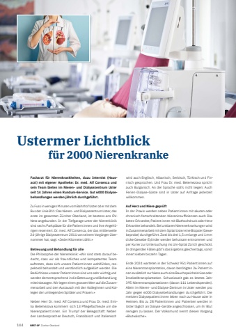 144 BEST OF Portrait xxxUstermer Lichtblick f%u00fcr 2000 NierenkrankeFacharzt f%u00fcr Nierenkrankheiten, dazu Internist (Hausarzt) mit eigener Apotheke: Dr. med. Alf Corsenca und sein Team bieten im Nieren- und Dialysezentrum Uster seit 14 Jahren einen Rundum-Service. Gut 6000 Dialysebehandlungen werden j%u00e4hrlich durchgef%u00fchrt.Zu Fuss in wenigen Minuten vom Bahnhof Uster oder mit dem Bus der Linie 811: Das Nieren- und Dialysezentrum Uster, das erste im gesamten Z%u00fcrcher Oberland, ist bestens ans %u00d6VNetz angebunden. In der Tiefgarage unter der Nierenklinik sind sechs Parkpl%u00e4tze f%u00fcr die Patient:innen und ihre Angeh%u00f6rigen reserviert. Dr. med. Alf Corsenca, der das mittlerweile 24-j%u00e4hrige Dialysezentrum 2011 von seinem Vorg%u00e4nger %u00fcbernommen hat, sagt: %u00abJeder Kilometer z%u00e4hlt.%u00bbBetreuung und Behandlung f%u00fcr alleDie Philosophie der Nierenklinik: %u00abWir sind stets darauf bedacht, dass wir als freundliches und kompetentes Team auftreten, dass sich unsere Patient:innen wohlf%u00fchlen, respektvoll behandelt und verst%u00e4ndlich aufgekl%u00e4rt werden. Die Bed%u00fcrfnisse unserer Patient:innen sind uns sehr wichtig und werden dementsprechend in die Betreuung und Behandlung miteinbezogen. Wir legen einen grossen Wert auf die Zusammenarbeit und den Austausch mit den Kolleginnen und Kollegen der umliegenden Spit%u00e4ler und Praxen.%u00bbNeben Herr Dr. med. Alf Corsenca und Frau Dr. med. Emilia Belemezova k%u00fcmmern sich 13 Pflegefachleute um die Nierenpatient:innen. Ein Trumpf der Belegschaft: Neben den Landessprachen Deutsch, Franz%u00f6sisch und Italienisch wird auch Englisch, Albanisch, Serbisch, T%u00fcrkisch und Finnisch gesprochen. Und Frau Dr. med. Belemezova spricht auch Bulgarisch. An der Sprache soll%u2019s nicht liegen: Auch Ferien-Dialyse-G%u00e4ste sind in Uster auf Anfrage jederzeit willkommen.Auf Herz und Niere gepr%u00fcftIn der Praxis werden neben Patient:innen mit akuten oder chronisch fortschreitenden Niereninsuffi zienzen auch Diabetes-Erkrankte, Patient:innen mit Bluthochdruck oder HerzErkrankte behandelt. Bei unklaren Nierenerkrankungen wird in Zusammenarbeit mit dem Spital Uster eine Biopsie (Gewebeprobe) durchgef%u00fchrt. Zwei bis drei 1,5 cm lange und 1 mm dicke Gewebe-Zylinder werden behutsam entnommen und per Kurier zur Untersuchung ins Uni-Spital Z%u00fcrich geschickt. In dringenden F%u00e4llen gibt%u2019s das Ergebnis gleichentags, sonst innert sieben bis zehn Tagen.Ende 2024 warteten in der Schweiz 951 Patient:innen auf eine Nierentransplantation, davon ben%u00f6tigten 26 Patient:innen zus%u00e4tzlich zur Niere auch eine Bauchspeicheldr%u00fcse oder Inselzelltransplantation. Schweizweit gab es letztes Jahr 395%u00a0Nierentransplantationen (davon 111 Lebendspenden). Allein im Nieren- und Dialyse-Zentrum in Uster werden pro Jahr gegen 6000%u00a0Dialysebehandlungen durchgef%u00fchrt. Die meisten Dialysepatient:innen leben noch zu Hause oder in Heimen. Bis zu 28%u00a0Patientinnen und Patienten werden in Uster t%u00e4glich an Dialyse-Ger%u00e4te angeschlossen, um ihr Blut reinigen zu lassen. Der Volksmund nennt diesen Vorgang %u00abBlutw%u00e4sche%u00bb.BEST OF Z%u00fcrcher Oberland