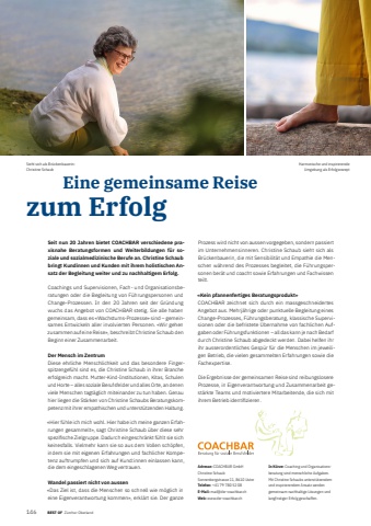 146 BEST OF BEST OF Portrait xxx Z%u00fcrcher Oberland Eine gemeinsame Reisezum ErfolgAdresse: COACHBAR GmbHChristine SchaubSonnenbergstrasse 11, 8610 UsterTelefon: +41 79 780 52 08E-Mail: mail@die-coachbar.chWeb: www.die-coachbar.chIn K%u00fcrze: Coaching und Organisationsberatung sind menschliche Aufgaben. Mit Christine Schaubs unterst%u00fctzendem und inspirierendem Ansatz werden gemeinsam nachhaltige L%u00f6sungen und langfristiger Erfolg geschaffen.Seit nun 20 Jahren bietet COACHBAR verschiedene praxisnahe Beratungsformen und Weiterbildungen f%u00fcr soziale und sozialmedizinische Berufe an. Christine Schaub bringt Kundinnen und Kunden mit ihrem holistischen Ansatz der Begleitung weiter und zu nachhaltigem Erfolg.Coachings und Supervisionen, Fach- und Organisationsberatungen oder die Begleitung von F%u00fchrungspersonen und Change-Prozessen. In den 20 Jahren seit der Gr%u00fcndung wuchs das Angebot von COACHBAR stetig. Sie alle haben gemeinsam, dass es %u00abWachstums-Prozesse%u00bb sind %u2013 gemeinsames Entwickeln aller involvierten Personen. %u00abWir gehen zusammen auf eine Reise%u00bb, beschreibt Christine Schaub den Beginn einer Zusammenarbeit.Der Mensch im ZentrumDiese ehrliche Menschlichkeit und das besondere Fingerspitzengef%u00fchl sind es, die Christine Schaub in ihrer Branche erfolgreich macht. Mutter-Kind-Institutionen, Kitas, Schulen und Horte %u2013 alles soziale Berufsfelder und alles Orte, an denen viele Menschen tagt%u00e4glich miteinander zu tun haben. Genau hier liegen die St%u00e4rken von Christine Schaubs Beratungskompetenz mit ihrer empathischen und unterst%u00fctzenden Haltung.%u00abHier f%u00fchle ich mich wohl. Hier habe ich meine ganzen Erfahrungen gesammelt%u00bb, sagt Christine Schaub %u00fcber diese sehr spezifi sche Zielgruppe. Dadurch eingeschr%u00e4nkt f%u00fchlt sie sich keinesfalls. Vielmehr kann sie so aus dem Vollen sch%u00f6pfen, indem sie mit eigenen Erfahrungen und fachlicher Kompetenz auftrumpfen und sich auf Kund:innen einlassen kann, die dem eingeschlagenen Weg vertrauen.Wandel passiert nicht von aussen%u00abDas Ziel ist, dass die Menschen so schnell wie m%u00f6glich in eine Eigenverantwortung kommen%u00bb, erkl%u00e4rt sie. Der ganze Prozess wird nicht von aussen vorgegeben, sondern passiert im Unternehmensinneren. Christine Schaub sieht sich als Br%u00fcckenbauerin, die mit Sensibilit%u00e4t und Empathie die Menschen w%u00e4hrend des Prozesses begleitet, die F%u00fchrungspersonen ber%u00e4t und coacht sowie Erfahrungen und Fachwissen teilt. %u00abKein pfannenfertiges Beratungsprodukt%u00bbCOACHBAR zeichnet sich durch ein massgeschneidertes Angebot aus. Mehrj%u00e4hrige oder punktuelle Begleitung eines Change-Prozesses, F%u00fchrungsberatung, klassische Supervisionen oder die befristete %u00dcbernahme von fachlichen Aufgaben oder F%u00fchrungsfunktionen %u2013 all das kann je nach Bedarf durch Christine Schaub abgedeckt werden. Dabei helfen ihr ihr ausserordentliches Gesp%u00fcr f%u00fcr die Menschen im jeweiligen Betrieb, die vielen gesammelten Erfahrungen sowie die Fachexpertise.Die Ergebnisse der gemeinsamen Reise sind reibungslosere Prozesse, in Eigenverantwortung und Zusammenarbeit gest%u00e4rkte Teams und motiviertere Mitarbeitende, die sich mit ihrem Betrieb identifi zieren. Harmonische und inspirierende Umgebung als ErfolgsrezeptSieht sich als Br%u00fcckenbauerin:Christine Schaub