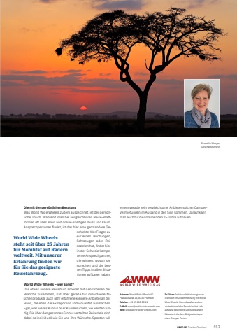 BEST OFBEST OF Z%u00fcrcher Oberland Portrait xxx 1532Adresse: World Wide Wheels AGPilatusstrasse 16, 8330 Pf%u00e4ffi konTelefon: +41 55 210 00 11E-Mail: www@world-wide-wheels.comWeb: www.world-wide-wheels.comIn K%u00fcrze: Individualit%u00e4t ist ein grosses Stichwort im Zusammenhang mit World Wide Wheels. Denn das alles andere als herk%u00f6mmliche Reiseb%u00fcro hat sich auf ganz besondere Dienstleistungen fokussiert, die dem Zeitgeist entsprechen: Camper-Ferien.Die mit der pers%u00f6nlichen BeratungWas World Wide Wheels zudem auszeichnet, ist der pers%u00f6nliche Touch. W%u00e4hrend man bei vergleichbaren Reise-Plattformen oft alles allein und online erledigen muss und kaum Ansprechpersonen fi ndet, ist das hier eine ganz andere Geschichte. Wer Fragen zu einzelnen Buchungen, Fahrzeugen oder Reisezielen hat, fi ndet hier in der Schweiz kompetente Ansprechpartner, die wissen, wovon sie sprechen und die besten Tipps in allen Situationen auf Lager haben.World Wide Wheels %u2013 wer sonst?Das etwas andere Reiseb%u00fcro arbeitet mit den Grossen der Branche zusammen, hat aber gerade f%u00fcr individuelle Nischenprodukte auch sehr erfahrene kleinere Anbieter an der Hand, die eben die Extraportion Individualit%u00e4t ausmachen. Egal, was Sie als Kundin oder Kunde suchen, Sie werden f%u00fcndig. Die %u00fcber den gesamten Globus verteilten Reiseziele sind dabei so individuell wie Sie und Ihre W%u00fcnsche. Spontan will World Wide Wheels steht seit %u00fcber 25%u00a0Jahren f%u00fcr Mobilit%u00e4t auf R%u00e4dern weltweit. Mit unserer Erfahrung fi nden wir f%u00fcr Sie das geeignete Reisefahrzeug.einem gerade kein vergleichbarer Anbieter solcher CamperVermietungen im Ausland in den Sinn kommen. Darauf kann man auch f%u00fcr die kommenden 25%u00a0Jahre aufbauen.Franziska Wenger, Gesch%u00e4ftsf%u00fchrerin