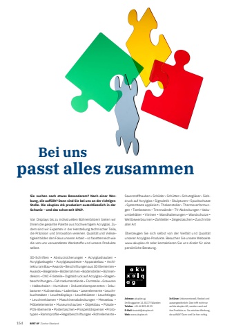 154 BEST OF BEST OF Portrait xxx Z%u00fcrcher OberlandAdresse: akuplex agIm Bruggacher 14, 8117 F%u00e4llandenTelefon: +41 44 825 45 25E-Mail: kontakt@akuplex.chWeb: www.akuplex.chIn K%u00fcrze: Unkonventionell, flexibel und aussergew%u00f6hnlich: Dies trifft nicht nur auf die akuplex AG, sondern auch auf ihre Produkte zu. Sie m%u00f6chten Werbung, die auff%u00e4llt? Dann sind Sie hier richtig. Sie suchen nach etwas Besonderem? Nach einer Werbung, die auff%u00e4llt? Dann sind Sie bei uns an der richtigen Stelle. Die akuplex AG produziert ausschliesslich in der Schweiz %u2013 und das schon seit 1969. Von Displays bis zu individuellen B%u00fchnenbildern bieten wir Ihnen die gesamte Palette aus hochwertigem Acrylglas. Zudem sind wir Experten in der Herstellung technischer Teile, die Pr%u00e4zision und Innovation vereinen. Qualit%u00e4t und Vielseitigkeit bilden den Fokus unserer Arbeit %u2013 so facettenreich wie die von uns verwendeten Werkstoffe und unsere Produkte selbst.%u00dcberzeugen Sie sich selbst von der Vielfalt und Qualit%u00e4t unserer Acrylglas-Produkte. Besuchen Sie unsere Webseite www.akuplex.ch oder kontaktieren Sie uns direkt f%u00fcr eine pers%u00f6nliche Beratung.3D-Schriften %u2022 Absturzsicherungen %u2022 Acrylglashauben %u2022 Acryl glaskugeln %u2022 Acrylglaspodeste %u2022 Apparatebau %u2022 Architektur am Bau %u2022 Awards %u2022 Beschriftungen aus 3D Elementen %u2022 Awards %u2022 Biegeteile %u2022 Bilderrahmen %u2022 Bodensteller %u2022 B%u00fchnendekors %u2022 CNC-Fr%u00e4steile %u2022 Digitaldruck auf Acrylglas %u2022 Etagenbeschriftungen %u2022 Fahrradunterst%u00e4nde %u2022 Formteile %u2022 Gravuren %u2022 Halbschalen %u2022 Humidore %u2022 Industriekomponenten %u2022 Inkubatoren %u2022 Kulissenbau %u2022 Ladenbau %u2022 Laserelemente %u2022 Leuchtbuchstaben %u2022 Leuchtdisplays %u2022 Leuchtk%u00e4sten %u2022 Leuchtlogos %u2022 Leuchtreklamen %u2022 Maschinenabdeckungen %u2022 Messebau %u2022 M%u00f6belelemente %u2022 Museumshauben %u2022 Objektbau %u2022 Pokale %u2022 POS-Elemente %u2022 Postertaschen %u2022 Prospektdispenser %u2022 Prototypen %u2022 Rammprofi le %u2022 Regalbeschriftungen %u2022 Rohrelemente %u2022 Sauerstoffhauben %u2022 Schilder %u2022 Sch%u00fctten %u2022 Schutzgl%u00e4ser %u2022 Siebdruck auf Acrylglas %u2022 Signaletik %u2022 Skulpturen %u2022 Spuckschutze %u2022 Systemtexte appliziert %u2022 Thekensteller %u2022 Thermoverformungen %u2022 Tombstones %u2022 Trennw%u00e4nde %u2022 TV-Abdeckungen %u2022 Vakuumbeh%u00e4lter %u2022 Vitrinen %u2022 Wandhalterungen %u2022 Wandschutze %u2022 Wett bewerbsurnen %u2022 Zahlteller %u2022 Zeigestaschen %u2022 Zuschnitte aller Art Bei uns passt alles zusammen