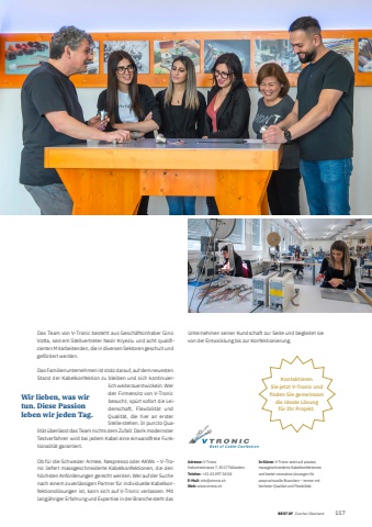 BEST OFBEST OF Z%u00fcrcher Oberland Portrait xxx 1572Adresse: V-TronicIndustriestrasse 7, 8117 F%u00e4llandenTelefon: +41 43 497 04 04E-Mail: info@vtronic.chWeb: www.vtronic.chIn K%u00fcrze: V-Tronic setzt auf pr%u00e4zise, massgeschneiderte Kabelkonfektionen und bietet innovative L%u00f6sungen f%u00fcr anspruchsvolle Branchen %u2013 immer mit h%u00f6chster Qualit%u00e4t und Flexibilit%u00e4t.Das Team von V-Tronic besteht aus Gesch%u00e4ftsinhaber Gino Votta, seinem Stellvertreter Nezir Kryeziu und acht qualifi -zierten Mitarbeitenden, die in diversen Sektoren geschult und gef%u00f6rdert werden.Das Familienunternehmen ist stolz darauf, auf dem neuesten Stand der Kabelkonfektion zu bleiben und sich kontinuierlich weiterzuentwickeln. Wer den Firmensitz von V-Tronic besucht, sp%u00fcrt sofort die Leidenschaft, Flexibilit%u00e4t und Qualit%u00e4t, die hier an erster Stelle stehen. In puncto Qualit%u00e4t %u00fcberl%u00e4sst das Team nichts dem Zufall: Dank modernster Testverfahren wird bei jedem Kabel eine einwandfreie Funktionalit%u00e4t garantiert.Ob f%u00fcr die Schweizer Armee, Nespresso oder AKWs %u2013 V-Tronic liefert massgeschneiderte Kabelkonfektionen, die den h%u00f6chsten Anforderungen gerecht werden. Wer auf der Suche nach einem zuverl%u00e4ssigen Partner f%u00fcr individuelle Kabelkonfektionsl%u00f6sungen ist, kann sich auf V-Tronic verlassen. Mit langj%u00e4hriger Erfahrung und Expertise in der Branche steht das Kontaktieren Sie jetzt V-Tronic und fi nden Sie gemeinsam die ideale L%u00f6sung f%u00fcr Ihr Projekt.Wir lieben, was wir tun. Diese Passion leben wir jeden Tag.Unternehmen seiner Kundschaft zur Seite und begleitet sie von der Entwicklung bis zur Konfektionierung.