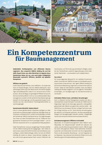 14 BEST OF Portrait xxxEin Kompetenzzentrum f%u00fcr BaumanagementGeb%u00fcndelte Fachkompetenz und effi zientes Baumanagement. Das verspricht ONE24 Holding AG und hat daf%u00fcr Expert:innen aus allen Bereichen im eigenen Haus. Gemeinsam leben sie vor, was auch jedes erfolgreiche Bauprojekt ausmacht: Effi zienz, Qualit%u00e4t und geballte Kompetenz.Effi zienz neu gedacht%u00abViele Generalunternehmen sind ineffi zient.%u00bb So lautet das Fazit von Roland Borges, CEO der ONE24 Holding AG, nach jahrelanger Erfahrung in der Baubranche. Mit seinen langj%u00e4hrigen Gesch%u00e4ftspartnern setzt er nun auf eine neue Firmenstruktur, die kurze Wege und gesteigerte Effi zienz verspricht. Die Kundschaft profi tiert nicht nur von professionellem Baumanagement, sondern erh%u00e4lt s%u00e4mtliche Dienstleistungen geb%u00fcndelt: Ein Anruf gen%u00fcgt, und die passenden Expert:innen werden aus den verschiedenen Tochtergesellschaften zusammengezogen.Gemeinsame Identit%u00e4t, lokales Kolorit%u00abDurch unsere gemeinsamen Standorte verf%u00fcgen wir %u00fcber kurze Kommunikationswege und k%u00f6nnen Auftr%u00e4ge direkt vor Ort planen und besprechen%u00bb, erkl%u00e4rt Carolina Borges und hebt die Vorteile der ONE24-Standorte hervor. Die regelm%u00e4ssigen Jour fi xes mit allen Partnerfi rmen sind ein Treffpunkt ausgewiesener Fachleute auf ihrem jeweiligen Gebiet %u2013 vom erfahrenen Gutachter bis hin zur spezialisierten Bauphysikerin.Viele Tochterfi rmen sind aus langj%u00e4hrigen Partnerschaften mit der ONE24 Holding AG hervorgegangen. %u00abWir haben erkannt, dass unsere Partnerfi rmen %u00fcber wertvolle Ressourcen verf%u00fcgen%u00bb, erkl%u00e4rt Roland Borges. Daher hat sich die ONE24 Holding AG direkt an diesen Unternehmen beteiligt und sie unter einem gemeinsamen Dach vereint. W%u00e4hrend die Koordination und Terminierung zentralisiert erfolgen, arbeiten die Tochterfi rmen weiterhin eigenst%u00e4ndig an ihren etablierten Standorten %u2013 und bewahren so ihr lokales Kolorit.Von A bis ZEin herausragendes Beispiel f%u00fcr die nahtlose Zusammenarbeit innerhalb der ONE24-Gruppe ist die Bauleitung f%u00fcr renommierte Unternehmen. Hier agiert ONE24 Holding AG als klassische Bauleitung, organisiert und koordiniert externe Firmen. Sollte ein Dienstleister ausfallen, kann die ONE24 Holding AG flexibel reagieren und mit eigenen Fachkr%u00e4ften einspringen, um Verz%u00f6gerungen f%u00fcr die Bauherrschaft zu vermeiden.Zufriedene Mieter:innen, zufriedene VerwaltungenAuch im Bereich Facility Management erweist sich das interdisziplin%u00e4re Zusammenspiel innerhalb der ONE24 als Erfolgsrezept: Egal ob die Heizungen gewartet, L%u00fcftungsfi lter gewechselt oder W%u00e4nde neu gestrichen werden sollen %u2013 die ONE24 hat innert k%u00fcrzester Zeit den richtigen Fachmann oder die richtige Fachfrau vor Ort. Somit k%u00f6nnen Verwaltungswege verk%u00fcrzt und Prozesse optimiert, die Servicequalit%u00e4t gesteigert und Verz%u00f6gerungen reduziert werden. Langj%u00e4hrige Kund:innen schw%u00f6ren bereits heute auf diese Struktur.Schadensmanagement: Effi zienz im ErnstfallBesonders im Schadensmanagement setzt ONE24 neue Massst%u00e4be. Ein Wasserschaden betrifft oft mehrere Gewerke, was die Abwicklung kompliziert macht. ONE24 sorgt f%u00fcr einen reibungslosen Ablauf: Statt zahlreicher einzelner Gutachter und Handwerker k%u00fcmmert sich ein eingespieltes Team um die komplette Abwicklung %u2013 von der Diagnose bis zur Reparatur. Das reduziert den Stress f%u00fcr Mieter:innen und beschleunigt die Schadensbehebung erheblich.BEST OF %u00dcberregional