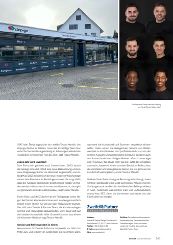 BEST OFBEST OF Z%u00fcrcher Oberland Portrait xxx 1612Adresse:Zweifel & Partner Garage Pneuhaus AGForchstrasse 111, 8127 Forch-ScheurenTelefon: +41 43 366 21 00E-Mail: garageinfo@zweiweb.ch Web: www.zweiweb.ch In K%u00fcrze: Pers%u00f6nliche und kompetente Kundenberatung, Transparenz bei den Dienstleistungen, Arbeit mit Leidenschaft und Herzblut: daf%u00fcr steht das Zweifel & Partner-Team.SEAT oder %u0160koda abgelaufen ist%u00bb, erkl%u00e4rt Teodor Mandik. Um stop+go-Partner zu bleiben, muss das 13-k%u00f6pfi ge Team (darunter f%u00fcnf Lernende) regelm%u00e4ssig an Schulungen teilnehmen. %u00abSo bleiben wir immer am Puls der Zeit%u00bb, sagt Teodor Mandik.Jedes Jahr wird investiertZum Fortschritt geh%u00f6ren auch Investitionen. 2023 wurde die Garage erneuert, 2024 eine neue Beleuchtung und ein neue Diagnoseger%u00e4te f%u00fcr die Werkstatt angeschafft, und Anfang M%u00e4rz 2025 schliesslich die neue, moderne Waschanlage neben dem Pneuhaus in Betrieb genommen. Sie sorgt daf%u00fcr, dass der Autolack noch besser geschont und Kratzer vermieden werden. %u00abWenn man nicht stets vorw%u00e4rts macht, dann gibt es irgendwann einen Investitionsstau%u00bb, sagt Teodor Mandik.Einen Fokus auf die Zukunft hat die Fachgarage schon l%u00e4nger. Seit Jahren k%u00f6nnen Kundinnen und Kunden ganz einfach Online einen Termin f%u00fcr Service oder Reparaturen buchen. Das hilft dem Zweifel & Partner Team, die Kundenanliegen schnell und reibungslos abzuarbeiten. Der Fokus liegt auf der lokalen Kundschaft. %u00abDer Grossteil kommt aus einem 10- Kilometer-Radius%u00bb, sagt Teodor Mandik.Service und Reifenwechsel in einemHauptsaison f%u00fcr Zweifel & Partner ist jeweils von M%u00e4rz bis Mitte Juni und wieder von September bis November. Dann wechselt die Kundschaft auf Sommer- respektive Winterreifen. Viele nutzen die Gelegenheit, Service und Reifenwechsel zu kombinieren. Und profi tieren nicht nur von der breiten Auswahl und authentische Beratung, sondern auch von %u00e4ussert konkurrenzf%u00e4higen Preisen. %u00abDurch unser eigenes Pneuhaus, das etwas mehr als die H%u00e4lfte des Umsatzes ausmacht, haben wir einen so hohen Bedarf an Reifen, dass die Hersteller uns Vorzugspreise bieten, die wir gerne an die Kundschaft weitergeben%u00bb, erkl%u00e4rt Teodor Mandik.Weil ein fairer Preis ohne gute Beratung nichts bringt, investiert die Fachgarage in die junge Generation. Aktuell erlernen f%u00fcnf junge Leute den Beruf in den Bereichen Reifenpraktiker/in EBA, Automobil-Assistent/in EBA und Automobilfachmann/-frau EFZ. Denn die Lernenden von heute sind die Fachkr%u00e4fte von morgen.Das Pneuhaus-Team unter der Leitung von Murat Memeti (oben links)