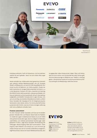 BEST OF Portrait xxx 1632Adresse: EVEVO GmbHGewerbestrasse 12, 8132 EggLager: 8604 VolketswilTelefon: +41 44 533 81 81E-Mail: info@evevo.ch Web: www.evevo.chIn K%u00fcrze: Die EVEVO GmbH ist ein Schweizer Distributor f%u00fcr Elektronikartikel. Die Kundschaft sch%u00e4tzt die Flexibilit%u00e4t, Geschwindigkeit, die individuellen L%u00f6sungen und das attraktive Preis- Leistungsverh%u00e4ltnis der Firma.Eneloops produziert, l%u00e4uft mit Solarstrom. Und mit solchem werden sie auch geladen, bevor sie zum ersten Mal ausgeliefert werden.Heute vertreibt das mittlerweile stark gewachse Unternehmen exklusiv weitere Batterienmarken wie z. B. Duracell, Maxell und Blaupunkt, und auch ihr Fahrzeug-Batterien-Sortiment wurde mit Batterien von Varta erweitert. Zudem besteht inzwischen ein riesiges Elektronikartikel-Sortiment, u. a. in den Bereichen Outdoor, DYI, B%u00fcro, Haushalt und Gaming. Die EVEVO GmbH z%u00e4hlt ausserdem viele grosse Retailer (online und station%u00e4r) zu ihrer Kundschaft, ist auch international aufgestellt und beliefert Grosskunden in ganz Europa. %u00abEs war uns wichtig, verschiedene Standbeine zu haben%u00bb, erkl%u00e4rt Oscar Gonzalez den Hauptgrund f%u00fcr die Vergr%u00f6sserung des Sortiments in den letzten Jahren. F%u00fcr die Kundschaft hat das ausserdem den Vorteil, dass sie mit einer einzigen Lieferung mehr als nur Batterien erhalten kann.Prozesse automatisiertF%u00fcr den Transport z%u00e4hlen Gonzalez und S%u00fcss auf die beiden grossen Anbieter DHL und Planzer. Diese holen die Paletten im modernen Lager in Volketswil ab. Dieses ist um ein Vielfaches gr%u00f6sser als das alte Lager, das sie zu Beginn in F%u00e4llanden unterhielten, und %u00abst%u00e4rker automatisiert als die Lager vieler gr%u00f6sserer Firmen%u00bb, sagt Oscar Gonzalez. Buchhaltung, Bestellungen, Wareneingang: Alles l%u00e4uft automatisiert. %u00abDies sorgt f%u00fcr mehr Effi zienz und erlaubt uns, auch mit einer gewissen Gr%u00f6sse nach wie vor schnell und flexibel zu reagieren%u00bb, sagt Manuel S%u00fcss. Das sei ein klarer Wettbewerbsvorteil, den sie gegen%u00fcber vielen Konkurrenten haben. Was nicht heisst, dass es nicht immer noch Kundschaft der alten Schule gibt, die eine Kleinstmenge an Batterien per Telefon in Auftrag geben. %u00abPers%u00f6nlicher Austausch mit der Kundschaft ist sch%u00f6n und wichtig f%u00fcr die Beziehung%u00bb, hebt S%u00fcss hervor.Manuel S%u00fcss und Oscar Gonzalez (v. l.)BEST OF Z%u00fcrcher Oberland