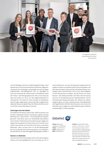 BEST OFBEST OF Z%u00fcrcher Oberland Portrait xxx 1652Adresse: dabamed AGL%u00e4nggstrasse 17, 8308 IllnauTelefon: +41 44 942 01 01E-Mail: info@dabamed.chWeb: www.dabamed.chIn K%u00fcrze: Die dabamed AG m%u00fcsste %u2013 wenn sie es nicht schon ist %u2013 schweizweit zum Synonym werden, wenn es um das Einhalten von Hygienestandards geht. Dieses Unternehmen d%u00fcrfen Sie bedenkenlos beiziehen, wenn auch in Ihrer Praxis, Ihrem Restaurant, Hotel oder Fitnessstudio ein Qu%u00e4ntchen mehr Hygiene-Know-how ganz gut w%u00e4re. Der %u00dcberraschungseffekt ist garantiert.immer hellh%u00f6riger, seit sie von dabamed geh%u00f6rt haben. Ganz speziell spricht das Fachunternehmen Zahn%u00e4rzte, Allgemeinmedizinerinnen, Podologen, Gyn%u00e4kologinnen oder Urologen, Augenkliniken, Dermatologinnen usw. an. Gestiegen ist auch das Interesse der Gastronomie und Hotellerie sowie der Fitness- oder Reinigungsbranche. Man ist sich bewusst, dass man etwas tun muss, um den Hygienestandards zu entsprechen. Und statt nur immer dar%u00fcber zu debattieren oder oft sogar wegzusehen, kommt das Aktiv-Angebot einer dabamed sowas von goldrichtig. Der Zeitpunkt k%u00f6nnte auch in der Post-Corona-Zeit besser nicht sein.Schulungen sind sehr beliebtDie dabamed AG betreut aktuell %u00fcber 3000 Kundinnen und Kunden in der ganzen Schweiz. Auf Verkauf, Logistik, Versand, Beratung und %u2013 ganz zentral %u2013 Schulung liegt das Hauptaugenmerk. Stichworte dazu sind Arbeitsplatz-Desinfektion, Instrumenten-Aufbereitung, Personalschulung in Hygiene im eigenen Schulungszentrum oder direkt vor Ort, bei der Kundschaft. %u00abDas Schulen vor Ort macht immer Sinn%u00bb, weiss Dany Badstuber. %u00abDenn da kann man 1:1 mit den Bedingungen bei der Kundschaft die Punkte ansprechen und verbessern, das Verst%u00e4ndnis f%u00fcr optimale Hygienebedingungen schaffen.%u00bb Bumann vs. BadstuberUnd nochmal: Man will ja als Gast nicht immer alles so genau wissen und schaut gelegentlich auch mal weg, wie z. B. in einem Restaurant, wo man nach genauem Augenschein der Hygiene instinktiv am liebsten sofort die Flucht ergreifen und das Lokal wechseln w%u00fcrde. Da f%u00fchlt sich bestimmt jede:r kurz ertappt, wenn er/sie das liest. Und um nun beim Vergleich mit der Gastronomie zu bleiben: Sie alle kennen ihn sicher, Bumann, den Restauranttester. Der Mann des Vertrauens, wenn es um die Optimierung von Arbeitsprozessen und K%u00fcchenleistung in Restaurants geht. Wir nehmen nun diesen Vergleich gerne zur Hand und pr%u00e4sentieren Ihnen Badstuber, den Hygienetester. Der Mann des Vertrauens, wenn es um die Optimierung von Hygiene und die Aufbereitung von Medizinprodukten geht. Fortsetzung folgt %u2026Das aufgestellte, sympathische Team der dabamed AG in Illnau: Stets zu Diensten.