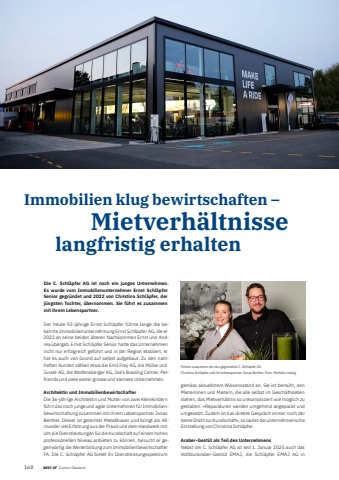 168 BEST OF Portrait xxxImmobilien klug bewirtschaften %u2013 Mietverh%u00e4ltnisse langfristig erhaltenDie C. Schl%u00e4pfer AG ist noch ein junges Unternehmen. Es wurde vom Immobilienunternehmer Ernst Schl%u00e4pfer Senior gegr%u00fcndet und 2022 von Christina Schl%u00e4pfer, der j%u00fcngsten Tochter, %u00fcbernommen. Sie f%u00fchrt es zusammen mit ihrem Lebenspartner. Der heute 92-j%u00e4hrige Ernst Schl%u00e4pfer f%u00fchrte lange die bekannte Immobilienunternehmung Ernst Schl%u00e4pfer AG, die er 2022 an seine beiden %u00e4lteren Nachkommen Ernst und Andrea %u00fcbergab. Ernst Schl%u00e4pfer Senior hatte das Unternehmen nicht nur erfolgreich gef%u00fchrt und in der Region etabliert, er hat es auch von Grund auf selbst aufgebaut. Zu den namhaften Kunden z%u00e4hlen etwa die Emil Frey AG, die M%u00fcller und Jussel AG, die Wolfensberger AG, Joe%u2019s Bowling Center, Petfriends und viele weiter grosse und kleinere Unternehmen.Architektin und Immobilienbewirtschafter Die 36-j%u00e4hrige Architektin und Mutter von zwei Kleinkindern f%u00fchrt das noch junge und agile Unternehmen f%u00fcr Immobilienbewirtschaftung zusammen mit ihrem Lebenspartner Jonas Berther. Dieser ist gelernter Metallbauer und bringt als Allrounder viel Erfahrung aus der Praxis und dem Handwerk mit. Um die Dienstleistungen f%u00fcr die Kundschaft auf einem hohen professionellen Niveau anbieten zu k%u00f6nnen, besucht er gegenw%u00e4rtig die Weiterbildung zum Immobilienbewirtschafter FA. Die C. Schl%u00e4pfer AG bietet ihr Dienstleistungsspektrum gem%u00e4ss aktuellstem Wissensstand an. Sie ist bem%u00fcht, den Mieterinnen und Mietern, die alle selbst im Gesch%u00e4ftsleben stehen, das Mietverh%u00e4ltnis so unkompliiziert wie m%u00f6glich zu gestalten. %u00abReparaturen werden umgehend angepackt und umgesetzt. Zudem ist das direkte Gespr%u00e4ch immer noch der beste Draht zur Kundschaft%u00bb, so lautet die unternehmerische Einstellung von Christina Schl%u00e4pfer. Araber-Gest%u00fct als Teil des UnternehmensNebst der C. Schl%u00e4pfer AG ist seit 1. Januar 2025 auch das Vollblutaraber-Gest%u00fct EMAJ, die Schl%u00e4pfer EMAJ AG in F%u00fchren zusammen die neu gegr%u00fcndete C. Schl%u00e4pfer AG: Christina Schl%u00e4pfer und ihr Lebenspartner Jonas Berther. Foto: Michela LudwigBEST OF Z%u00fcrcher Oberland