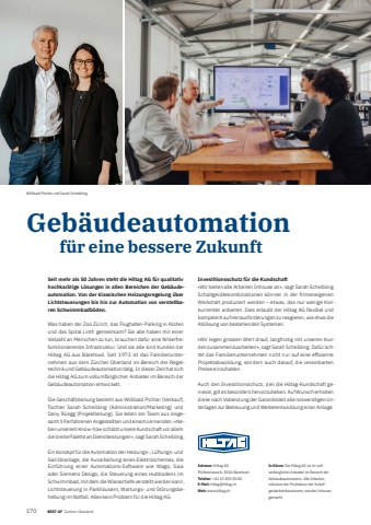 170 BEST OF BEST OF Portrait xxx Z%u00fcrcher OberlandGeb%u00e4udeautomation f%u00fcr eine bessere ZukunftAdresse: Hiltag AGM%u00fchlestrasse 6, 8344 B%u00e4retswilTelefon: +41 43 833 50 00E-Mail: hiltag@hiltag.ch Web: www.hiltag.ch In K%u00fcrze: Die Hiltag AG ist ihr vollumf%u00e4nglicher Anbieter im Bereich der Geb%u00e4udeautomation. Alle Arbeiten, inklusive der Produktion der Schaltger%u00e4tekombinationen, werden Inhouse gemacht. Seit mehr als 50 Jahren steht die Hiltag AG f%u00fcr qualitativ hochkar%u00e4tige L%u00f6sungen in allen Bereichen der Geb%u00e4udeautomation. Von der klassischen Heizungsregelung %u00fcber Lichtsteuerungen bis hin zur Automation von verstellbaren Schwimmbadb%u00f6den.Was haben der Zoo Z%u00fcrich, das Flughafen-Parking in Kloten und das Spital Linth gemeinsam? Sie alle haben mit einer Vielzahl an Menschen zu tun, brauchen daf%u00fcr eine fehlerfrei funktionierende Infrastruktur. Und sie alle sind Kunden der Hiltag AG aus B%u00e4retswil. Seit 1973 ist das Familienunternehmen aus dem Z%u00fcrcher Oberland im Bereich der Regeltechnik und Geb%u00e4udeautomation t%u00e4tig. In dieser Zeit hat sich die Hiltag AG zum vollumf%u00e4nglichen Anbieter im Bereich der Geb%u00e4udeautomation entwickelt.Die Gesch%u00e4ftsleitung besteht aus Willibald Pichler (Verkauf), Tochter Sarah Scheibling (Administration/Marketing) und Dany R%u00fcegg (Projektleitung). Sie leiten ein Team aus insgesamt 19 erfahrenen Angestellten und einem Lernenden. %u00abNeben unserem Know-how sch%u00e4tzt unsere Kundschaft vor allem die breite Palette an Dienstleistungen%u00bb, sagt Sarah Scheibling.Ein Konzept f%u00fcr die Automation der Heizungs-, L%u00fcftungs- und Sanit%u00e4ranlage, die Ausarbeitung eines Elektroschemas, die Einf%u00fchrung einer Automations-Software wie Wago, Saia oder Siemens Desigo, die Steuerung eines Hubbodens im Schwimmbad, mit dem die Wassertiefe verstellt werden kann, Lichtsteuerung in Parkh%u00e4usern, Wartungs- und St%u00f6rungsbehebung im Notfall. Alles kein Problem f%u00fcr die Hiltag AG. Investitionsschutz f%u00fcr die Kundschaft%u00abWir bieten alle Arbeiten Inhouse an%u00bb, sagt Sarah Scheibling. Schaltger%u00e4tekombinationen k%u00f6nnen in der fi rmeneigenen Werkstatt produziert werden %u2013 etwas, das nur wenige Konkurrenten anbieten. Dies erlaubt der Hiltag AG flexibel und kompetent auf Herausforderungen zu reagieren, wie etwa die Abl%u00f6sung von bestehenden Systemen. %u00abWir legen grossen Wert drauf, langfristig mit unseren Kunden zusammenzuarbeiten%u00bb, sagt Sarah Scheibling. Daf%u00fcr achtet das Familienunternehmen nicht nur auf eine effi ziente Projektabwicklung, sondern auch darauf, die vereinbarten Preise einzuhalten.Auch den Investitionsschutz, den die Hiltag-Kundschaft geniesst, gilt es besonders hervorzuheben. Auf Wunsch erhalten diese nach Vollendung der Garantiezeit alle notwendigen Unterlagen zur Betreuung und Weiterentwicklung einer Anlage. Willibald Pichler und Sarah Scheibling