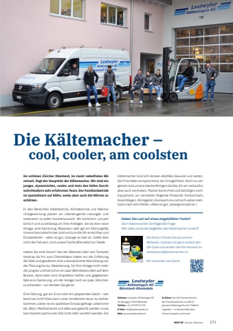 BEST OFBEST OF Z%u00fcrcher Oberland Portrait xxx 171Adresse: Leutwyler K%u00fchlanlagen AGIm Neuegg 2, 8344 B%u00e4retswilTelefon: +41 44 939 22 70E-Mail: info@kaeltemacher.chWeb: www.kaeltemacher.chIn K%u00fcrze: Von der Eismaschine f%u00fcr den Privathausalt bis zur 600 m2grossen K%u00fchlanlage f%u00fcr den Tiefk%u00fchlLogistiker %u2013 in Sachen K%u00e4lte l%u00e4sst Sie bei Leutwyler nichts kalt.Im sch%u00f6nen Z%u00fcrcher Oberland, im meist nebelfreien B%u00e4retswil, liegt der Hauptsitz der K%u00e4ltemacher. Wir sind ein junges, dynamisches, cooles und trotz des tiefen Durchschnittsalters sehr erfahrenes Team. Der Familienbetrieb ist spezialisiert auf K%u00e4lte, weiss aber auch die W%u00e4rme zu sch%u00e4tzen. In den Bereichen K%u00e4ltetechnik, Klimatechnik und W%u00e4rmer%u00fcckgewinnung planen wir %u00fcberzeugende L%u00f6sungen und realisieren so jeden Kundenwunsch. Wir k%u00fcmmern uns pers%u00f6nlich und zuverl%u00e4ssig um Ihre Anliegen. Sei es eine neue Anlage, eine Sanierung, Reparatur oder gar ein St%u00f6rungsfall. Unsere Servicetechniker sind rund um die Uhr erreichbar und Einsatzbereit %u2013 alles ist gut, solange es kalt ist. Sollte dies nicht der Fall sein, sind unsere Fachkr%u00e4fte sofort zur Stelle. Haben Sie eine Vision? Von der B%u00e4ckerei %u00fcber den Tankstellenshop bis hin zum Chemielabor haben wir die Erfahrung, die Idee und gew%u00e4hren eine unkomplizierte Abwicklung von der Planung bis zur Realisierung. Ist Ihre Anlage nicht mehr die j%u00fcngste und hat schon ein paar Betriebsstunden auf dem Buckel, dann kann eine Inspektion helfen und gegebenenfalls eine Sanierung, um der Anlage noch ein paar J%u00e4hrchen zu schenken %u2013 wir beraten Sie gerne. Eine St%u00f6rung, gar ein Error oder ein piepsendes Ger%u00e4t %u2013 wer kennt es nicht? Dies kann unter Umst%u00e4nden teuer zu stehen kommen, daher ist ein speditiver Einsatz gefragt. Lebensmittel, Wein, Medikamente und alles was gek%u00fchlt werden muss, kann bereits nach kurzer Zeit nicht mehr verzehrt werden. Die Die K%u00e4ltemacher %u2013 cool, cooler, am coolstenK%u00e4ltemacher sind sich dessen %u00abNotfall%u00bb bewusst und setzen die Priorit%u00e4ten entsprechend der Dringlichkeit. Nicht zu vergessen sind unsere steckerfertigen Ger%u00e4te, die wir verkaufen, aber auch vermieten. Planen Sie ein Fest und ben%u00f6tigen noch Equipment, wir vermieten folgende Produkte: K%u00fchlschrank, Glac%u00e9 Wagen, Klimager%u00e4t, Eismaschine und noch vieles mehr. Ganz nach dem Motto: %u00abAlles ist gut, solange es kalt ist.%u00bbHaben Sie Lust auf einen eisgek%u00fchlten Tschin?Dann beantworten Sie folgende Frage: Wie viele Lernende begleiten die K%u00e4ltemacher zurzeit?Die Antwort fi nden Sie auf unserer Webseite. Scannen Sie ganz einfach den QR-Code und senden Sie Ihre Antwort an: wettbewerb@kaeltemacher.ch Wir w%u00fcnschen viel Gl%u00fcck!