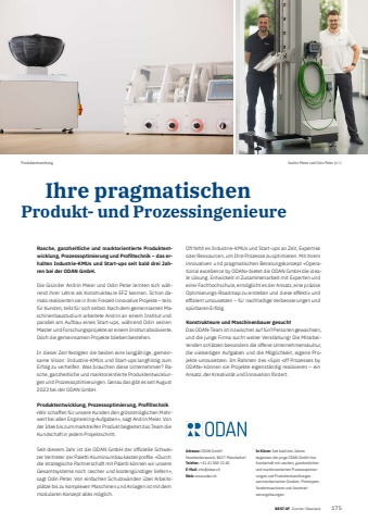 BEST OFBEST OF Z%u00fcrcher Oberland Portrait xxx 1751ProduktentwicklungAdresse: ODAN GmbHHeizib%u00fcelstrasse 6, 8617 M%u00f6nchaltorfTelefon: +41 41 500 32 40E-Mail: info@odan.ch Web: www.odan.chIn K%u00fcrze: Seit bald drei Jahren begeistert die junge ODAN GmbH ihre Kundschaft mit raschen, ganzheitlichen und marktorientierten Prozessoptimierungen und Produktentwicklungen wie mechanischen Ger%u00e4ten, Prototypen, Sondermaschinen und Automatisierungsl%u00f6sungen.Rasche, ganzheitliche und marktorientierte Produktentwicklung, Prozessoptimierung und Profi ltechnik %u2013 das erhalten Industrie-KMUs und Start-ups seit bald drei Jahren bei der ODAN GmbH.Die Gr%u00fcnder Andrin Meier und Odin Peter lernten sich w%u00e4hrend ihrer Lehre als Konstrukteure%u00a0EFZ kennen. Schon damals realisierten sie in ihrer Freizeit innovative Projekte %u2013 teils f%u00fcr Kunden, teils f%u00fcr sich selbst. Nach dem gemeinsamen Maschinenbaustudium arbeitete Andrin an einem Institut und parallel am Aufbau eines Start-ups, w%u00e4hrend Odin seinen Master und Forschungsprojekte an einem Institut absolvierte. Doch die gemeinsamen Projekte blieben bestehen.In dieser Zeit festigten die beiden eine langj%u00e4hrige, gemeinsame Vision: Industrie-KMUs und Start-ups langfristig zum Erfolg zu verhelfen. Was brauchen diese Unternehmen? Rasche, ganzheitliche und marktorientierte Produktentwicklungen und Prozessoptimierungen. Genau das gibt es seit August 2022 bei der ODAN%u00a0GmbH.Produktentwicklung, Prozessoptimierung, Profi ltechnik%u00abWir schaffen f%u00fcr unsere Kunden den gr%u00f6sstm%u00f6glichen Mehrwert bei allen Engineering-Aufgaben%u00bb, sagt Andrin Meier. Von der Idee bis zum marktreifen Produkt begleitet das Team die Kundschaft in jedem Projektschritt.Seit diesem Jahr ist die ODAN%u00a0GmbH der offi zielle Schweizer Vertreter der Paletti Aluminiumbaukastenprofi le. %u00abDurch die strategische Partnerschaft mit Paletti k%u00f6nnen wir unsere Gesamtsysteme noch rascher und kosteng%u00fcnstiger liefern%u00bb, sagt Odin Peter. Von einfachen Schutzw%u00e4nden %u00fcber Arbeitspl%u00e4tze bis zu komplexen Maschinen und Anlagen ist mit dem modularen Konzept alles m%u00f6glich.Oft fehlt es Industrie-KMUs und Start-ups an Zeit, Expertise oder Ressourcen, um Ihre Prozesse zu optimieren. Mit ihrem innovativen und pragmatischen Beratungskonzept %u00abOperational excellence by ODAN%u00bb bietet die ODAN GmbH die ideale L%u00f6sung. Entwickelt in Zusammenarbeit mit Experten und einer Fachhochschule, erm%u00f6glicht es der Ansatz, eine pr%u00e4zise Optimierungs-Roadmap zu erstellen und diese effektiv und effi zient umzusetzen %u2013 f%u00fcr nachhaltige Verbesserungen und sp%u00fcrbaren Erfolg.Konstrukteure und Maschinenbauer gesuchtDas ODAN-Team ist inzwischen auf f%u00fcnf Personen gewachsen, und die junge Firma sucht weiter Verst%u00e4rkung! Die Mitarbeitenden sch%u00e4tzen besonders die offene Unternehmenskultur, die vielseitigen Aufgaben und die M%u00f6glichkeit, eigene Projekte umzusetzen. Im Rahmen des %u00abSpin-off Prozesses by ODAN%u00bb k%u00f6nnen sie Projekte eigenst%u00e4ndig realisieren %u2013 ein Ansatz, der Kreativit%u00e4t und Innovation f%u00f6rdert. Ihre pragmatischenProdukt- und ProzessingenieureAndrin Meier und Odin Peter (v. l.)