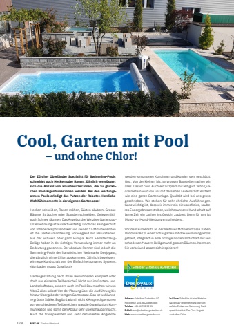 178 BEST OF BEST OF Portrait xxx Z%u00fcrcher OberlandCool, Garten mit Pool %u2013 und ohne Chlor!Adresse: Scheibler Gartenbau AGMotorenstr. 104, 8620 WetzikonTelefon: +41 44 930 32 31E-Mail: info@scheibler-gartenbau.chWeb: www.scheibler-gartenbau.chIn K%u00fcrze: Scheibler ist eine Wetziker Gartenbau-Unternehmung, die sich auf den Einbau von Swimming-Pools spezialisiert hat. Der Clou: Es geht auch ohne Chlor.Der Z%u00fcrcher Oberl%u00e4nder Spezialist f%u00fcr Swimming-Pools schneidet auch Hecken oder Rasen. J%u00e4hrlich vergr%u00f6ssert sich die Anzahl von Hausbesitzer:innen, die zu gl%u00fccklichen Pool-Eigent%u00fcmer:innen werden. Bei den wartungsarmen Pools erledigt das Putzen der Roboter. Herrliche Wohlf%u00fchlmomente in der eigenen Gartenoase!Hecken schneiden, Rasen m%u00e4hen, G%u00e4rten s%u00e4ubern. Grosse B%u00e4ume, Str%u00e4ucher oder Stauden schneiden. Gelegentlich auch Schnee r%u00e4umen. Das Angebot der Wetziker GartenbauUnternehmung ist %u00e4ussert vielf%u00e4ltig. Doch das Kerngesch%u00e4ft von Inhaber Ralph D%u00e4ndliker und seinen 15 Mitarbeitenden ist die Gartenum%u00e4nderung, vorwiegend mit Natursteinen aus der Schweiz oder ganz Europa. Auch FeinsteinzeugBel%u00e4ge haben in der richtigen Verwendung immer mehr an Bedeutung gewonnen. Der absolute Renner sind jedoch die Swimming-Pools der franz%u00f6sischen Weltmarke Desjoyaux, die g%u00e4nzlich ohne Chlor auskommen. J%u00e4hrlich begeistern wir neue Kundschaft von der Einfachheit unseres Systems. %u00abNur baden musst Du selbst!%u00bbGartengestaltung nach Ihren Bed%u00fcrfnissen komplett oder doch nur einzelne Teilbereiche? Nicht nur im Garten- und Landschaftsbau, sondern auch im Pool-Bau machen wir von A bis Z alles selbst! Von der Planung %u00fcber die Ausf%u00fchrung bis hin zur %u00dcbergabe der fertigen Gartenoase. Das ist wohl unsere gr%u00f6sste St%u00e4rke. Es gibt dadurch nicht X Ansprechpersonen von verschiedenen Teilbereichen, was die Organisation, Kommunikation und somit den Ablauf sehr %u00fcberschaubar macht. Auch die transparenten und sehr detaillierten Angebote werden von unseren Kundinnen und Kunden sehr gesch%u00e4tzt. Und: Von der kleinen bis zur grossen Baustelle machen wir alles. Das ist cool. Auch ein Sitzplatz mit lediglich zehn Quadratmetern wird von uns mit derselben Leidenschaft erstellt wie eine ganze Gartenanlage. Qualit%u00e4t wird bei uns gross geschrieben. Wir stehen f%u00fcr sehr ehrliche Ausf%u00fchrungen. Ganz wichtig ist, dass wir immer ein einwandfreies, sauberes Endergebnis anstreben, welches unserer Kundschaft auf lange Zeit ein Lachen ins Gesicht zaubert. Denn f%u00fcr uns ist Mund- zu-Mund-Werbung entscheidend.Vor dem Firmensitz an der Wetziker Motorenstrasse haben D%u00e4ndliker & Co. einen Schaugarten mit drei Swimming-Pools gebaut, integriert in eine richtige Gartenlandschaft mit verschiedenen Mauern, Bel%u00e4gen und grossen B%u00e4umen. Kommen Sie vorbei und lassen sich inspirieren!