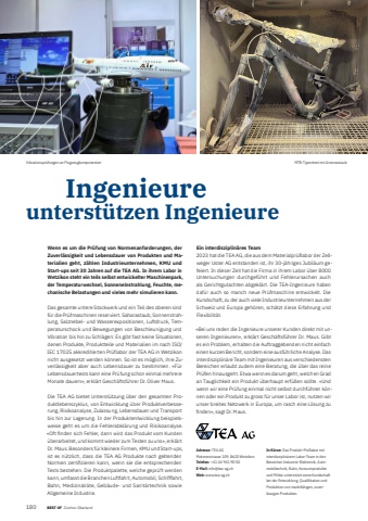 180 BEST OF BEST OF Portrait xxx Z%u00fcrcher OberlandAdresse: TEA AGMotorenstrasse 109, 8620 WetzikonTelefon: +41 44 941 90 50E-Mail: info@tea-ag.ch Web: www.tea-ag.ch In K%u00fcrze: Das Produkt-Pr%u00fcflabor mit interdisziplin%u00e4rem Labor-Team in den Bereichen Industrie-Elektronik, Automobiltechnik, Bahn, Konsumprodukte und Milit%u00e4r unterst%u00fctzt seine Kundschaft bei der Entwicklung, Qualifi kation und Produktion von marktf%u00e4higen, zuverl%u00e4ssigen Produkten. Ingenieure unterst%u00fctzen IngenieureWenn es um die Pr%u00fcfung von Normenanforderungen, der Zuverl%u00e4ssigkeit und Lebensdauer von Produkten und Materialien geht, z%u00e4hlen Industrieunternehmen, KMU und Start-ups seit 30 Jahren auf die TEA AG. In ihrem Labor in Wetzikon steht ein teils selbst entwickelter Maschinenpark, der Temperaturwechsel, Sonneneinstrahlung, Feuchte, mechanische Belastungen und vieles mehr simulieren kann.Das gesamte untere Stockwerk und ein Teil des oberen sind f%u00fcr die Pr%u00fcfmaschinen reserviert. Saharastaub, Sonnenstrahlung, Salznebel- und Wasserexpositionen, Luftdruck, Temperaturschock und Bewegungen von Beschleunigung und Vibration bis hin zu Schl%u00e4gen: Es gibt fast keine Situationen, denen Produkte, Produktteile und Materialien im nach ISO/IEC 17025 akkreditierten Pr%u00fcflabor der TEA AG in Wetzikon nicht ausgesetzt werden k%u00f6nnen. So ist es m%u00f6glich, ihre Zuverl%u00e4ssigkeit aber auch Lebensdauer zu bestimmen. %u00abF%u00fcr Lebensdauertests kann eine Pr%u00fcfung schon einmal mehrere Monate dauern%u00bb, erkl%u00e4rt Gesch%u00e4ftsf%u00fchrer Dr. Oliver Maus.Die TEA AG bietet Unterst%u00fctzung %u00fcber den gesamten Produktlebenszyklus, von Entwicklung %u00fcber Produktverbesserung, Risikoanalyse, Zulassung, Lebensdauer und Transport bis hin zur Lagerung. In der Produktentwicklung beispielsweise geht es um die Fehlerabkl%u00e4rung und Risikoanalyse. %u00abOft fi nden sich Fehler, dann wird das Produkt vom Kunden %u00fcberarbeitet, und kommt wieder zum Testen zu uns%u00bb, erkl%u00e4rt Dr. Maus. Besonders f%u00fcr kleinere Firmen, KMU und Start-ups, ist es n%u00fctzlich, dass die TEA AG Produkte nach geltenden Normen zertifi zieren kann, wenn sie die entsprechenden Tests bestehen. Die Produktpalette, welche gepr%u00fcft werden kann, umfasst die Branchen Luftfahrt, Automobil, Schifffahrt, Bahn, Medizinalr%u00e4te, Geb%u00e4ude- und Sanit%u00e4rtechnik sowie Allgemeine Industrie. Ein interdisziplin%u00e4res Team2023 hat die TEA AG, die aus dem Materialpr%u00fcflabor der Zellweger Uster AG entstanden ist, ihr 30-j%u00e4hriges Jubil%u00e4um gefeiert. In dieser Zeit hat die Firma in ihrem Labor %u00fcber 8000 Untersuchungen durchgef%u00fchrt und Fehlerursachen auch als Gerichtgutachten abgekl%u00e4rt. Die TEA-Ingenieure haben daf%u00fcr auch so manch neue Pr%u00fcfmaschine entwickelt. Die Kundschaft, zu der auch viele Industrieunternehmen aus der Schweiz und Europa geh%u00f6ren, sch%u00e4tzt diese Erfahrung und Flexibilit%u00e4t.%u00abBei uns reden die Ingenieure unserer Kunden direkt mit unseren Ingenieuren%u00bb, erkl%u00e4rt Gesch%u00e4ftsf%u00fchrer Dr. Maus. Gibt es ein Problem, erhalten die Auftraggebenden nicht einfach einen kurzen Bericht, sondern eine ausf%u00fchrliche Analyse. Das interdisziplin%u00e4re Team mit Ingenieuren aus verschiedensten Bereichen erlaubt zudem eine Beratung, die %u00fcber das reine Pr%u00fcfen hinausgeht. Etwa wenn es darum geht, welchen Grad an Tauglichkeit ein Produkt %u00fcberhaupt erf%u00fcllen sollte. %u00abUnd wenn wir eine Pr%u00fcfung einmal nicht selbst durchf%u00fchren k%u00f6nnen oder ein Produkt zu gross f%u00fcr unser Labor ist, nutzen wir unser breites Netzwerk in Europa, um rasch eine L%u00f6sung zu fi nden%u00bb, sagt Dr. Maus.Vibrationspr%u00fcfungen an Flugzeugkomponenten MTB-Typentest mit Arizonastaub