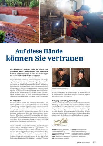 BEST OFBEST OF Z%u00fcrcher Oberland Portrait xxx 1891 Auf diese H%u00e4nde k%u00f6nnen Sie vertrauenAdresse: Hauswartung Goldglanz KLGFrancisco Dapia & Sarah PaulAdletshuserriedweg 2b, 8627 Gr%u00fcningenTelefon: +41 79 424 04 87E-Mail: info@hauswartung-goldglanz.ch Web: www.hauswartung-goldglanz.chIn K%u00fcrze: Individuell auf Kundenw%u00fcnsche eingehen und diese mit Professionalit%u00e4t umsetzen: F%u00fcr Francisco Dapia stehen Qualit%u00e4t und pers%u00f6nlicher Kundenkontakt an erster Stelle.Die Hauswartung Goldglanz steht f%u00fcr Qualit%u00e4t und gl%u00e4nzenden Service. Liegenschaften, B%u00fcros und private Geb%u00e4ude profi tieren von der exakten und zuverl%u00e4ssigen Arbeit des erfahrenen Profi s Francisco Dapia.Ob privat oder bei der Arbeit, Francisco Dapia ist sehr ehrgeizig und pflegt eine Leidenschaft f%u00fcrs Reinigen. Er bezeichnet sich selbst als Detailing-Spezialist. Der Begriff %u00abDetailing%u00bb kommt aus der Autobranche und meint eine ausserordentlich aufwendige und anspruchsvolle Autopflege. Francisco Dapia, der %u00fcber 17 Jahre Erfahrung als Hauswart und in der Gartenpflege verf%u00fcgt, wendet dieses Prinzip auch in den Auftr%u00e4gen seiner Hauswartung an, die er vor einem Jahr gegr%u00fcndet hat. Gegebenenfalls verwendet er auch einen Pinsel zum Reinigen.Ein starkes PaarFrancisco Dapia m%u00f6chte das bestm%u00f6gliche Ergebnis mit seiner speditiven und sauberen Arbeitsweise herausholen. %u00abSchon einige Kunden sagten mir, dass ich Zauberh%u00e4nde habe%u00bb, sagt Francisco. Dies merkt man an seiner Leidenschaft, wenn man ihm bei der Arbeit zusieht. F%u00fcr ihn ist das sch%u00f6nste Kompliment, wenn die Kundschaft den VorherNachher-Effekt sieht und seine Arbeit gesch%u00e4tzt wird. Unterst%u00fctzt wird Francisco Dapia dabei von seiner Lebenspartnerin Sarah Paul, die sich mehrheitlich im Hintergrund h%u00e4lt und die Administration von Goldglanz %u00fcbernimmt.Ob im Einsatz bei einem Einfamilienhaus, f%u00fcr Verwaltungen im Bereich B%u00fcro, in Arztpraxen oder bei Liegenschaften %u2013 das Angebot an Dienstleistungen f%u00fcr die Kundschaft ist breit. Genau wie das Einzugsgebiet: von der pulsierenden Stadt Z%u00fcrich %u00fcber das Z%u00fcrcher Oberland bis hin zum idyllischen Dorf. Goldglanz sorgt drinnen und draussen f%u00fcr den Werterhalt, Ordnung und Sauberkeit. Steht bald ein Umzug an? F%u00fcr eine stressfreie %u00dcbergabe an die Verwaltung ist gesorgt. Ziel ist es, das scheinbar Unm%u00f6gliche m%u00f6glich zu machen, egal in welchem Zustand ein Objekt ist.Reinigung, Hauswartung, GartenpflegeEin Hauswart sorgt nicht nur f%u00fcr kleine Reparaturarbeiten oder die Reinigung. Er ist flexibel und saisonal unterschiedlich im Einsatz. Ob Rasenm%u00e4hen, Str%u00e4ucher zur rechten Zeit in Form bringen oder die Wege von Unkraut befreien. Im Winter sorgt er daf%u00fcr, dass die Gehwege gesalzen sind und der Schnee wegger%u00e4umt wird. Es gibt immer zu tun, um die Umgebung zu pflegen. Auch f%u00fcr die Sicherheit auf Spielpl%u00e4tzen ist gesorgt.Francisco Dapia und Sarah Paul (v. l.)