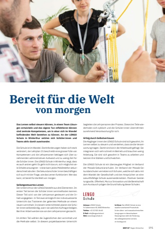 BEST OFBEST OF Region Winterthur Portrait xxx 191Adresse: LENGO SchuleSt. Gallerstrasse 40, 8400 WinterthurTelefon: +41 52 503 46 60E-Mail: info@lengoschule.ch Web: www.lengoschule.ch In K%u00fcrze: Die LENGO Schule ist eine staatlich anerkannte Privatschule. In den alters- und niveaudurchmischten Lerngruppen in %u00fcberschaubarer Klassengr%u00f6sse steht die F%u00f6rderung des selbstgesteuerten Lernens im Vordergrund.Das Lernen selbst steuern k%u00f6nnen, in einem Team L%u00f6sungen entwickeln und das eigene Tun reflektieren k%u00f6nnen sind zentrale Kompetenzen, um in einer sich im Wandel befi ndenden Welt bestehen zu k%u00f6nnen. An der LENGO Schule in Winterthur setzten sich Sch%u00fcler:innen und Teams aktiv damit auseinander.Die Schule ist im Wandel. Die Anforderungen haben sich stark ver%u00e4ndert, der Lehrplan 21 beschreibt eine grosse F%u00fclle von Kompetenzen und die Lehrpersonen beklagen sich %u00fcber zunehmenden administrativen Aufwand und zu wenig Zeit f%u00fcr die Sch%u00fcler:innen. Die LENGO Schule in Winterthur zeigt, dass es auch anders geht: Es geht nicht darum, sich m%u00f6glichst viele Inhalte anzueignen %u2013 diese kann jedes Mobiltelefon sekundenschnell abrufen. Die Sekundarsch%u00fcler:innen besch%u00e4ftigen sich auch mit der Frage, wie das Lernen funktioniert. Wer das kann, ist bereit f%u00fcr die Welt von morgen.Selbstgesteuertes LernenDer Unterricht an der LENGO besteht aus drei Elementen. Im ersten Teil lernen die Sch%u00fcler:innen Lernmethoden kennen. Dieser Teil wird von der Lehrperson gesteuert und der Inhalt vorgegeben. In Teil zwei erm%u00f6glicht der individualisierte Unterricht das Trainieren der gelernten Methode an einem neuen Lerninhalt. In diesem Unterrichtsteil planen die Sch%u00fcler:innen selbstst%u00e4ndig, wann sie welchen Auftrag erledigen. Bei ihrer Arbeit werden sie von den Lehrpersonen gecoacht.Im dritten Teil w%u00e4hlen die Jugendlichen den Lerninhalt und die Methode selbst. In diesem projektbasierten Unterricht begleiten die Lehrpersonen den Prozess. Diese drei Teile wiederholen sich zyklisch und die Sch%u00fcler:innen %u00fcbernehmen zunehmend Verantwortung f%u00fcr sich.Erfolg durch SelbstvertrauenDie Abg%u00e4nger:innen der LENGO Schule sind sich gewohnt, ihr Lernen selber zu steuern und verstehen, dass sie die Verantwortung tragen. Damit sind sie in der Arbeitswelt gefragt. Sie integrieren sich sehr schnell im Betrieb und brauchen wenig Anleitung. Sie sind sich gewohnt in Teams zu arbeiten und kennen ihre St%u00e4rken und Schw%u00e4chen. Die LENGO Schule ist ein %u00fcberzeugtes Mitglied im Verband der Mosaik-Sekundarschulen. Im Verband der Mosaik-Sekundarschulen vernetzen sich Schulen, welche sich aktiv mit dem Wandel der Gesellschaft und den Anspr%u00fcchen an eine zukunftsf%u00e4hige Schule auseinandersetzen. Positiver Gestaltungswille, Offenheit, Mut zur Innovation und die Bereitschaft zum Austausch pr%u00e4gen die Grundhaltung dieser Schulen.Bereit f%u00fcr die Welt von morgen