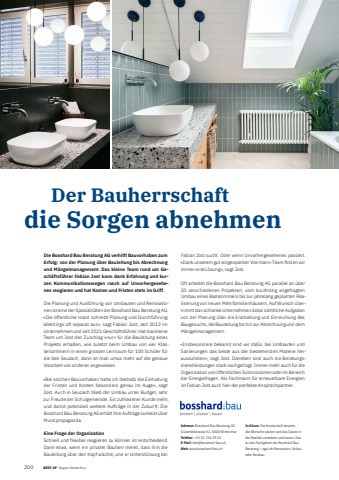 1200 BEST OF Portrait xxxDie Bosshard Bau Beratung AG verhilft Bauvorhaben zum Erfolg: von der Planung %u00fcber Bauleitung bis Abrechnung und M%u00e4ngelmanagement. Das kleine Team rund um Gesch%u00e4ftsf%u00fchrer Fabian Jost kann dank Erfahrung und kurzen Kommunikationswegen rasch auf Unvorhergesehenes reagieren und hat Kosten und Fristen stets im Griff.Die Planung und Ausf%u00fchrung von Umbauten und Renovationen ist eine der Spezialit%u00e4ten der Bosshard Bau Beratung AG. %u00abDie %u00f6ffentliche Hand schreibt Planung und Durchf%u00fchrung allerdings oft separat aus%u00bb, sagt Fabian Jost, seit 2012 im Unternehmen und seit 2021 Gesch%u00e4ftsf%u00fchrer. Hat das kleine Team um Jost den Zuschlag %u00abnur%u00bb f%u00fcr die Bauleitung eines Projekts erhalten, wie zuletzt beim Umbau von vier Klassenzimmern in einen grossen Lernraum f%u00fcr 100 Sch%u00fcler f%u00fcr die Sek Seuzach, dann ist man umso mehr auf die genaue Vorarbeit von anderen angewiesen.%u00abBei solchen Bauvorhaben halte ich deshalb die Einhaltung der Fristen und Kosten besonders genau im Auge%u00bb, sagt Jost. Auch in Seuzach blieb der Umbau unter Budget, sehr zur Freude der Schulgemeinde. Ein zufriedener Kunde mehr, und damit potenziell weitere Auftr%u00e4ge in der Zukunft. Die Bosshard Bau Beratung AG erh%u00e4lt ihre Auftr%u00e4ge zumeist %u00fcber Mundpropaganda.Eine Frage der OrganisationSchnell und flexibel reagieren zu k%u00f6nnen ist entscheidend. Dann etwa, wenn ein privater Bauherr merkt, dass ihm die Bauleitung %u00fcber den Kopf w%u00e4chst, und er Unterst%u00fctzung bei Fabian Jost sucht. Oder wenn Unvorhergesehenes passiert. %u00abDank unserem gut eingespielten Viermann-Team fi nden wir immer eine L%u00f6sung%u00bb, sagt Jost.Oft arbeitet die Bosshard Bau Beratung AG parallel an %u00fcber 20 verschiedenen Projekten, vom kurzfristig angefragten Umbau eines Badezimmers bis zur jahrelang geplanten Realisierung von neuen Mehrfamilienh%u00e4usern. Auf Wunsch %u00fcbernimmt das schlanke Unternehmen dabei s%u00e4mtliche Aufgaben von der Planung %u00fcber die Erarbeitung und Einreichung des Baugesuchs, die Bauleitung bis hin zur Abrechnung und dem M%u00e4ngelmanagement.%u00abInsbesondere bekannt sind wir daf%u00fcr, bei Umbauten und Sanierungen das beste aus der bestehenden Materie herauszuholen%u00bb, sagt Jost. Daneben sind auch die Beratungsdienstleistungen stark nachgefragt. Immer mehr auch f%u00fcr die Organisation von %u00f6ffentlichen Submissionen oder im Bereich der Energiefragen. Als Fachmann f%u00fcr erneuerbare Energien ist Fabian Jost auch hier der perfekte Ansprechpartner. Der Bauherrschaftdie Sorgen abnehmenAdresse: Bosshard Bau Beratung AGGr%u00fczefeldstrasse 51, 8404 WinterthurTelefon: +41 52 316 29 24E-Mail: info@bosshard-bau.ch Web: www.bosshard-bau.ch In K%u00fcrze: Die Kundschaft beraten, die W%u00fcnsche planen und das Ganze in die Realit%u00e4t umsetzen und bauen. Das ist das Fachgebiet der Bosshard Bau Beratung %u2013 egal ob Renovation, Anbau oder Neubau.BEST OF Region Winterthur