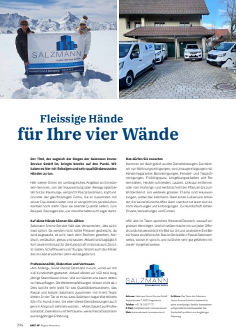 1206 BEST OF BEST OF Portrait xxx Region Winterthur Fleissige H%u00e4nde f%u00fcr Ihre vier W%u00e4ndeAdresse: Salzmann Immo-Service GmbHAadorfstrasse 7, 8523 HagenbuchTelefon: +41 76 343 77 77E-Mail: info@salzmann-immoservice.chWeb: www.salzmann-immoservice.chIn K%u00fcrze: Das Team der Salzmann Immo-Service GmbH ist bekannt f%u00fcr seine zuverl%u00e4ssige, flexible, kompetente und gr%u00fcndliche Arbeitsqualit%u00e4t. Die Kundschaft profi tiert von langj%u00e4hriger Erfahrung. Der Titel, der zugleich der Slogan der Salzmann ImmoService GmbH ist, bringts bereits auf den Punkt. Wir haben es hier mit fleissigen und sehr qualit%u00e4tsbewussten H%u00e4nden zu tun.%u00abWir bieten Ihnen ein umfangreiches Angebot an Immobilien-Services, von der Hauswartung %u00fcber Reinigungsarbeiten bis zur R%u00e4umung%u00bb, verspricht Pascal Salzmann, Kopf und Gr%u00fcnder der gleichnamigen Firma, die er zusammen mit seiner Frau Katalin leitet. Und er verspricht im pers%u00f6nlichen Kontakt noch mehr. Dass sie oberste Qualit%u00e4t liefern, zum Beispiel. Das sagen alle, und manche halten sich sogar daran. Auf diese H%u00e4nde k%u00f6nnen Sie z%u00e4hlenSalzmann Immo-Service h%u00e4lt das Versprechen, das sp%u00fcrt man sofort. Da werden nicht hohle Phrasen gedrescht, da wird zugepackt, es wird nach dem Rechten gesehen. Akribisch, verl%u00e4sslich, genau und sauber. Aktuell sind tagt%u00e4glich f%u00fcnf Leute im Einsatz f%u00fcr die Kundschaft im Grossraum Z%u00fcrich, St. Gallen, Schaffhausen und Thurgau. Womit auch das R%u00e4tsel der im Lead erw%u00e4hnten zehn H%u00e4nde gel%u00f6st ist.Professionalit%u00e4t, Diskretion und Vertrauen%u00abAm Anfang%u00bb, blickt Pascal Salzmann zur%u00fcck, %u00absind wir mit null Kundschaft gestartet. Aktuell z%u00e4hlen wir 150 teils langj%u00e4hrige Stammkund:innen. Und wir k%u00f6nnen uns kaum retten vor Neuanfragen. Die Weiterempfehlungen reissen nicht ab.%u00bb Dies spricht sehr wohl f%u00fcr das Qualit%u00e4tsbewusstsein, das Pascal und Katalin Salzmann zusammen mit ihrem Team bieten. In der Tat ist es so, dass Salzmann sogar Wartelisten f%u00fchrt f%u00fcr Kund:innen, die eben diese Dienstleistungen auch gern in Anspruch nehmen w%u00fcrden ... %u00abAlles basiert auf Professionalit%u00e4t, Diskretion und Vertrauen%u00bb, weiss Pascal Salzmann aus langj%u00e4hriger Erfahrung.Das d%u00fcrfen Sie erwartenKommen wir doch gleich zu den Dienstleistungen. Da reden wir von Wohnungsreinigungen, von Umzugsreinigungen mit Abnahmegarantie, B%u00fcroreinigungen, Fenster- und Teppichreinigungen, Fr%u00fchlingsputz, Umgebungsarbeiten wie Rasenm%u00e4hen, Hecken schneiden, Lauben, Unkraut entfernen oder vom Fr%u00fchlings- und Herbstschnitt der Pflanzen bis zum Winterdienst. Ein weiteres grosses Thema sind Hauswartungen, wobei das Salzmann-Team einen Fullservice anbietet, der keine W%u00fcnsche offen l%u00e4sst. Last but not least sind da noch R%u00e4umungen und Entsorgungen. Zur Kundschaft z%u00e4hlen Private, Verwaltungen und Firmen.%u00abWir alle im Team sprechen fliessend Deutsch, worauf wir grossen Wert legen. Und ich selber mache mir vor jeder Offerte zun%u00e4chst pers%u00f6nlich ein Bild vor Ort und analysiere Ihre Bed%u00fcrfnisse und W%u00fcnsche. Das ist Seriosit%u00e4t.%u00bb Pascal Salzmann weiss, wovon er spricht, und ist bisher sehr gut gefahren mit dieser Vorgehensweise.
