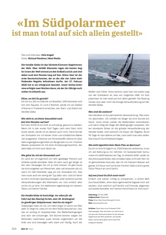 1210 BEST OF BEST OF PromiText und Intervie Felix Engeli Fotos: Richard Mardens / West MediaDie Vend%u00e9e Globe ist das h%u00e4rteste Einmann-Segelrennen der Welt. %u00dcber 44 000 Kilometer legen die besten Segler:innen der Welt einmal um den Erdball zur%u00fcck und sind dabei rund drei Monate lang auf See. Oliver Heer ist der erste Deutschschweizer, der an der alle vier Jahre stattfi ndenden Regatta teilnehmen durfte. Am 17. Februar 2025 hat er sie erfolgreich beendet. Unser Online-Interview erfolgte zwei Wochen davor, als der 36-J%u00e4hrige noch mitten im Atlantik war.Oliver, wo bist Du gerade?Ich bin zur Zeit im Atlantik vor Brasilien, 500 Kilometer s%u00fcdlich vom %u00c4quator. In rund 2 Wochen werde ich Les Sablesd%u2019Olonne in Frankreich erreichen, den Start- und Zielort der Vend%u00e9e Globe.Wie steht es um Deine Gesundheit nach fast drei Monaten auf See?Auf dem Schiff ist es nicht so schwierig, gesund zu bleiben. Wenn ich in den ersten f%u00fcnf Tagen nach dem Start nicht krank werde, werde ich es danach auch nicht. Denn fernab der Zivilisation bin ich keinen Viren und sch%u00e4dlichen Bakterien ausgesetzt. Vitamine und Mineralstoffe nehme ich %u00fcber Nahrungserg%u00e4nzungsmittel von Burgerstein zu mir. Frisches Wasser produziere ich mit einer Entsalzungsmaschine. Verletzt habe ich mich zum Gl%u00fcck nie.Wie gehst Du mit der Einsamkeit um?An Land bin ich eigentlich ein sehr geselliger Mensch und sch%u00e4tze soziale Kontakte. Aber ich kann auch gut l%u00e4nger allein sein. Deswegen bin ich ja nicht einsam. Es gibt Leute, die sind umgeben von Menschen, aber viel einsamer als ich, wenn ich 500 Kilometer weg von der Zivilisation bin. Klar, man muss auch ein wenig der Typ daf%u00fcr sein. Und ich bereite mich mit einem Sportpsychologen unter anderem auf die Herausforderungen des Alleinseins vor. Und wirklich alleine bin ich ja nicht. Ich telefoniere regelm%u00e4ssig mit meinem Team und meiner Familie.Die Vend%u00e9e Globe ist ber%u00fcchtigt. Vor allem f%u00fcr die Fahrt auf den Roaring Forties, dem 40. Breitengrad im gewittrigen S%u00fcdpolarmeer. Hast Du nie Angst?Todesangst habe ich nie. Ich habe Angst im Sinne von Respekt. Er zeigt mir, dass ich mir dem Risiko bewusst bin. Und das ist wichtig im S%u00fcdpolarmeer. Die Wetterbedingungen sind dort viel schwieriger. Die St%u00fcrme k%u00f6nnen wegen der fehlenden Landmasse quasi einmal ungehindert um die Erde und sind deswegen sehr stark und h%u00e4ufi g. Auch die Wellen sind h%u00f6her. Hinzu kommt, dass man viel weiter weg von der Zivilisation ist, also von m%u00f6glicher Hilfe. Im S%u00fcdpolarmeer ist man total auf sich allein gestellt. Die Roaring Forties sind aber nicht die einzige Herausforderung auf der Vend%u00e9e Globe.Was sind die anderen?Das H%u00e4rteste ist die permanente Verantwortung. Man kann nie abschalten. Ich schlafe nie l%u00e4nger als eine Stunde am St%u00fcck, muss immer wieder die Wetterdaten kontrollieren und wenn n%u00f6tig die Segel den Bedingungen anpassen. Dieser konstante Stress ist die gr%u00f6sste Herausforderung der Vend%u00e9e Globe. Und nat%u00fcrlich die Dauer der Regatta. Rund 90 Tage ist man alleine auf See, Land sieht man sehr selten. Das braucht Durchhalteverm%u00f6gen. Wie sieht eigentlich Dein Men%u00fc-Plan an Bord aus? Da ich im Schnitt t%u00e4glich ca. 5500 Kalorien verbrenne, muss ich viel Nahrung zu mir nehmen. Im S%u00fcdpolarmeer konsumiere ich 6000 Kalorien am Tag, im Atlantik 4500. Leider ist das Astronautenfutter, das ich dabei habe, nicht sehr fein. Es ist getrocknetes Granulat, das ich mit heissem Wasser aufgiesse. Ich freue mich auf einen frischen Salat und ein gutes St%u00fcck Fleisch an Land (lacht).Auf was freust Du Dich sonst noch?Endlich mal wieder richtig zu entspannen, in einem Bett durchzuschlafen, ohne dass irgendwelche Signale mich aufwecken. Und nat%u00fcrlich auf Familie und Freunde, allgemein auf soziale Kontakte. Auf meinen Hund freue ich mich auch.Geburtstag: 10. Mai 1988Aufgewachsen: RapperswilFirma: Oliver Heer Ocean Racing AG, Z%u00fcrichWeb: www.oliverheer.comIn K%u00fcrze: Oliver Heer ist ein Schweizer Profi -Hochseesegler. %u00dcber die letzten vier Jahre hat er sich als erster Deutschschweizer f%u00fcr das h%u00e4rteste Segelrennen der Welt qualifi ziert, die Vend%u00e9e Globe, und hat diese gleich beim ersten Mal erfolgreich beendet. %u00abIm S%u00fcdpolarmeer ist man total auf sich allein gestellt%u00bb