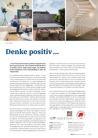 BEST OF Rund um den Z%u00fcrichsee BEST OF Portrait xxx 2131Adresse: stahl & form AGSchw%u00e4ntenmos 1, 8126 ZumikonTelefon: +41 44 521 85 85E-Mail: info@stahl-form.chWeb: www.stahl-form.chIn K%u00fcrze: Wir produzieren Tr%u00e4ume aus Feuer und Stahl und machen keine qualitativen Kompromisse. Dabei sind Dankbarkeit, Freiheit, Mut, Freude, Harmonie und Integrit%u00e4t die Werte, die unser Handeln leiten.%u2026 in der Theorie ist das einfach, praktisch umgesetzt kann das anspruchsvoll sein. Eine metallverarbeitende Firma in Zumikon und ihr junger Patron zeigen, wie positives Denken funktioniert und im Betriebsalltag zu tollen Resultaten f%u00fchrt. Eine spektakul%u00e4re Wendeltreppe sollte es werden %u2013 an der Aussenfront eines Einfamilienhauses: In der Planung knifflig, in der Umsetzung galt es f%u00fcr stahl & form AG viel handwerkliche Expertise zu mobilisieren. Ein junger ehrgeiziger Mitarbeiter wollte das Projekt leiten. Anderswo w%u00e4re man wohl nicht auf dessen Wunsch eingegangen %u2013 zu ambitioniert als erste Projektleitung. Doch Inhaber Roland Zurgilgen sprach dem Kollegen das Vertrauen aus. Nicht aus Naivit%u00e4t, sondern weil der Patron vertraute. %u00abEr wollte es unbedingt. Und ich wusste, dass er parat war.%u00bb W%u00e4re es in die Hose gegangen, w%u00e4ren die Kosten betr%u00e4chtlich gewesen. Das tat es aber nicht: %u00abDer Kunde war hochzufrieden.%u00bb Dahinter steckt eine Absage an den Pessimismus, bei dem man %u00fcberall nur Probleme sieht. %u00abStattdessen funktionieren wir nach dem Prinzip: Wer Vertrauen schenkt, wird belohnt.%u00bb Es ist die Basis f%u00fcr einen Betrieb dessen Wurzeln bis ins 19. Jahrhundert zur%u00fcckf%u00fchren.Ein Eduard Schnorf war ab 1883 in Zumikon als Dorfschmied t%u00e4tig. Die Nachfolger:innen bauten das Angebot in den folgenden eineinhalb Jahrhunderten stetig aus. Heute sind Metalltreppen, Brunnen, Stahlbauten, Fassaden, Gel%u00e4nder wie auch Chromstahlarbeiten von stahl & form AG veritable Hingucker. Die Firma fertigt M%u00f6bel, Kunstobjekte f%u00fcr den Garten, unverw%u00fcstliche Gel%u00e4nder und kombiniert Metall mit anderen Materialien wie z. B. Glas zu Bijou-Winterg%u00e4rten. Zahlreiche T%u00fcren, Tore und Vord%u00e4cher aus Zumikon sorgen f%u00fcr Wertigkeit bei Ein- und Mehrfamilienh%u00e4usern sowie Gewerbebauten. Selbstverst%u00e4ndlich setzt man bei der Produktion mittlerweile auf modernste digitale Mittel. Doch etwas ist Denke positiv %u2026geblieben: %u00abWir beherrschen noch die alte Handwerkskunst des Schmiedens%u00bb, so Roland Zurgilgen. Sein Stolz gilt neben dieser Kompetenz auch seinem Team. F%u00fcr dieses f%u00fchlt er sich verantwortlich %u2013 wie ein moderner Patron eben. %u00abWer ein Kind auf die Welt setzt, %u00fcbernimmt lebenslange Verantwortung. %u00c4hnlich sehe ich meine Firma: Ich bin f%u00fcr meine Mitarbeitenden da %u2013 in guten, wie in schlechten Zeiten.%u00bb Man sp%u00fcrt bei ihm, dass das Credo %u00abwir sind eine Familie%u00bb keine Phrase ist. Doch im Unterschied zu einer %u00abnormalen%u00bb Familie, in der die Liebe der Eltern zu den Kindern bedingungslos ist, gibt es bei stahl & form AG nat%u00fcrlich klare Erwartungen %u2013 jeder muss seinen Beitrag zur Firma leisten. Auch die Lernenden %u2026%u00abJa, ich habe eine klare Linie%u00bb, gibt Roland Zurgilgen gerne zu. Neben dem Aneignen von einschl%u00e4giger Expertise legt er auch Wert auf gute Umgangsformen und ein gepflegtes Auftreten: Und selbstverst%u00e4ndlich ist es ihm wichtig, dass die Lernenden schulisch am Ball bleiben. %u00ab%u00dcber gute Noten freue ich mich, wenn sie weniger gut sind, b%u00fcffle ich mit den Lernenden nach Feierabend.%u00bb Mit Erfolg: bei den Abschlusspr%u00fcfungen geh%u00f6ren die Auszubildenden von stahl & form AG regelm%u00e4ssig zur kantonalen Spitze. Dies dank viel Einsatz und %u2013 ganz genau %u2013 positivem Denken. Roland Zurgilgen