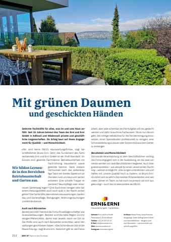 1214 BEST OF BEST OF Portrait xxx Rund um den Z%u00fcrichseeAdresse: Erni und Erni GmbHPoststrasse 4, 8134 AdliswilTelefon: +41 43 537 42 14E-Mail: info@erniunderni.chWeb: www.erniunderni.chInstagram: erniundernigmbhIn K%u00fcrze: Kleine Firma, kurze Entscheidungswege: Jeder Auftrag kommt direkt zum Gesch%u00e4ftsf%u00fchrer %u2013 %u00fcbrigens auch nach B%u00fcrozeiten %u2013 und wird direkt und schnell ausgef%u00fchrt. Gelernte Fachkr%u00e4fte f%u00fcr alles, was im und ums Haus anf%u00e4llt: Seit 15 Jahren betreut das Team der Erni und Erni GmbH in Adliswil und W%u00e4denswil private und gesch%u00e4ftliche Liegenschaften. Ihr Erfolg baut auf ihrem Engagement f%u00fcr Qualit%u00e4t %u2013 und Menschlichkeit.%u00abWir sind keine 08/15 Hauswartungsfi rma%u00bb, sagt Gesch%u00e4ftsf%u00fchrer Bruno Erni. Denn das Fundament des Familienbetriebs Erni und Erni GmbH ist der Profi -Standard: Im Einsatz sind gelernte Fachm%u00e4nner Betriebsunterhalt mit Fachrichtung Hausdienst sowie gelernte G%u00e4rtner. Dank diesem Fachwissen kann das siebenk%u00f6pfi ge Team ein breites Spektrum an Diensten rund um Haus und Garten anbieten: Eine schiefe Treppe reparieren? Baumpflege oder einen neuen Gartenweg legen? Eine Dachrinne reinigen oder bei einem Heizungsdefekt auch noch sp%u00e4t in der Nacht vorbeigehen? Die Fachkr%u00e4fte %u00fcbernehmen Hauswartungen, Gartenbau und Gartenpflege, Reinigungen, Wohnungsr%u00e4umungen und Winterdienste.Auch nach B%u00fcrozeitenBereits seit 2007 betreut die Firma Privatliegenschaften wie Gross%u00fcberbauungen. Bedient wird die nahe Region Z%u00fcrich/Horgen/Meilen/Albis, damit man jeweils rasch vor Ort ist. Die Profi s sind auch nach B%u00fcrozeiten erreichbar, wenn Verwaltungen geschlossen haben. %u00abDas Sch%u00f6nste am Job ist die Abwechslung%u00bb, sagt Bruno Erni. Nat%u00fcrlich gibt es viel FleissMit gr%u00fcnen Daumen und geschickten H%u00e4ndenarbeit, aber jede scheinbar leichte Aufgabe will neu gedacht werden und daf%u00fcr braucht es Fachwissen. Ob es nun darum geht, die richtige Hebeb%u00fchne f%u00fcr die Fensterreinigung einzusetzen, einen Spezialboden professionell zu reinigen, eine Schutzabdeckung zu bauen oder Sonderm%u00fcll aus dem Garten zu entsorgen. Berufsstolz und MenschlichkeitDie soziale Verantwortung ist dem Gesch%u00e4ftsf%u00fchrer wichtig. Die Firma engagiert sich in der Ausbildung, ein bis zwei Lernende werden von zwei Berufsbildnern begleitet. Auch Integrationspraktika %u2013 wie aktuell f%u00fcr einen ukrainischen Fl%u00fcchtling %u2013 werden erm%u00f6glicht. %u00abDie Jungen unterst%u00fctzen uns und helfen mit, unsere Qualit%u00e4t hoch zu halten%u00bb, so Bruno Erni: %u00abEs lohnt sich so sehr!%u00bb Die meisten Mitarbeitenden sind seit vielen Jahren im Team, es hat noch nie jemand von sich aus gek%u00fcndigt %u2013 auch das ist alles andere als 08/15.Wir bilden Lernende in den Bereichen Betriebsunterhalt und Garten aus.