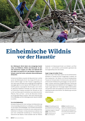 1216 BEST OF BEST OF Portrait xxx Rund um den Z%u00fcrichseeEinheimische Wildnis vor der Haust%u00fcrAdresse: Stiftung Wildnispark Z%u00fcrichAlte Sihltalstrasse 38, 8135 SihlwaldBitte beachten Sie, dass sich der Tierpark Langenberg in Langnau%u00a0a.%u00a0A. befi ndet!Telefon: +41 44 722 55 22E-Mail: info@wildnispark.chWeb: www.wildnispark.chIn K%u00fcrze: Anstatt Affe, L%u00f6we und Pinguin sind im Wildnispark Z%u00fcrich einheimische sowie ehemals einheimische Tiere anzutreffen. Nur 25 Minuten von Z%u00fcrich entfernt k%u00f6nnen Wildtiere in grossen, naturnahen Anlagen beobachtet werden.Der Wildnispark Z%u00fcrich bietet eine einzigartige Kombination aus Wildtieren, Wildnis und Naturwald. An den zwei Standorten Langnau am Albis und Sihlwald k%u00f6nnen G%u00e4ste von jung bis alt in den %u00e4ltesten Tierpark der Schweiz sowie den ersten nationalen Naturerlebnispark eintauchen.Einheimische Wildnis erwartet die Besucherinnen und Besucher des Wildnisparks Z%u00fcrich. Nur knapp 25 Minuten von Z%u00fcrich entfernt liegen mit dem Tierpark Langenberg und dem Naturwald Sihlwald zwei einzigartige Wildnisgebiete sozusagen gleich vor der Haust%u00fcr. Der Sihlwald ist ein rund 1100 ha grosser urspr%u00fcnglicher Buchenwald, wie er fr%u00fcher im gesamten Mittelland verbreitet war. Dank dem Schutz der nat%u00fcrlichen Prozesse verwildert der Sihlwald von Jahr zu Jahr zum Naturwald. Es entstehen neue Lebensr%u00e4ume f%u00fcr Pflanzen, Pilze und Tiere %u2013 und f%u00fcr den Menschen entsteht ein einzigartiges Wildnis-Erlebnis. %u00dcber 82 km Wanderwege, 57 km Radwege und 52 km Reitwege warten darauf, entdeckt zu werden.Tor in die WaldwildnisAls bester Startpunkt f%u00fcr einen Ausflug in die Waldwildnis eignet sich das Besucherzentrum in Sihlwald, nur f%u00fcnf Minuten von der Station Sihlwald gelegen. Dort erhalten Interessierte jegliche Informationen und Karten f%u00fcr einen erlebnisreichen Aufenthalt im Sihlwald. Im Besucherzentrum befi ndet sich auch eine umfassende Ausstellung zur Entwicklung und Geschichte des Waldes. Direkt daneben l%u00e4dt der WildnisSpielplatz mit Wasserspiel Kinder zum Klettern und Planschen ein %u2013 und die Eltern und Grosseltern geniessen das beruhigende Rauschen des Flusses. Auge in Auge mit wilden TierenFast schon wie in freier Natur lassen sich die einheimischen Wildtiere im Tierpark auf dem Langenberg in Langnau am Albis beobachten. Der %u00e4lteste und fl%u00e4chenm%u00e4ssig gr%u00f6sste Tierpark der Schweiz bietet 19 einheimischen oder ehemals einheimischen Wildtierarten gross z%u00fcgige und naturnahe Anlagen. In dieser nat%u00fcrlichen Umgebung tauchen Tierfreunde in die Lebensr%u00e4ume der Wildtiere ein und begegnen ihnen Auge in Auge. Neben den Tieranlagen zeigen Erlebniswelten wie das M%u00fcsli-H%u00fcsli, die mongolische Jurte oder der Knochenwald Spannendes zu der Mensch-Tier-Beziehung in verschiedenen Kulturen.