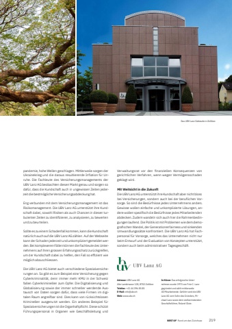 BEST OF Rund um den Z%u00fcrichsee BEST OF Portrait xxx 2192Adresse: UBV Lanz AGAlte Landstrasse 128, 8702 ZollikonTelefon: +41 44 396 85 85E-Mail: info@ubv.chWeb: www.ubv.chIn K%u00fcrze: Das erfolgreiche Unternehmen wurde 1973 von Fritz C.%u00a0Lanz gegr%u00fcndet und z%u00e4hlt mittlerweile 40%u00a0Mitarbei tende. Gef%u00fchrt wird die UBV Lanz AG vom Sohn des Gr%u00fcnders, Michael Lanz sowie dem stellvertretenden Gesch%u00e4ftsf%u00fchrer, Roland Glutz.pandemie, hohe Wellen geschlagen. Mittlerweile sorgen der Ukrainekrieg und die daraus resultierende Inflation f%u00fcr Unruhe. Die Fachleute des Versicherungsmanagements der UBV%u00a0Lanz AG beobachten diesen Markt genau und sorgen so daf%u00fcr, dass die Kundschaft auch in ungewissen Zeiten jederzeit die bestm%u00f6gliche Versicherungsabdeckung hat. Eng verbunden mit dem Versicherungsmanagement ist das Risikomanagement. Die UBV Lanz AG unterst%u00fctzt ihre Kundschaft dabei, sowohl Risiken als auch Chancen in diesen turbulenten Zeiten zu identifi zieren, zu analysieren, zu bewerten und zu beurteilen. Sollte es zu einem Schadenfall kommen, kann die Kundschaft nat%u00fcrlich auch auf die UBV Lanz AG z%u00e4hlen. Auf der Webseite kann der Schaden jederzeit und unkompliziert gemeldet werden. Bei komplexeren F%u00e4llen k%u00f6nnen die Fachleute des Unternehmens auf ihren grossen Erfahrungsschatz zur%u00fcckgreifen, um der Kundschaft dabei zu helfen, den Fall so effi zient wie m%u00f6glich abzuschliessen. Die UBV Lanz AG bietet auch verschiedene Spezialversicherungen an. So gibt es zum Beispiel eine Versicherung gegen Cyberkriminalit%u00e4t, denn immer mehr KMU in der Schweiz fallen Cyberkriminellen zum Opfer. Die Digitalisierung und Globalisierung sowie der immer schneller werdende Austausch von Daten sorgen daf%u00fcr, dass viele Firmen im digitalen Raum angreifbar sind. Dies kann von r%u00fccksichtslosen Kriminellen ausgenutzt werden. Ein anderes Beispiel f%u00fcr Spezialversicherungen ist die Organhaftpflicht. Diese sch%u00fctzt F%u00fchrungspersonal in Organen wie Gesch%u00e4ftsleitung und Verwaltungsrat vor den fi nanziellen Konsequenzen von gerichtlichen Verfahren, wenn wegen Verm%u00f6gensschaden geklagt wird. Mit Weitsicht in die ZukunftDie UBV Lanz AG unterst%u00fctzt ihre Kundschaft aber nicht bloss bei Versicherungen, sondern auch bei der beruflichen Vorsorge. So sind die Bed%u00fcrfnisse jedes Unternehmens anders. Gewisse wollen einfache und unkomplizierte L%u00f6sungen, andere wollen spezifi sch die Bed%u00fcrfnisse jedes Mitarbeitenden abdecken. Zudem wandeln sich auch hier die Rahmenbedingungen laufend. Die Politik ist mit Problemen wie dem demografi schen Wandel, der Generationenfairness und sinkenden Umwandlungss%u00e4tze konfrontiert. Die UBV Lanz AG hat Fachpersonal f%u00fcr Vorsorge, welches das Unternehmen nicht nur beim Entwurf und der Evaluation von Konzepten unterst%u00fctzt, sondern auch beim administrativen Tagesgesch%u00e4ft. Das UBV Lanz Geb%u00e4ude in Zollikon