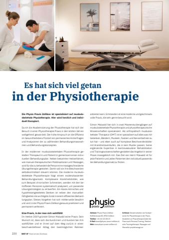 1220 BEST OF Portrait xxxAdresse: Physio Praxis ZollikonRotfluhstrasse 83, 8702 ZollikonTelefon: +41 44 221 00 23E-Mail: team@physio-praxis-zollikon.chWeb: www.physio-praxis-zollikon.chIn K%u00fcrze: Derweil arbeiten vier Fachpersonen f%u00fcr Physiotherapie in der Praxis. Zus%u00e4tzlich zur Physiotherapie bietet die Praxis auch Personal Training, Medizinische Trainingstherapie, Massagen und Manuelle Lymphdrainage an. Die Physio Praxis Zollikon ist spezialisiert auf muskuloskelettale Physiotherapie. Hier wird herzlich und individuell therapiert.Durch die Akademisierung der Physiotherapie hat sich der Besuch in einer Physiotherapie Praxis in den letzten Jahren weitgehend gewandelt. Der hohe Anspruch an die Effi zienz im Gesundheitsberuf fordert ein permanentes Hinterfragen und Analysieren der zu w%u00e4hlenden Behandlungsmassnahmen und Behandlungskonzepten.In der modernen muskuloskelettalen Physiotherapie gestalten Therapeut:in und Patient:in gemeinsam einen individuellen Behandlungsplan. Neben bekannten Heilverfahren, wie manual-therapeutischen Mobilisationen und Massagen, wird f%u00fcr die zu behandelnde Person eine massgeschneiderte %u00dcbungstherapie gestaltet. Damit soll sie ihre Beschwerden selbstkontrolliert steuern k%u00f6nnen. Die moderne muskuloskelettale Physiotherapie folgt einem evidenzbasierten Behandlungsansatz. Komplexere Krankheitsbilder, wie zum Beispiel chronischen Schmerzen, werden mit den betroffenen Personen systematisch analysiert, um passende L%u00f6sungsstrategien zu entwerfen. Ein klares klinisches und hypothesengeleitetes Denken ist neben den manuellen F%u00e4higkeiten die wichtigste Zutat in einem effi zienten Behandlungsplan. Dieses Vorgehen hat sich mittlerweile bew%u00e4hrt und wird in der Physio Praxis Zollikon genauso praktiziert und permanent verfeinert.Eine Praxis, in der man sich wohlf%u00fchltIm Herbst 2019 gr%u00fcndet Simon Maiwald seine Praxis. Sein Wunsch ist, dass sich die Kundinnen und Kunden bei ihm wohlf%u00fchlen und er ihnen auf dem Weg zur%u00fcck in einen beschwerdefreien Alltag den bestm%u00f6glichen Rahmen Es hat sich viel getanin der Physiotherapieanbieten kann. Entstanden ist eine moderne und geschmackvolle Praxis, die sehr gerne besucht wird.Simon Maiwald hat sich in zwei Masterstudieng%u00e4ngen auf muskuloskelettale Physiotherapie und physiotherapeutische Wissenschaften spezialisiert. Als orthop%u00e4disch muskuloskettaler Therapeut (OMT) ist er spezialisert auf alles was mit Gelenken, B%u00e4ndern, Muskeln, Faszien und Nervenbahnen zu tun hat %u2013 und eben auch auf komplexe Beschwerdenbilder mit Krankheitsverl%u00e4ufen, die in kein Muster passen. Seine erg%u00e4nzende Expertise in kardiovaskul%u00e4rer Rehabilitation und Trainingswissenschaften gestalten das Angebot in seiner Praxis massgeblich mit. Das Ziel von Herrn Maiwald ist f%u00fcr jede Patientin und jeden Patienten den individuell passendsten Behandlungsansatz zu fi nden. BEST OF Rund um den Z%u00fcrichsee