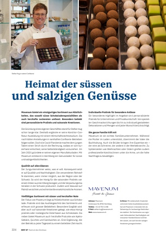1224 BEST OF Portrait xxxAdresse: MavenumGr%u00fctstrasse 56, 8704 HerrlibergTelefon: +41 44 922 12 88E-Mail: stefan.hug@mavenum.chWeb: www.mavenum.chIn K%u00fcrze: Mit Leidenschaft, Kreativit%u00e4t und einem hohen Qualit%u00e4tsbewusstsein hat sich Mavenum in k%u00fcrzester Zeit als Geheimtipp f%u00fcr hochwertige K%u00f6stlichkeiten etabliert. Die Kombination aus regionaler Verbundenheit, Nachhaltigkeit und innovativer Handwerkskunst wird bei den s%u00fcssen, wie auch bei den salzigen Kreationen grossgeschrieben. Mavenum bietet ein einzigartiges Sortiment aus K%u00f6stlichkeiten, das sowohl s%u00fcsse Schokoladenspezialit%u00e4ten als auch herzhafte Leckereien umfasst. Besonders beliebt sind personalisierte Pralin%u00e9s und saisonale Kreationen.Die Gr%u00fcndung eines eigenen Gesch%u00e4ftes stand f%u00fcr Stefan Hug schon lange klar. Deshalb erg%u00e4nzte er seine Konditor-Confi seur-Ausbildung mit einem Wirtschaftsrechtsstudium. Danach h%u00e4tten Anstellungen in namhaften Confi serie-Betrieben folgen sollen. Doch die Covid-Pandemie machte dem jungen Talent einen Strich durch die Rechnung, sodass er sich kurzerhand entschied, seine Selbstst%u00e4ndigkeit vorzuziehen. Im Jahr 2021 gr%u00fcndete er seinen eigenen Manufakturladen. Mit Mavenum entstand in Herrliberg ein Genussladen f%u00fcr s%u00fcsse und salzige K%u00f6stlichkeiten. Qualit%u00e4t auf allen Ebenen Der Jungunternehmer weiss, was er will. Konsequent setzt er auf Qualit%u00e4t und Nachhaltigkeit. Die verwendeten Rohstoffe stammen, wenn immer m%u00f6glich, aus der Region oder der Schweiz. So wird der Honig f%u00fcr die saisonalen Pralin%u00e9s von einem Imker aus Herrliberg bezogen und die Verpackungsmaterialien in der Schweiz produziert. Zudem wird bewusst auf Palm%u00f6l verzichtet und echte Vanille ersetzt k%u00fcnstliche Aromen. Vielf%u00e4ltiges Sortiment mit s%u00fcsser und herzhafter Note Der Fokus von Mavenum liegt auf K%u00f6stlichkeiten aus Schokolade. Pralin%u00e9s sind das Aush%u00e4ngeschild des Sortiments und erfreuen sich grosser Beliebtheit. Besondere Sorgfalt wird aber auch auf saisonale Kreationen gelegt, wie etwa Honigpralin%u00e9s oder nostalgische Osterhasen aus Schokolade. Daneben bietet Mavenum auch herzhafte Produkte wie Ap%u00e9roGeb%u00e4ck, Quiches und Sandwiches an. Eine Erg%u00e4nzung, die den Betrieb zu jeder Tageszeit zu einem beliebten Ziel macht. Heimat der s%u00fcssen und salzigen Gen%u00fcsseIndividuelle Pralin%u00e9s f%u00fcr besondere Anl%u00e4sseEin besonderes Highlight im Angebot sind personalisierte Pralin%u00e9s f%u00fcr Unternehmen und Privatkundschaft. Von speziellen Geschmacksrichtungen bis hin zu individuell gestalteten Dekorationen und Mengen wird jeder Wunsch ber%u00fccksichtigt. Die ganze Familie hilft mitMavenum ist ein echtes Familienunternehmen. W%u00e4hrend die Mutter im Laden unterst%u00fctzt, %u00fcbernimmt der Vater die Buchhaltung. Auch die Br%u00fcder bringen ihre Expertise ein %u2013 der eine als Schreiner, der andere in der Werbebranche. Zu Spitzenzeiten wie Weihnachten oder Ostern greifen zudem professionelle Konditor/innen unter die Arme, um die hohe Nachfrage zu bew%u00e4ltigen. Stefan Hug in seiner Confi serieBEST OF Rund um den Z%u00fcrichsee