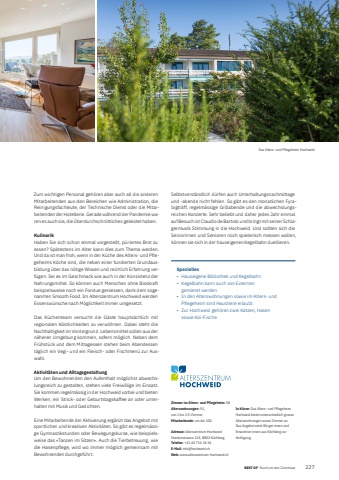 BEST OF Rund um den Z%u00fcrichsee BEST OF Portrait xxx 2272Zimmer im Alters- und Pflegeheim: 58Alterswohnungen: 53, von 1 bis 3.5-ZimmerMitarbeitende: um die 100Adresse: Alterszentrum HochweidStockenstrasse 124, 8802 KilchbergTelefon: +41 44 716 36 36E-Mail: info@hochweid.chWeb: www.alterszentrum-hochweid.chIn K%u00fcrze: Das Alters- und Pflegeheim Hochweid bietet unterschiedlich grosse Alterswohnungen sowie Zimmer an. Das Angebot steht B%u00fcrger:innen und Einwohner:innen aus Kilchberg zur Verf%u00fcgung. Zum wichtigen Personal geh%u00f6ren aber auch all die anderen Mitarbeitenden aus den Bereichen wie Administration, die Reinigungsfachleute, der Technische Dienst oder die Mitarbeitenden der Hotellerie. Gerade w%u00e4hrend der Pandemie waren es auch sie, die %u00dcberdurchschnittliches geleistet haben. KulinarikHaben Sie sich schon einmal vorgestellt, p%u00fcriertes Brot zu essen? Sp%u00e4testens im Alter kann dies zum Thema werden. Und da ist man froh, wenn in der K%u00fcche des Alters- und Pflegeheims K%u00f6che sind, die neben einer fundierten Grundausbildung %u00fcber das n%u00f6tige Wissen und reichlich Erfahrung verf%u00fcgen. Sei es im Geschmack wie auch in der Konsistenz der Nahrungsmittel. So k%u00f6nnen auch Menschen ohne Bisskraft beispielsweise noch ein Fondue geniessen, dank dem sogenannten Smooth Food. Im Alterszentrum Hochweid werden Essensw%u00fcnsche nach M%u00f6glichkeit immer umgesetzt. Das K%u00fcchenteam versucht die G%u00e4ste haupts%u00e4chlich mit regionalen K%u00f6stlichkeiten zu verw%u00f6hnen. Dabei steht die Nach haltigkeit im Vordergrund. Lebensmittel sollen aus der n%u00e4heren Umgebung kommen, sofern m%u00f6glich. Neben dem Fr%u00fchst%u00fcck und dem Mittagessen stehen beim Abendessen t%u00e4glich ein Vegi- und ein Fleisch- oder Fischmen%u00fc zur Auswahl. Aktivit%u00e4ten und AlltagsgestaltungUm den Bewohnenden den Aufenthalt m%u00f6glichst abwechslungsreich zu gestalten, stehen viele Freiwillige im Einsatz. Sie kommen regelm%u00e4ssig in der Hochweid vorbei und bieten Werken, ein Strick- oder Geburtstagskaffee an oder unterhalten mit Musik und Gedichten. Eine Mitarbeitende der Aktivierung erg%u00e4nzt das Angebot mit sportlichen und kreativen Aktivit%u00e4ten. So gibt es regelm%u00e4ssige Gymnastikstunden oder Bewegungskurse, wie beispielsweise das %u00abTanzen im Sitzen%u00bb. Auch die Tierbetreuung, wie die Hasenpflege, wird wo immer m%u00f6glich gemeinsam mit Bewohnenden durchgef%u00fchrt.Selbstverst%u00e4ndlich d%u00fcrfen auch Unterhaltungsnachmittage und -abende nicht fehlen. So gibt es den monatlichen Fyrabigtr%u00e4ff, regelm%u00e4ssige Grillabende und die abwechslungsreichen Konzerte. Sehr beliebt und daher jedes Jahr einmal auf Besuch ist Claudio de Bartolo und bringt mit seiner Schlagermusik Stimmung in die Hochweid. Und sollten sich die Seniorinnen und Senioren noch spielerisch messen wollen, k%u00f6nnen sie sich in der hauseigenen Kegelbahn duellieren.Spezielles%u2022 Hauseigene Bibliothek und Kegelbahn%u2022 Kegelbahn kann auch von Externen gemietet werden%u2022 In den Alterswohnungen sowie im Alters- und Pflegeheim sind Haustiere erlaubt%u2022 Zur Hochweid geh%u00f6ren zwei Katzen, Hasen sowie Koi-FischeDas Alters- und Pflegeheim Hochweid