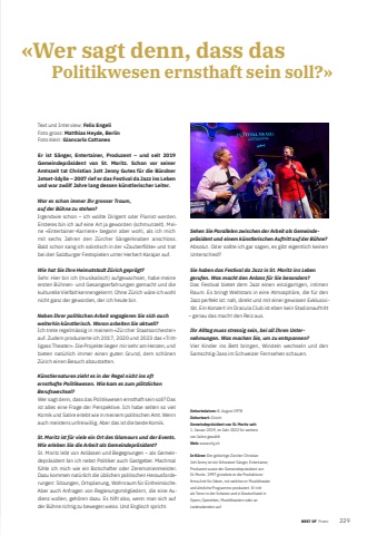 BEST OF BEST OF Promi 2292Text und Intervie Felix Engeli Foto gross: Matthias Heyde, BerlinFoto klein: Giancarlo CattaneoEr ist S%u00e4nger, Entertainer, Produzent %u2013 und seit 2019 Gemeindepr%u00e4sident von St.%u00a0 Moritz. Schon vor seiner Amtszeit tat Christian Jott Jenny Gutes f%u00fcr die B%u00fcndner Jetset-Idylle %u2013 2007 rief er das Festival da Jazz ins Leben und war zw%u00f6lf Jahre lang dessen k%u00fcnstlerischer Leiter. War es schon immer Ihr grosser Traum, auf der B%u00fchne zu stehen?Irgendwie schon %u2013 ich wollte Dirigent oder Pianist werden. Ersteres bin ich auf eine Art ja geworden (schmunzelt). Meine %u00abEntertainer-Karriere%u00bb begann aber wohl, als ich mich mit sechs Jahren den Z%u00fcrcher S%u00e4ngerknaben anschloss. Bald schon sang ich solistisch in der %u00abZauberfl%u00f6te%u00bb und trat bei den Salzburger Festspielen unter Herbert Karajan auf.Wie hat Sie Ihre Heimatstadt Z%u00fcrich gepr%u00e4gt?Sehr. Hier bin ich (musikalisch) aufgewachsen, habe meine ersten B%u00fchnen- und Gesangserfahrungen gemacht und die kulturelle Vielfalt kennengelernt. Ohne Z%u00fcrich w%u00e4re ich wohl nicht ganz der geworden, der ich heute bin.Neben Ihrer politischen Arbeit engagieren Sie sich auch weiterhin k%u00fcnstlerisch. Woran arbeiten Sie aktuell?Ich trete regelm%u00e4ssig in meinem %u00abZ%u00fcrcher Staatsorchester%u00bb auf. Zudem produzierte ich 2017, 2020 und 2023 das %u00abTrittligass Theater%u00bb. Die Projekte liegen mir sehr am Herzen, und bieten nat%u00fcrlich immer einen guten Grund, dem sch%u00f6nen Z%u00fcrich einen Besuch abzustatten.K%u00fcnstlernaturen zieht es in der Regel nicht ins oft ernsthafte Politikwesen. Wie kam es zum pl%u00f6tzlichen Berufswechsel? Wer sagt denn, dass das Politikwesen ernsthaft sein soll? Das ist alles eine Frage der Perspektive. Ich habe selten so viel Komik und Satire erlebt wie in meinem politischen Amt. Wenn auch meistens unfreiwillig. Aber das ist die beste Komik.St. Moritz ist f%u00fcr viele ein Ort des Glamours und der Events. Wie erleben Sie die Arbeit als Gemeindepr%u00e4sident? St. Moritz lebt von Anl%u00e4ssen und Begegnungen %u2013 als Gemeindepr%u00e4sident bin ich nebst Politiker auch Gastgeber. Machmal f%u00fchle ich mich wie ein Botschafter oder Zeremonienmeister. Dazu kommen nat%u00fcrlich die %u00fcblichen politischen Herausforderungen: Sitzungen, Ortsplanung, Wohnraum f%u00fcr Einheimische. Aber auch Anfragen von Regierungsmitgliedern, die eine Audienz wollen, geh%u00f6ren dazu. Es hilft also, wenn man sich auf der B%u00fchne richtig zu bewegen weiss. Und Englisch spricht.Sehen Sie Parallelen zwischen der Arbeit als Gemeindepr%u00e4sident und einem k%u00fcnstlerischen Auftritt auf der B%u00fchne? Absolut. Oder sollte ich gar sagen, es gibt eigentlich keinen Unterschied?Sie haben das Festival da Jazz in St. Moritz ins Leben gerufen. Was macht den Anlass f%u00fcr Sie besonders? Das Festival bietet dem Jazz einen einzigartigen, intimen Raum. Es bringt Weltstars in eine Atmosph%u00e4re, die f%u00fcr den Jazz perfekt ist: nah, direkt und mit einer gewissen Exklusivit%u00e4t. Ein Konzert im Dracula Club ist eben kein Stadionauftritt %u2013 genau das macht den Reiz aus.Ihr Alltag muss stressig sein, bei all Ihren Unternehmungen. Was machen Sie, um zu entspannen? Vier Kinder ins Bett bringen, Windeln wechseln und den Samschtig-Jass im Schweizer Fernsehen schauen.Geburtsdatum: 8. August 1978Geburtsort: Z%u00fcrichGemeindepr%u00e4sident von St. Moritz seit: 1. Januar 2019, im Jahr 2022 f%u00fcr weitere vier Jahre gew%u00e4hltWeb: www.chjj.chIn K%u00fcrze: Der geb%u00fcrtige Z%u00fcrcher Christian Jott Jenny ist ein Schweizer S%u00e4nger, Entertainer, Produzent sowie der Gemeindepr%u00e4sident von St. Moritz. 1997 gr%u00fcndete er die Produktionsfi rma Amt f%u00fcr Ideen, mit welcher er Musiktheater und %u00e4hnliche Programme produziert. Er tritt als Tenor in der Schweiz und in Deutschland in Opern, Operetten, Musiktheatern oder an Liederabenden auf.%u00abWer sagt denn, dass das Politikwesen ernsthaft sein soll?%u00bb
