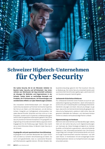 1230 BEST OF Portrait xxxSchweizer Hightech-Unternehmen f%u00fcr Cyber SecurityDie CyOne Security AG ist ein f%u00fchrender Anbieter im Bereich Cyber Security und IoT-Sicherheit. Das Unternehmen aus Steinhausen bei Zug entwickelt umfassende L%u00f6sungen f%u00fcr Beh%u00f6rden und Organisationen in der Schweiz. Zudem bietet es nachhaltige Konzepte und Produkte, die IT-Infrastrukturen, IoT-Anwendungen und sensible Daten effektiv vor Cyber-Bedrohungen sch%u00fctzen. Die innovativen Sicherheitskonzepte und -l%u00f6sungen der CyOne Security basieren auf h%u00f6chster technischer Expertise. Der Schutz von Daten und Informationen, um die Vertraulichkeit, Integrit%u00e4t und Verf%u00fcgbarkeit sicherzustellen, hat dabei oberste Priorit%u00e4t. Sicherheit wird hier nicht nur in den Produkten, sondern auch in Systemen und Netzwerken ganzheitlich %u00fcber den gesamten Lebenszyklus gedacht. Die CyOne Security kombiniert h%u00f6chste Kompetenz in Kryptografi e und Engineering mit kundenorientierter Betreuung sowie einem Engagement f%u00fcr die F%u00f6rderung junger Talente. Dies macht sie zu einem f%u00fchrenden Akteur im Bereich Cyber Security in der Schweiz. Kryptografi e und post-quantensichere Verschl%u00fcsselung Kryptografi e ist ein zentraler Bestandteil der Cyber-Sicherheit und dient zur sicheren Verschl%u00fcsselung von Daten. Dadurch wird gew%u00e4hrleistet, dass nur autorisierte Personen auf Informationen zugreifen k%u00f6nnen. Mit dem Zeitalter des Quantencomputings gewinnt die Post Quantum Security an Bedeutung. Die CyOne Security entwickelt bereits postquantensichere Verschl%u00fcsselungsl%u00f6sungen, welche als nicht von Quantencomputern bedroht gelten. Umfassende SicherheitsarchitekturenF%u00fcr umfassende Sicherheit eines Produkts ist auch ein spezialisiertes Engineering erforderlich, damit Informationen sicher sind und im Gesamtsystem zuverl%u00e4ssig funktionieren. S%u00e4mtliche L%u00f6sungen sind dank %u00abSecurity by Design%u00bb so gebaut, dass sie f%u00fcr die h%u00f6chste Sicherheitsstufe geeignet sind. %u00abSecurity by Deployment%u00bb wiederum stellt sicher, dass die gesamte Lieferkette der Software- und Hardware-Komponenten nur absolut vertrauensw%u00fcrdige Partner umfasst.Eigenentwicklung von Hardware W%u00e4hrend viele Unternehmen auf Standardl%u00f6sungen setzen, hebt sich die CyOne Security durch Eigenentwicklungen von Hardware ab. Diese Strategie erm%u00f6glicht es, h%u00f6chste Qualit%u00e4t und Sicherheit zu garantieren, was entscheidende Faktoren in der Informationssicherheit sind. Die Entwicklung erfolgt nach strengen Sicherheitsstandards und durch eine enge Zusammenarbeit zwischen Hardware- und Software-Teams. In Kombination mit den einzigartigen Sicherheitskompetenzen k%u00f6nnen so hochperformante L%u00f6sungen entwickelt werden. BEST OF Aus der Nachbarschaft
