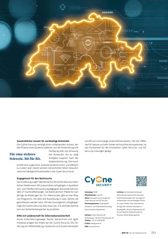 BEST OF Aus der Nachbarschaft BEST OF Portrait xxx 2312Gr%u00fcndung: 2018Mitarbeitende: rund 65Fokus: Konzepte und L%u00f6sungen f%u00fcr Cyber Security und IoT SecurityKernkompetenzen: Kryptografi e, Hardware- und Softwareentwicklung, Secure System EngineeringAdresse: CyOne Security AGHinterbergstr. 18, 6312 Steinhausen ZGTelefon: +41 41 748 85 00E-Mail: info@cyone.chWeb: www.cyone.chIn K%u00fcrze: Als f%u00fchrendes Schweizer Unternehmen bietet CyOne Securtity Sicherheitskonzepte und -l%u00f6sungen f%u00fcr umfassenden und nachhaltigen Schutz vor Cyber-Risiken. Das Unternehmen verf%u00fcgt %u00fcber h%u00f6chste Kompetenz in Kryptografi e, Security Engineering und Secure Systems Engineering bis zur h%u00f6chsten Geheimhaltungsstufe.Ganzheitlicher Ansatz f%u00fcr nachhaltige Sicherheit Die CyOne Security verfolgt einen umfassenden Ansatz, der alle Phasen eines Systems abdeckt: von der Entwicklung und Fertigung %u00fcber die Schulung der Anwender bis zu langfristigem Support nach der Implementierung. Die Kundschaft wird so geschult, dass die Systeme sicher und effi zient zu nutzen sind. Damit werden menschliche Fehler reduziert, was eine h%u00e4ufi ge Schwachstelle in der Cyber Security ist. Engagement f%u00fcr den Nachwuchs Die F%u00f6rderung junger Talente hat f%u00fcr die CyOne Security einen hohen Stellenwert. Mit praxisnahen Lehrg%u00e4ngen in Applikations- und Plattformentwicklung begegnet das Unternehmen dem IT-Fachkr%u00e4ftemangel. Sie bietet j%u00e4hrlich Pl%u00e4tze f%u00fcr vierj%u00e4hrige Ausbildungen an. F%u00fcr Maturanden gibt es das WayUp-Programm, mit dem die Ausbildung in zwei Jahren abgeschlossen werden kann. Mit den hauseigenen Lehrg%u00e4ngen tr%u00e4gt die CyOne Security aktiv dazu bei, die n%u00e4chste Generation von Sicherheitsexperten auszubilden. KMU mit Leidenschaft f%u00fcr InformationssicherheitKurze Entscheidungswege, flache Hierarchien und agile Prozesse pr%u00e4gen die Arbeit bei der CyOne Security. Die F%u00f6rderung von Weiterbildung, Austausch und Zusammenarbeit schafft eine einmalige Unternehmenskultur. Mit der Offenheit f%u00fcr Neues und sehr hohen technischen Kompetenzen ist das Fundament f%u00fcr die innovativen Cyber Security- und IoT Security-L%u00f6sungen gelegt.F%u00fcr eine sichere Schweiz. Bit f%u00fcr Bit.