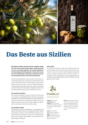 232 1 BEST OF BEST OF Portrait xxx Aus der NachbarschaftDas Beste aus SizilienInhaberin: Pina PernicanoProduktionsort: SizilienProdukte: Oliven%u00f6l, Limoncello, Arancello, Oliven, Oregano, Olivenpaste, Zitronenaufstrich und BitterorangenmarmeladeAdresse: Chiarello GmbHBahnhofstrasse 7, 6300 Zug ZGTelefon: +41 76 561 47 87E-Mail: info@olivenoel-chiarello.chWeb: www.olivenoel-chiarello.ch, www.sapori-chiarello.chIn K%u00fcrze: Seit Generationen erntet und veredelt der Familienbetrieb in Sizilien Oliven. Hochwertige Fr%u00fcchte werden innerhalb von wenigen Stunden in der %u00d6lm%u00fchle verarbeitet, um das Qualit%u00e4tsoliven%u00f6l %u00abChiarello Extravergine%u00bb zu erhalten. Olivenb%u00e4ume bl%u00fchen ab Ende April bis ungef%u00e4hr Anfang Juni. Gut vier bis sechs Monate sp%u00e4ter werden die Fr%u00fcchte, kurz vor der Reife, geerntet. So ist beste Qualit%u00e4t f%u00fcr ein hochwertiges Oliven%u00f6l garantiert. Dieses wird zusammen mit erfrischenden Limoncellos, Arancellos und weiteren Produkten exklusiv in die Schweiz importiert.Auf dem Familienbetrieb in Sizilien werden in der dritten Generation Oliven geerntet und veredelt. Die Olivenb%u00e4ume wachsen auf dem Gut der Familie. An bester Lage, unter der Sonne Siziliens. Geerntet wird erst, wenn der richtige Zeitpunkt ist, um das Beste aus den edlen Fr%u00fcchten zu holen. Je nach Klima ist dieser Zeitpunkt Ende Oktober, Anfang November. Dann kommt die Familie zusammen und hilft bei der Ernte mit. Der Geschmack Siziliens Sind die Oliven geerntet, kommen sie direkt in die %u00d6lm%u00fchle und werden zum Qualit%u00e4tsoliven%u00f6l %u00abChiarello Extravirgine%u00bb verarbeitet. Das Oliven%u00f6l beinhaltet drei verschiedenen Olivensorten und schmeckt fruchtig-mild. Es eignet sich hervorragend f%u00fcr die kalte und warme K%u00fcche. Sogar zum Backen kann es als Ersatz von Butter verwendet werden. Auserw%u00e4hlte Produkte Das Oliven%u00f6l ist in allen Globusfi lialen, in auserw%u00e4hlten Delikatess-Gesch%u00e4ften sowie im Onlineshop erh%u00e4ltlich. Neben dem %u00d6liven%u00f6l, welches in unterschiedlichen Gr%u00f6ssen und in edlen Flaschen daherkommt, gibt es vom Familienbetrieb auch Oliven, Oregano, Olivenpasten, Zitronenaufstrich und Bitterorangenmarmelade. Edle TropfenAls exklusiver Importeur bietet die Chiarello GmbH auch einen authentischen, edlen Limoncello und Arancello an. Die Fr%u00fcchte, welche f%u00fcr die erfrischenden Digestifs verwendet werden, wachsen ebenfalls unter der Sonne Siziliens. Limoncello und Arancello eignen sich hervorragend als erfrischender Verdauungslik%u00f6r, aber auch mit Sekt oder Mineral gespritzt f%u00fcr den Ap%u00e9ro.