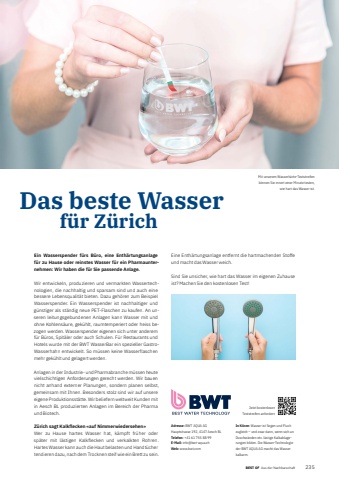 BEST OF Aus der Nachbarschaft BEST OF Portrait xxx 2351Das beste Wasser f%u00fcr Z%u00fcrichAdresse: BWT AQUA AGHauptstrasse 192, 4147 Aesch BLTelefon: +41 61 755 88 99E-Mail: info@bwt-aqua.chWeb: www.bwt.comIn K%u00fcrze: Wasser ist Segen und Fluch zugleich %u2013 und zwar dann, wenn sich an Duschw%u00e4nden etc. l%u00e4stige Kalkablagerungen bilden. Die Wasser-Technologie der BWT AQUA AG macht das Wasser kalkarm.Ein Wasserspender f%u00fcrs B%u00fcro, eine Enth%u00e4rtungsanlage f%u00fcr zu Hause oder reinstes Wasser f%u00fcr ein Pharmaunternehmen: Wir haben die f%u00fcr Sie passende Anlage.Wir entwickeln, produzieren und vermarkten Wassertechnologien, die nachhaltig und sparsam sind und auch eine bessere Lebensqualit%u00e4t bieten. Dazu geh%u00f6ren zum Beispiel Wasserspender. Ein Wasserspender ist nachhaltiger und g%u00fcnstiger als st%u00e4ndig neue PET-Flaschen zu kaufen. An unseren leitungsgebundenen Anlagen kann Wasser mit und ohne Kohlens%u00e4ure, gek%u00fchlt, raumtemperiert oder heiss bezogen werden. Wasserspender eigenen sich unter anderem f%u00fcr B%u00fcros, Spit%u00e4ler oder auch Schulen. F%u00fcr Restaurants und Hotels wurde mit der BWT WasserBar ein spezieller GastroWasserhahn entwickelt. So m%u00fcssen keine Wasserflaschen mehr gek%u00fchlt und gelagert werden. Anlagen in der Industrie- und Pharmabranche m%u00fcssen heute vielschichtigen Anforderungen gerecht werden. Wir bauen nicht anhand externer Planungen, sondern planen selbst, gemeinsam mit Ihnen. Besonders stolz sind wir auf unsere eigene Produktionsst%u00e4tte. Wir beliefern weltweit Kunden mit in Aesch BL produzierten Anlagen im Bereich der Pharma und Biotech.Z%u00fcrich sagt Kalkflecken %u00abauf Nimmerwiedersehen%u00bbWer zu Hause hartes Wasser hat, k%u00e4mpft fr%u00fcher oder sp%u00e4ter mit l%u00e4stigen Kalkflecken und verkalkten Rohren. Hartes Wasser kann auch die Haut belasten und Handt%u00fccher tendie ren dazu, nach dem Trocknen steif wie ein Brett zu sein. Eine Enth%u00e4rtungsanlage entfernt die hartmachenden Stoffe und macht das Wasser weich. Sind Sie unsicher, wie hart das Wasser im eigenen Zuhause ist? Machen Sie den kostenlosen Test!Mit unserem Wasserh%u00e4rte-Teststreifen k%u00f6nnen Sie innert einer Minute testen, wie hart das Wasser ist.Jetzt kostenlosen Teststreifen anfordern