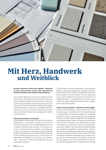 124 BEST OF BEST OF Portrait xxx %u00dcberregionalOb malen, tapezieren, lasieren oder vergolden %u2013 Idealmaler ist seit 11 Jahren Partner an Ihrer Seite. Neu bietet das Familienunternehmen auch kleinere Umbauarbeiten an. Vor 11 Jahren legte Fejza Pireva den Grundstein f%u00fcr Idealmaler. Mit dem Einstieg seines Sohnes Drilon, der 2018 nach seiner betriebswirtschaftlichen Ausbildung HF in das Unternehmen kam, entwickelte sich die Firma rasant weiter. Der Umzug nach D%u00fcbendorf in gr%u00f6ssere, professionell ausgestattete R%u00e4umlichkeiten markierte einen wichtigen Meilenstein. Fejza Pireva ist eher im Hintergrund t%u00e4tig. Heute ist Idealmaler ein etabliertes KMU mit acht festangestellten Malern und Handwerkern.Mit einem klaren Blick in die ZukunftStillstand gibt es bei Idealmaler nicht. Das Unternehmen will weiterwachsen %u2013 %u00abkontinuierlich und gesund%u00bb, wie Drilon Pireva betont. Idealmaler hat seine Gesch%u00e4ftsfelder dank seiner grossen Erfahrung im Bau erweitert. %u00abIch versetze mich immer in unsere Kundinnen und Kunden und %u00fcberlege, wie wir ihnen noch besser zur Seite stehen k%u00f6nnen. Gesamtl%u00f6sungen f%u00fcr Einfamilienh%u00e4user und kleinere Reihenfamilienh%u00e4user anzubieten, lag auf der Hand%u00bb, so Drilon Pireva. Ob Plattenlegen im Badezimmer, Trockenbau oder Parkettarbeiten %u2013 das Team um Drilon Pireva sorgt daf%u00fcr, dass alles reibungslos funktioniert. Mit Herz, Handwerk und WeitblickTrotz des Wachstums bleibt Idealmaler ein %u00fcberschaubarer Betrieb, in dem jeder Handgriff z%u00e4hlt. Die enge Zusammenarbeit im kleinen Team sorgt f%u00fcr eine pers%u00f6nliche und direkte Kommunikation mit der Kundschaft. %u00abWir sind stolz darauf, dass wir alle Auftr%u00e4ge mit der gleichen Leidenschaft und Sorgfalt behandeln %u2013 unabh%u00e4ngig von ihrer Gr%u00f6sse%u00bb, erkl%u00e4rt Drilon Pireva. Diese Philosophie schafft Vertrauen und garantiert konstant hohe Qualit%u00e4t.Farben, Formen, Fassaden %u2013 Idealmaler machts m%u00f6glichOb klassische Malerarbeiten, Tapezierarbeiten oder Fassadensanierungen %u2013 das erfahrene Team von Idealmaler sorgt f%u00fcr professionelle und %u00e4sthetische Ergebnisse. Sorgf%u00e4ltige Anstriche im Innen- und Aussenbereich, hochwertige Materialien und pr%u00e4zise Verarbeitung garantieren Langlebigkeit und Wertbest%u00e4ndigkeit. Neben der Beratung in der Wahl der Farbe und ihrer Art geh%u00f6ren auch spezialisierte L%u00f6sungen wie Vergoldung, Lasurtechniken, Spritzen und Dekorationsmalerei zum Angebot. Geschmackvolle Wandbekleidungen und fachgerecht ausgef%u00fchrte Tapezierarbeiten verleihen R%u00e4umen eine besondere Atmosph%u00e4re. Bei den Tapeten kann zwischen einer grosse Vielfalt an Farben, Strukturen, Papierund anderen Materialien ausgew%u00e4hlt werden, passend zum gew%u00fcnschten Einrichtungsstil. Auch Fassaden, die der Witterung ausgesetzt sind, werden fachm%u00e4nnisch saniert, indem Verschmutzungen, Risse und Moosbewuchs beseitigt