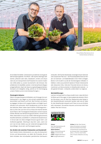 BEST OF %u00dcberregional 27BEST OF Portrait xxx 2Adresse:Gebr. Meier Gem%u00fcsekulturen AGFurthof 13, 8107 Buchs Weitere Standorte: D%u00e4llikon, Hinwil und Zurzach AGTelefon: +41 43 411 61 00E-Mail: info@gebruedermeier.chWeb: www.gebruedermeier.chIn K%u00fcrze: Die Gebr. Meier Gem%u00fcsekulturen AG produziert und verpackt %u00fcber 40 verschiedene frische Salate und Gem%u00fcsesorten ausschliesslich f%u00fcr den Schweizer Markt. Zu den Highlights z%u00e4hlen u. a. Pak Choi, Snack-Gurken, Cherry-Tomaten, Radieschen und Living Salad.Fritz und Markus Meier kennen sich mit frischem Gem%u00fcse und Salat aus. Anna%u2018s Best herstellen. Interessant zu erw%u00e4hnen ist die ganze Wertsch%u00f6pfungskette. Fritz Meier: %u00abWir kaufen Setzlinge oder Samen, pflanzen oder s%u00e4en, bew%u00e4ssern, ernten und verpacken sie und transportieren die Produkte mit unseren modernen LKWs selber zu unserer Kundschaft in der Schweiz. Die anfallenden Ernteabf%u00e4lle werden in die benachbarte Biogasanlage bef%u00f6rdert. Nach der Gewinnung des Biogases bleiben Kompost und %u00abG%u00e4rg%u00fclle%u00bb %u00fcbrig, welche wir f%u00fcr die D%u00fcngung unserer Felder zur%u00fcck in den Kreislauf bringen.%u00bbPioniergeist inklusive%u00dcblich sind geschlossene K%u00fchlketten vom Erzeuger bis zum Verbraucher in der Regel nur bei schnell verderblichen Lebensmitteln wie Fleisch und Fisch. Bei Fr%u00fcchten und Gem%u00fcse dagegen ist diese nicht vorgeschrieben und folglich auch oftmals nicht vorhanden. Nicht h%u00e4ufi g heisst nicht nie. Denn die Gebr%u00fcder Meier haben damit bereits 1998 begonnen %u2013 also zu einer Zeit, als man sich durchaus als Vision%u00e4r bereits einen Platz in den Firmengeschichtsb%u00fcchern sichern konnte. %u00abDieser Neubau war damals eine grosse Sache%u00bb, sinniert Fritz Meier. Besonders ist auch das 2008 in Betrieb genommene, fossilfrei beheizte und 40000 m2 umfassende Gew%u00e4chshaus in Hinwil oder die 2014 erfolgte Erneuerung der K%u00fchl- und Aufbereitungshalle. %u00dcberhaupt staunten Laien, wenn sie sich mal mit den Zahlen aus der Unternehmensgeschichte besch%u00e4ftigen. Da ist sehr viel Pioniergeist sp%u00fcrbar.Der direkte Link zwischen Produzenten und KundschaftDoch letzten Endes interessieren uns, also die Konsumentinnen und Konsumenten, vor allem die Produkte, die wir beim Anbieter des individuellen pers%u00f6nlichen Vertrauens ein kaufen. Ob frischer N%u00fcsslisalat, knackiges Snack-Gem%u00fcse oder asiatischer Pak Choi %u2013 die Produktepalette l%u00e4sst die Herzen von Gem%u00fcse- und Salatliebhaber:innen h%u00f6her schlagen. Bisher nicht erw%u00e4hnt wurde der familieneigene Hofladen in D%u00e4llikon. Unter www.erlenhof-laedeli.ch fi nden Interessierte alle relevanten Infos. Viele der Produkte k%u00f6nnen die Konsumentinnen und Konsumenten im Detailhandel national %u2013 in der ganzen Schweiz %u2013 einkaufen, andere eben nur regional.Betriebsf%u00fchrungenLast but not least darf durchaus erw%u00e4hnt sein, dass die Familie Meier auch F%u00fchrungen im Gem%u00fcsebetrieb anbietet. M%u00f6chten Sie wissen, wie z. B. Pak Choi, Radieschen oder Salate in den Gew%u00e4chsh%u00e4usern produziert werden oder wie ein Salat f%u00fcr den Detailhandel verpackt wird? Dann ist so ein Einblick sehr interessant. Sie werden staunen und einmal mehr feststellen: Man lernt nie aus.