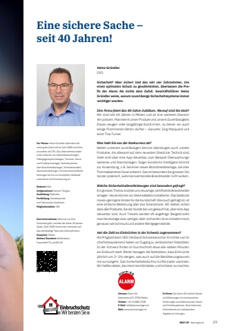 BEST OF BEST OF %u00dcberregional Interview 292Adresse: Alarm AGSeestrasse 631, 8706 MeilenTelefon: +41 43 888 22 88E-Mail: info@alarmanlagen.chWeb: www.alarmanlagen.chIn K%u00fcrze: Die Alarm AG sch%u00fctzt H%u00e4user und Wohnungen mit mechanischen Sicherungen und elektronischen Alarmund Zutrittssystemen. Dazu bietet das Unternehmen ein umfassendes Angebot an L%u00f6sungen. Zur Person: Heinz Gr%u00fcndler %u00fcbernahm die Leitung der Alarm AG im Jahr 2000 und f%u00fchrt sie seither als CEO. Das Unternehmen bietet unter anderem von Video%u00fcberwachungen, Videogegensprechanlagen, Tresoren, Alarmund Funkalarmanlagen, Notrufsystemen %u00fcber Brandmeldeanlagen, Sicherheitsnebel, Alarmaufschaltungen mit Interventionsdienstleistungen bis hin zur kompletten Geb%u00e4udeautomation mit Visualisierung an.Wohnort: R%u00fctiAufgewachsen: Kanton ThurgauAusbildung: ElektrikerFortbildung: Handelsschule und Technischer KaufmannMitgliedschaften: SESZum Unternehmen: Wenn es um Ihre Sicherheit geht, versteht die Alarm AG keinen Spass. %u00dcber 4500 Kund:innen vertrauen auf das zehnk%u00f6pfi ge Team des Unternehmens.Hauptsitz: MeilenWeitere Standorte: Neftenbach, Frauenfeld TG und Wil SGHeinz Gr%u00fcndlerCEOSicherheit? Aber sicher! Und das seit vier Jahrzehnten. Um einen optimalen Schutz zu gew%u00e4hrleisten, %u00fcberlassen die Profi s der Alarm AG nichts dem Zufall. Gesch%u00e4ftsf%u00fchrer Heinz Gr%u00fcndler weiss, warum zuverl%u00e4ssige Sicherheitssysteme immer wichtiger werden.Ihre Firma feiert das 40-Jahre-Jubil%u00e4um. Worauf sind Sie stolz?Wir sind seit 40 Jahren in Meilen und an drei weiteren Standorten pr%u00e4sent. Man kennt unser Produkt und unsere Zuverl%u00e4ssigkeit. Davon zeugen viele langj%u00e4hrige Kund:innen, zu denen wir auch einige Prominente z%u00e4hlen d%u00fcrfen %u2013 darunter J%u00fcrg Marquard und einst Tina Turner. Was hebt Sie von der Konkurrenz ab?Neben unserem zuverl%u00e4ssigen Service %u00fcberzeugen auch unsere Produkte, die allesamt auf dem neuesten Stand der Technik sind. Viele sind %u00fcber eine App steuerbar, zum Beispiel %u00dcberwachungskameras und Alarmanlagen. Sogar k%u00fcnstliche Intelligenz kommt zur Anwendung, z. B. bei einer neuen Brandmeldeanlage, die %u00fcber Thermalkameras Feuer erkennt. Das ist besonders bei grossen Distanzen praktisch, wenn konventionelle Brandmelder nicht wirken.Welche Sicherheitsdienstleistungen sind besonders gefragt?Ein grosses Thema sind bei uns neuartige, zertifi zierte Brandmeldeanlagen. Heute k%u00f6nnen wir diese kabellos installieren. Das bedeutet massiv geringere Kosten f%u00fcr die Kundschaft. Was auch gefragt ist, ist eine einfache Bedienung %u00fcber das Smartphone. Wir stellen sicher, dass alle Produkte, die der Kunde bei uns gekauft hat, %u00fcber eine App steuerbar sind. Auch Tresore werden oft angefragt. Bargeld sieht man heutzutage zwar weniger, aber vorhanden ist es trotzdem noch, genauso wie Schmuck und andere Wertgegenst%u00e4nde.Hat die Zahl an Einbr%u00fcchen in der Schweiz zugenommen?Als Mitglied beim SES (Verband Schweizerischer Errichter von Sicherheitssystemen) haben wir Zugang zu verl%u00e4sslichen Statistiken. In der Schweiz fi ndet im Durchschnitt etwa alle sieben Minuten ein Einbruch statt. Weiter besagen die Statistiken, dass Einbr%u00fcche j%u00e4hrlich um 2 %u2013 3 % steigen, was auch auf die Bev%u00f6lkerungszunahme zur%u00fcckgeht. Das Sicherheitsbed%u00fcrfnis d%u00fcrfte daher wachsen. Wir helfen dabei, das Heim komfortabler und sicherer zu machen.Eine sichere Sache %u2013 seit 40 Jahren!