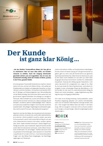130 BEST OF BEST OF Portrait xxx %u00dcberregionalDer Kunde ist ganz klar K%u00f6nig ...... bei der Dietiker Treuhandfi rma Rebex AG. Das gilt es zu relativieren: Man tut zwar alles daf%u00fcr, um Kundenw%u00fcnsche zu erf%u00fcllen. Doch der Umgang miteinander geschieht ehrlich und auf Augenh%u00f6he: Das ist man der Kundschaft schuldig, damit der Frieden im Reich, pardon, in der Firma, gewahrt bleibt.%u00abIn einer grossen Treuhandfi rma Karriere zu machen, interessierte mich nie%u00bb, erinnert sich Alfons Florian. %u00abIch wollte den Direktkontakt zum lokalen und regionalen Gewerbe, zu Unternehmern und ihren Familien.%u00bb So machte er sich bereits 1997, als 27-j%u00e4hriger und fr%u00fchestm%u00f6glicher dipl. Wirtschaftpr%u00fcfer, mit der Rebex AG t%u00e4tig. Doch die ersten Jahre waren hart: Aufgrund seiner Jugend schenkten ihm anfangs nur wenige ihr Vertrauen. Wers trotzdem tat, wurde nicht entt%u00e4uscht: %u00abMein erster Kunde ist immer noch bei uns.%u00bb War er anfangs %u00abEinzelk%u00e4mpfer%u00bb, so leitet er jetzt ein sieben k%u00f6pfi ges Team. %u00abWachstum w%u00e4re zwar problemlos m%u00f6glich. Doch darunter w%u00fcrde die Qualit%u00e4t leiden. Wir pflegen langfristige Kundenbeziehungen. Das macht unsere Firma aus.%u00bb Was bedeutet das genau?Nat%u00fcrlich sind bei der Rebex AG treuh%u00e4nderische Kernkompetenzen zentral, um Kundinnen und Kunden optimal betreuen zu k%u00f6nnen. %u00abDoch zus%u00e4tzlich musst Du wissen, was seine Firma ausmacht, was f%u00fcr die Kundschaft wichtig ist und was nicht. Diese Kenntnis kommt nicht sofort, sondern w%u00e4chst %u00fcber Jahre. Dabei entsteht Vertrauen.%u00bb Dieser Begriff wird h%u00e4ufi g verwendet, was er bedeutet, zeigt sich konkret als Resultat: Weil ihm die Kunden vertrauen, %u00abdarf%u00bb Alfons Florian einen direktiveren Ton anschlagen: %u00abStehen die Kund:innen vor gr%u00f6sseren Entscheidungen, dann %u00e4ussere ich meine Meinung %u2039W%u00fcrde ich tun oder nicht tun%u203a.%u00bb Auch bei existenziellen Fragen wird das Rebex-Team beigezogen, bei Nachfolgeregelungen und Testament.%u00abViele Unternehmer hoffen auf familieninterne Nachfolge.%u00bb Ob das immer die beste L%u00f6sung ist? %u00abDa gute Antworten zu geben, geht nur wenn man die Familie kennt und gleichzeitig emotionale Distanz hat. %u00dcbernimmt der Nachwuchs, weil es den Eltern einen Gefallen tun will oder aus voller %u00dcberzeugung?%u00bb Da schaut man kritisch-n%u00fcchtern hin, bleibt dabei empathisch. Etwa bei der Abfassung des Testaments: %u00ab%u2039Ich weiss, das kommt Dir unangenehm vor%u203a, sage ich da. %u2039Aber Du tust was Gutes f%u00fcr Deine Nachkommen, verhinderst Uneinigkeit in einer schwierigen Phase der Betroffenen.%u203a%u00bb F%u00fcr die Kunden ist man auch im unternehmerischen Alltag da. Dieser wird immer komplexer %u2013 wegen Digitalisierung, %u00dcberregulierung und Umgang mit Beh%u00f6rden. %u00abF%u00fcr Laien ist es h%u00e4ufi g schwierig, nachzuvollziehen, wieso Prozesse langwierig ablaufen und welche Schnittstellen, wann und mit welchen Informationen versorgt werden m%u00fcssen.%u00bb Hier fungiert das Rebex-Team als Felsen in der Brandung. %u00abWir tun das gerne. Und zwar nicht nur heute, sondern auch morgen und %u00fcbermorgen. Alles f%u00fcr langfristige Kundenbeziehungen.%u00bbAdresse: Rebex AGZentralstrasse 19, 8953 DietikonGesch%u00e4ftsstelle Z%u00fcrich:Baumackerstrasse 24, 8050 Z%u00fcrichTelefon: +41 44 744 76 76E-Mail: info@rebex.chWeb: www.rebex.chIn K%u00fcrze: %u00dcber 25 Jahre ber%u00e4t das Team von und mit Gesch%u00e4ftsf%u00fchrer Alfons Florian seine Kundschaft in s%u00e4mtlichen fi nanziellen und (steuer-)rechtlichen Belangen. Die in Dietikon ans%u00e4ssige Rebex AG ist eine klassische Treuhandund Revisionsgesellschaft, die mit langj%u00e4hriger Erfahrung und breiter, fundierter Ausbildung auf alle Treuhandfragen die passenden Antworten bereit h%u00e4lt.
