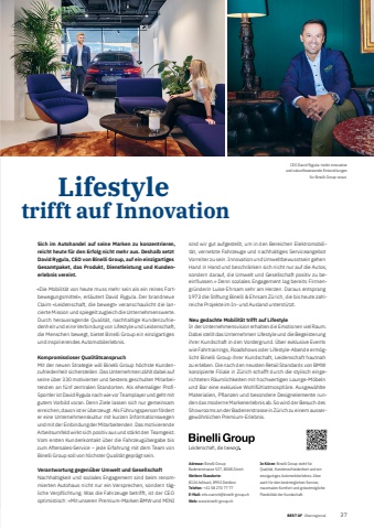 BEST OF BEST OF %u00dcberregional Portrait xxx 374 Lifestyle trifft auf InnovationSich im Autohandel auf seine Marken zu konzentrieren, reicht heute f%u00fcr den Erfolg nicht mehr aus. Deshalb setzt David Rygula, CEO von Binelli Group, auf ein einzigartiges Gesamtpaket, das Produkt, Dienstleistung und Kundenerlebnis vereint.%u00abDie Mobilit%u00e4t von heute muss mehr sein als ein reines Fortbewegungsmittel%u00bb, erl%u00e4utert David Rygula. Der brandneue Claim %u00abLeidenschaft, die bewegt%u00bb veranschaulicht die lancierte Mission und spiegelt zugleich die Unternehmenswerte. Durch herausragende Qualit%u00e4t, nachhaltige Kundenzufriedenheit und eine Verbindung von Lifestyle und Leidenschaft, die Menschen bewegt, bietet Binelli Group ein einzigartiges und inspirierendes Automobilerlebnis.Kompromissloser Qualit%u00e4tsanspruchMit der neuen Strategie will Binelli Group h%u00f6chste Kundenzufriedenheit sicherstellen. Das Unternehmen z%u00e4hlt dabei auf seine %u00fcber 330 motivierten und bestens geschulten Mitarbeitenden an f%u00fcnf zentralen Standorten. Als ehemaliger Profi -Sportler ist David Rygula nach wie vor Teamplayer und geht mit gutem Vorbild voran. Denn Ziele lassen sich nur gemeinsam erreichen, davon ist er %u00fcberzeugt. Als F%u00fchrungsperson f%u00f6rdert er eine Unternehmenskultur mit kurzen Informationswegen und mit der Einbindung der Mitarbeitenden. Das motivierende Arbeitsumfeld wirkt sich positiv aus und st%u00e4rkt den Teamgeist. Vom ersten Kundenkontakt %u00fcber die Fahrzeug%u00fcbergabe bis zum Aftersales-Service %u2013 jede Erfahrung mit dem Team von Binelli Group soll von h%u00f6chster Qualit%u00e4t gepr%u00e4gt sein.Verantwortung gegen%u00fcber Umwelt und GesellschaftNachhaltigkeit und soziales Engagement sind beim renommierten Autohaus nicht nur ein Versprechen, sondern t%u00e4gliche Verpflichtung. Was die Fahrzeuge betrifft, ist der CEO optimistisch: %u00abMit unseren Premium-Marken BMW und MINI Adresse: Binelli GroupBadenerstrasse 527, 8048 Z%u00fcrichWeitere Standorte:8134 Adliswil, 8953 DietikonTelefon: +41 58 270 77 77E-Mail: info.zuerich@binelli-group.chWeb: www.binelli-group.chIn K%u00fcrze: Binelli Group steht f%u00fcr Qualit%u00e4t, Kundenzufriedenheit und ein einzigartiges Automobilerlebnis. Aber auch f%u00fcr den bestm%u00f6glichen Service, maximalen Komfort und gr%u00f6sstm%u00f6gliche Flexibilit%u00e4t der Kundschaft.sind wir gut aufgestellt, um in den Bereichen Elektromobilit%u00e4t, vernetzte Fahrzeuge und nachhaltiges Serviceangebot Vorreiter zu sein. Innovation und Umweltbewusstsein gehen Hand in Hand und beschr%u00e4nken sich nicht nur auf die Autos, sondern darauf, die Umwelt und Gesellschaft positiv zu beeinflussen.%u00bb Denn soziales Engagement lag bereits Firmengr%u00fcnderin Luise Ehrsam sehr am Herzen. Daraus entsprang 1973 die Stiftung Binelli & Ehrsam Z%u00fcrich, die bis heute zahlreiche Projekte im In- und Ausland unterst%u00fctzt.Neu gedachte Mobilit%u00e4t trifft auf LifestyleIn der Unternehmensvision erhalten die Emotionen viel Raum. Dabei stellt das Unternehmen Lifestyle und die Begeisterung ihrer Kundschaft in den Vordergrund. %u00dcber exklusive Events wie Fahrtrainings, Roadshows oder Lifestyle-Abende erm%u00f6glicht Binelli Group ihrer Kundschaft, Leidenschaft hautnah zu erleben. Die nach den neusten Retail Standards von BMW konzipierte Filiale in Z%u00fcrich schafft durch die stylisch eingerichteten R%u00e4umlichkeiten mit hochwertigen Lounge-M%u00f6beln und Bar eine exklusive Wohlf%u00fchlatmosph%u00e4re. Ausgew%u00e4hlte Materialien, Pflanzen und besondere Designelemente runden das moderne Markenerlebnis ab. So wird der Besuch des Showrooms an der Badenerstrasse in Z%u00fcrich zu einem aussergew%u00f6hnlichen Premium-Erlebnis.CEO David Rygula: treibt innovative und zukunftsweisende Entwicklungen f%u00fcr Binelli Group voran.