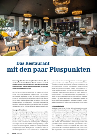 144 BEST OF BEST OF Portrait xxx Stadt Z%u00fcrich Das Restaurant mit den paar PluspunktenNur wenige Schritte vom Hauptbahnhof entfernt, l%u00e4dt einer der innovativsten Italiener Z%u00fcrichs nicht nur zu Tisch, sondern auch zu Tanz. Im LEO, hoch %u00fcber den D%u00e4chern der Bahnhofstrasse, werden die Gaumenfreuden mit etlichen weiteren Attraktionen erg%u00e4nzt.Im M%u00e4rz 2025 durfte das Ristorante LEO bereits f%u00fcr seinen dritten Geburtstag die Korken knallen lassen. Das Lokal auf dem Rooftop des Globus hat sich dank seiner modern interpretierten italienischen K%u00fcche bestens in der Z%u00fcrcher Gastronomie-Szene etabliert. Es sind aber bei weitem nicht nur die hausgemachten Pane, Pasta und Pasticcerie, die sorgf%u00e4ltig kuratierte Kollektion an italienischen Weinen und die exklusive Lage, dank denen sich das LEO einen Namen gemacht hat. Unvergessliche AbendeDa w%u00e4ren auch die originellen Signature Cocktails und beliebte Drink-Klassiker, die der Barkeeper hinter dem Tresen zaubert. Am Donnerstag laden sie, begleitet von einem reichhaltigen Ap%u00e9ro-Buffet, dazu ein, das Wochenende in lockerer Runde einzul%u00e4uten. Und am Freitag und Samstag kann im LEO mit einem Cocktail in der Hand sogar das Tanzbein geschwungen werden. Dann steht n%u00e4mlich regelm%u00e4ssig %u00abDinner & Dance%u00bb auf dem Programm. Mit diesem Konzept kombiniert Gastgeberin Suzanna Wolff gekonnt ein sch%u00f6nes Abendessen mit ausgelassenem Feiern zu toller Musik. Nachdem die G%u00e4ste ein Menu inklusive S%u00fcssgetr%u00e4nk zu einem Vorzugspreis genossen haben oder sich durch die Speisekarte schlemmen konnten, r%u00e4umt das Personal das moderne und dennoch gem%u00fctliche Mobiliar zur Seite. Der %u00dcbergang in die anschliessende Veranstaltung ist nahezu nahtlos. Schon steht ein DJ hinter den Plattentellern und die Show kann beginnen. %u00abBei uns sorgen Dragqueens oder Afro-House DJs in Begleitung von speziellen Lichtspektakeln f%u00fcr ein unvergessliches Erlebnis, es werden aber auch Hiphop-Hits und Disco-Klassiker gespielt %u2013 f%u00fcr jeden Geschmack ist etwas dabei%u00bb, erz%u00e4hlt Suzanna Wolff. Selbstverst%u00e4ndlich ist es auch m%u00f6glich, erst am sp%u00e4ten Abend ins LEO zu kommen, ohne vorher hier zu essen.Saisonale Italianit%u00e0Das Lokal mitten an der Z%u00fcrcher Bahnhofstrasse ist nicht nur zu sp%u00e4ter Stunde der place to be. Am Mittag treffen sich Gesch%u00e4ftsleute aus den umliegenden B%u00fcros zum Business lunch oder Freundinnen legen hier eine Pause von ihrer Shoppingtour in Z%u00fcrich ein. Selbst ganze Unternehmen lassen sich gerne im LEO verw%u00f6hnen. Das zentral gelegene Restaurant mit der grossz%u00fcgigen Aussenterrasse ist f%u00fcr Firmenfeiern sehr beliebt. %u00abWir offerieren an Events Flying Dinners oder gesetzte Dinners und reservieren das gesamte Lokal exklusiv f%u00fcr den Anlass%u00bb, erz%u00e4hlt Suzanna Wolff. Was allen G%u00e4sten gemeinsam ist? Sie sch%u00e4tzen die Kochk%u00fcnste von K%u00fcchenchef Diego Iuliani. Gemeinsam mit seinem Team ist er f%u00fcr die