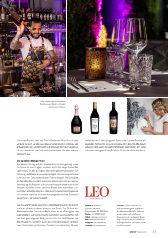 BEST OF Stadt Z%u00fcrich 45BEST OF Portrait xxx 2Adresse: Ristorante LEOc/o Globus 5th FloorSchweizergasse 11, 8001 Z%u00fcrichTelefon: +41 44 504 83 84E-Mail: info@ristorante-leo.chWeb: www.ristorante-leo.chInstagram: leo.ristorante.barFacebook: leo-ristorante.barIn K%u00fcrze: Das Ristorante LEO h%u00e4lt nicht nur hervorragende Speisen aus der italienischen K%u00fcche f%u00fcr Sie bereit, sondern bietet auch tolle Events. Dinnerpartys mit musikalischer Begleitung %u2013 von House bis Soul %u2013 bieten ein einmaliges Erlebnis. Denn wieso Dinner und Party trennen?Gourmet-Pizzen, den am Tisch fi letierten Branzino al sale und die s%u00fcssen S%u00fcnden wie das unvergessliche Tiramisu verantwortlich. Der Spitzenkoch legt grossen Wert auf Saisonalit%u00e4t und wechselt deshalb alle drei Monate die Menuekarte komplett aus. Die spezielle Design-NoteF%u00fcr Abwechslung auf der Speisekarte ist also gesorgt. Aber nicht nur f%u00fcr den Magen, sondern auch f%u00fcrs Auge bietet das LEO etwas. In der quirligen, aber sehr geschmackvollen Einrichtung und Dekoration widerspiegelt sich der exquisite Geschmack von Gesch%u00e4ftsinhaber Franco Napoli. Die Gem%u00e4lde an den W%u00e4nden des LEO stammen allerdings nicht aus seiner Sammlung. Es handelt sich um wechselnde Werke verschiedenster K%u00fcnstler:innen, die ihre Bilder hier ausstellen und zum Kauf anbieten k%u00f6nnen. %u00abWie durch Zauberhand f%u00fcgen sie sich immer nahtlos in unser aussergew%u00f6hnliches InterieurDesign ein%u00bb, so Suzanna Wolff. Die Kunstaffi nit%u00e4t des Z%u00fcrcher Erfolgsgastronomen zeigt sich auch an einem anderen Hotspot der Stadt. Im Globus am Bellevue ist das Don Leone Bella Vista zur %u00abLa Famiglia%u00bb hinzugestossen. Die einheimische K%u00fcnstlerin Ginny Litscher hat mit ihrer ganz eigenen Bildsprache nicht nur die Etiketten der Weinflaschen, sondern auch die Innendekoration versch%u00f6nert. Die farbenspr%u00fchenden floralen und tierischen Muster verleihen auch dem j%u00fcngsten Spross der Leone-Familie ein poppiges Ambiente. So wird ein Besuch in den mediterranen Lokalen hoch %u00fcber der Bahnhofstrasse oder direkt am Bellevue zum unvergesslichen Erlebnis f%u00fcr so ziemlich alle Sinne.Ginny Litscher (rechts) versch%u00f6nert Etiketten sowie W%u00e4nde mit floralen und tierischen Mustern.
