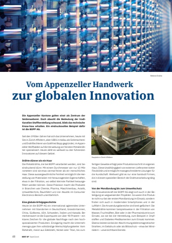 148 BEST OF BEST OF Portrait xxx Stadt Z%u00fcrich Vom Appenzeller Handwerk zur globalen InnovationDie Appenzeller Kantone galten einst als Zentrum der Seidenweberei. Doch obwohl die Bedeutung der traditionellen Stoffherstellung schwand, blieb das technische Know-how erhalten. Ein eindrucksvolles Beispiel daf%u00fcr ist die BOPP AG.Seit den 1950er-Jahren hat sich das Unternehmen, heute mit Sitz in Z%u00fcrich Affoltern, aber 1881 in Hallau als Siebmacherei und Drahtflechterei von Gottfried Bopp gegr%u00fcndet, im Appenzeller Wolfhalden auf die Verwebung von feinsten Metalldr%u00e4hten spezialisiert. Heute z%u00e4hlt es weltweit zu den f%u00fchrenden Innovatoren auf diesem Gebiet.Dr%u00e4hte d%u00fcnner als ein HaarDie Metalldr%u00e4hte, die bei BOPP verarbeitet werden, sind beeindruckend d%u00fcnn: Mit einem Durchmesser von nur 13 Mikrometern sind sie etwa viermal feiner als ein menschliches Haar. Diese aussergew%u00f6hnliche Feinheit erm%u00f6glicht die Herstellung von Materialien mit herausragenden Eigenschaften, etwa in der Filtration, wo selbst kleinste Partikel herausgefi ltert werden k%u00f6nnen. Diese Pr%u00e4zision macht die Produkte in Branchen wie Chemie, Pharma, Maschinenbau, Aviatik, Umwelttechnik, Raumfahrt und der Akustik im Consumer Electronics-Bereich unentbehrlich.Eine globale ErfolgsgeschichteHeute ist die BOPP AG ein international agierendes Unternehmen mit Standorten in Deutschland, Grossbritannien, China, S%u00fcdkorea, USA, Schweden, Italien und Kanada. Bemerkenswert ist die Exportquote von %u00fcber 90 Prozent %u2013 ein klares Zeichen f%u00fcr die globale Nachfrage nach den hochspezialisierten Produkten. Einzigartig macht die Unternehmensgruppe ihre vollst%u00e4ndige Wertsch%u00f6pfungskette: Vom Rohdraht, meist aus Edelstahl, Nickel oder Titan, bis zum fertigen Gewebe erfolgt jeder Produktionsschritt im eigenen Haus. Diese Unabh%u00e4ngigkeit von externen Lieferanten bietet Flexibilit%u00e4t und erm%u00f6glicht massgeschneiderte L%u00f6sungen f%u00fcr die Kundschaft. Weltweit gibt es nur eine handvoll Firmen, die in diesem speziellen Bereich der Drahtverarbeitung t%u00e4tig sind.Von der Mondlandung bis zum UmweltschutzDie Innovationskraft der BOPP AG zeigt sich auch in der Beteiligung an wegweisenden Projekten. So waren ihre Produkte nicht nur bei der ersten Mondlandung im Einsatz, sondern fi nden sich auch in modernsten Smartphones und in der Luftfahrt. Die Anwendungsbereiche sind breit gef%u00e4chert: Die Metalldr%u00e4hte kommen beispielsweise in der Filtration von Wasser, Fruchts%u00e4ften, Bier oder in der Pharmaindustrie zum Einsatz, wo sie bei der Herstellung, zum Beispiel in Impfstoffen und Diabetes-Medikamenten zum Einsatz kommen. Ebenso leisten sie bei der Abschirmung elektromagnetischer Strahlen, im Siebdruck oder als Blitzschutz %u2013 etwa bei Windr%u00e4dern %u2013 unverzichtbare Dienste.Weberei Dr%u00e4hteHauptsitz in Z%u00fcrich Affoltern